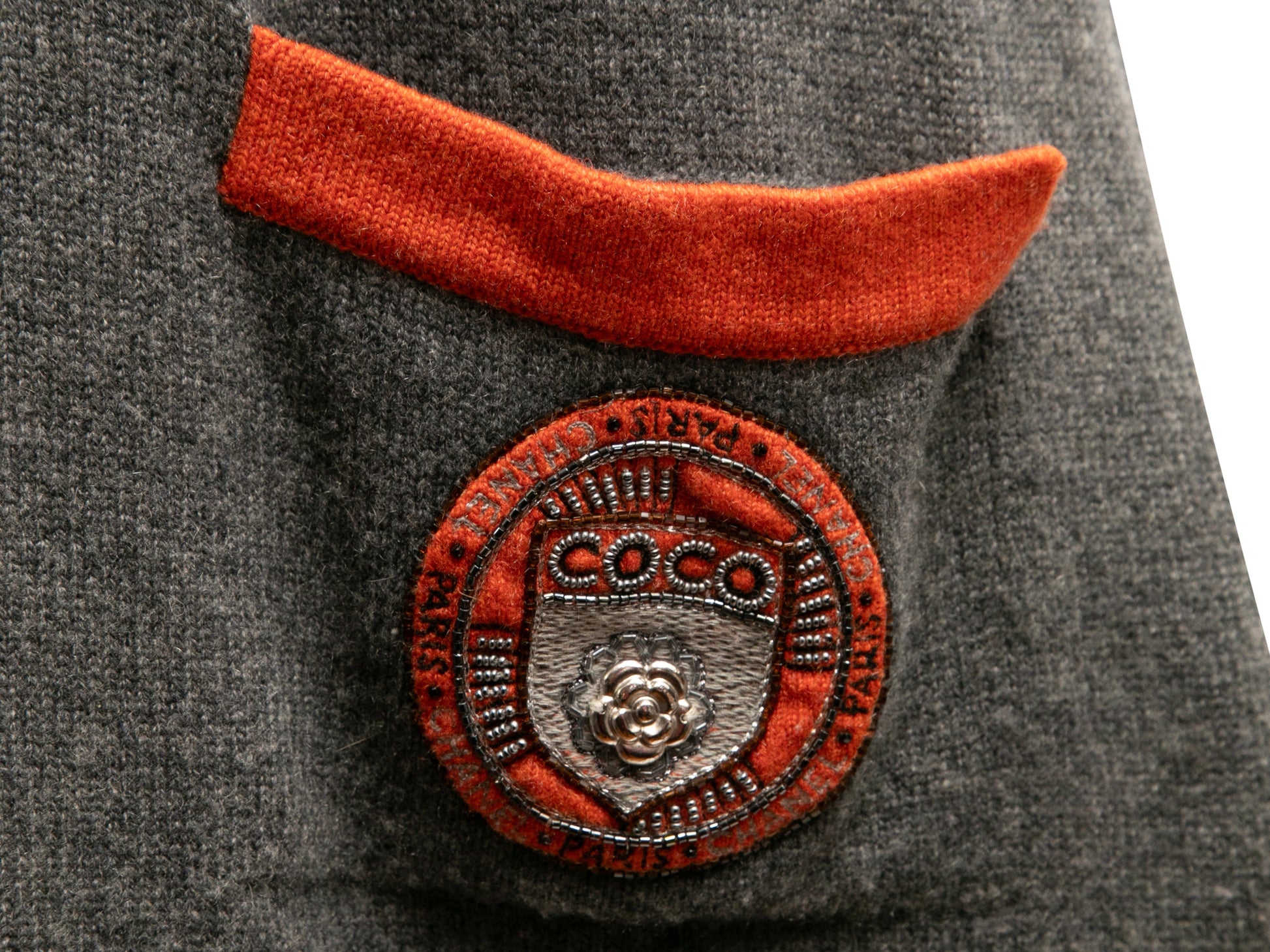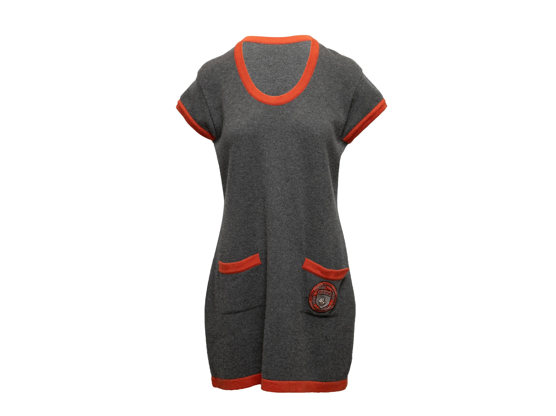 Product Details:Grey and orange cashmere knit dress by Chanel. Scoop neck. Short sleeves. Dual front pockets featuring crest detail. 38" bust, 36" waist, 33.5" length, 15" shoulder width.