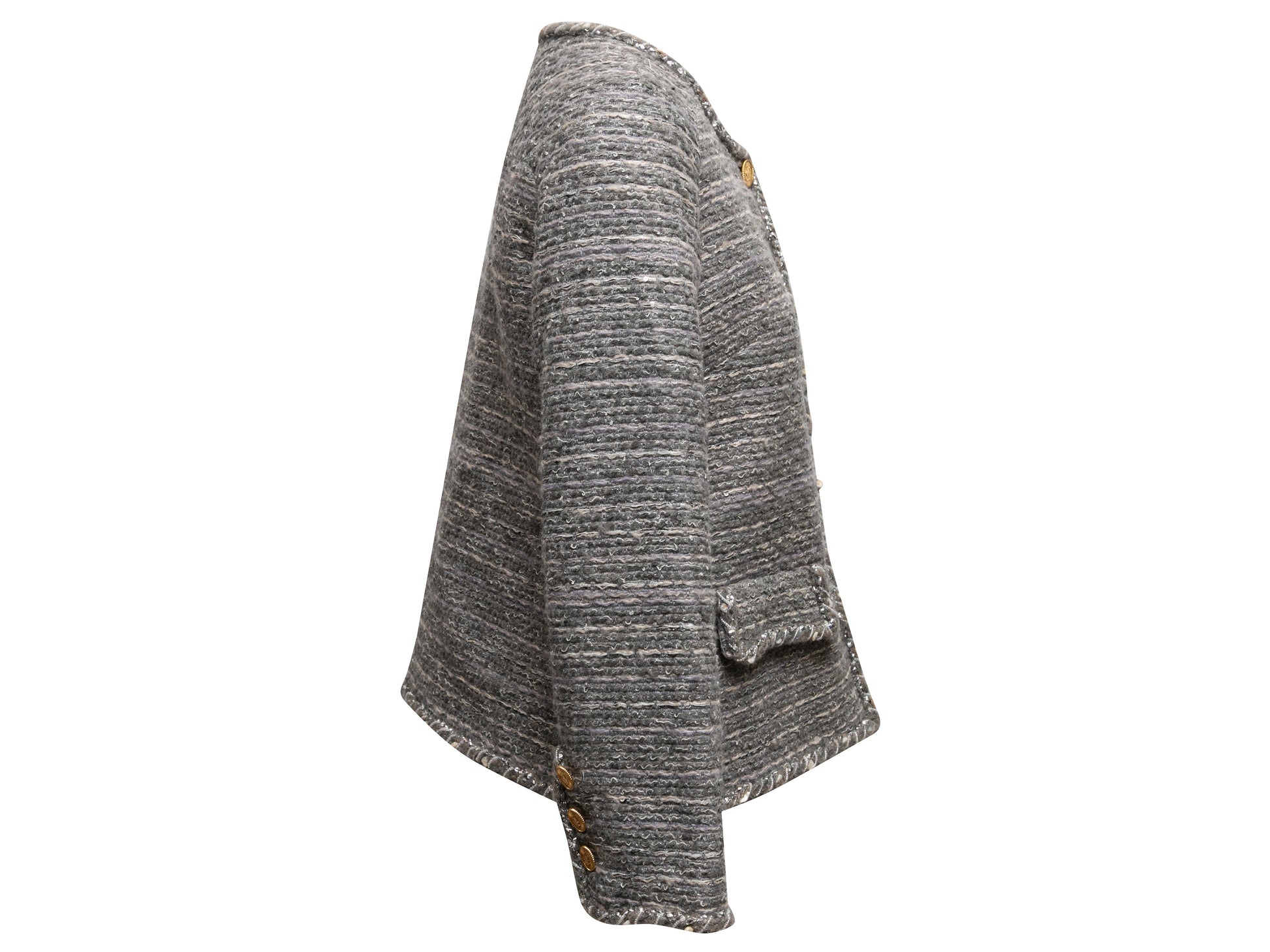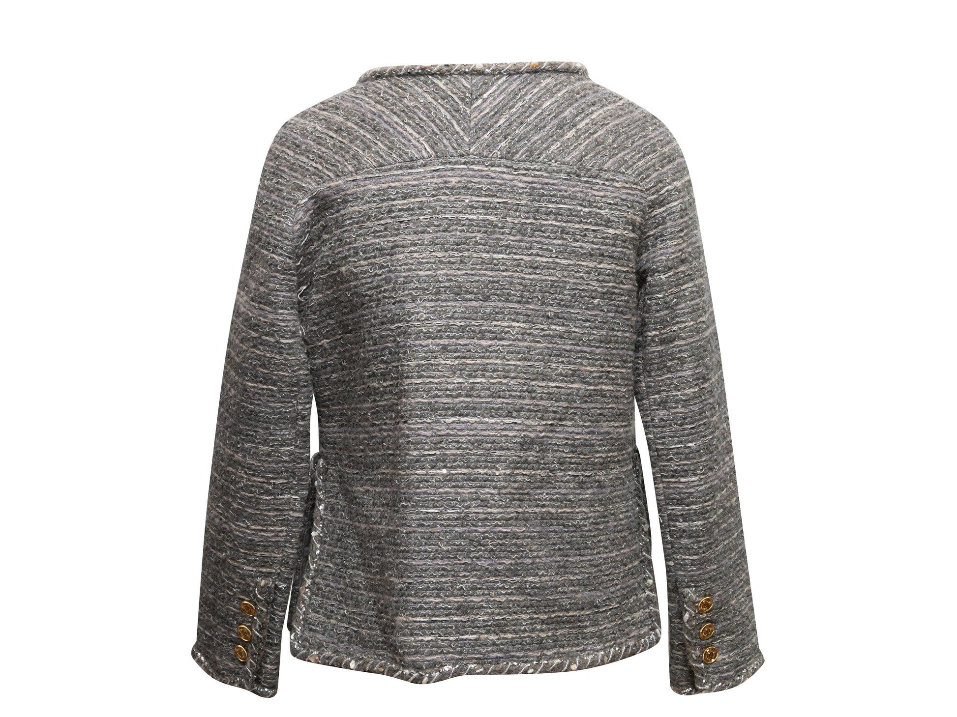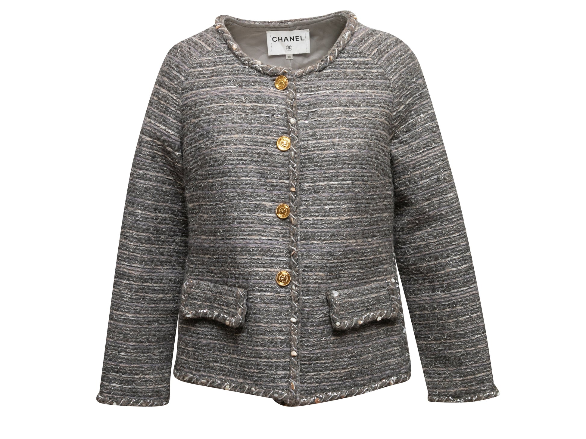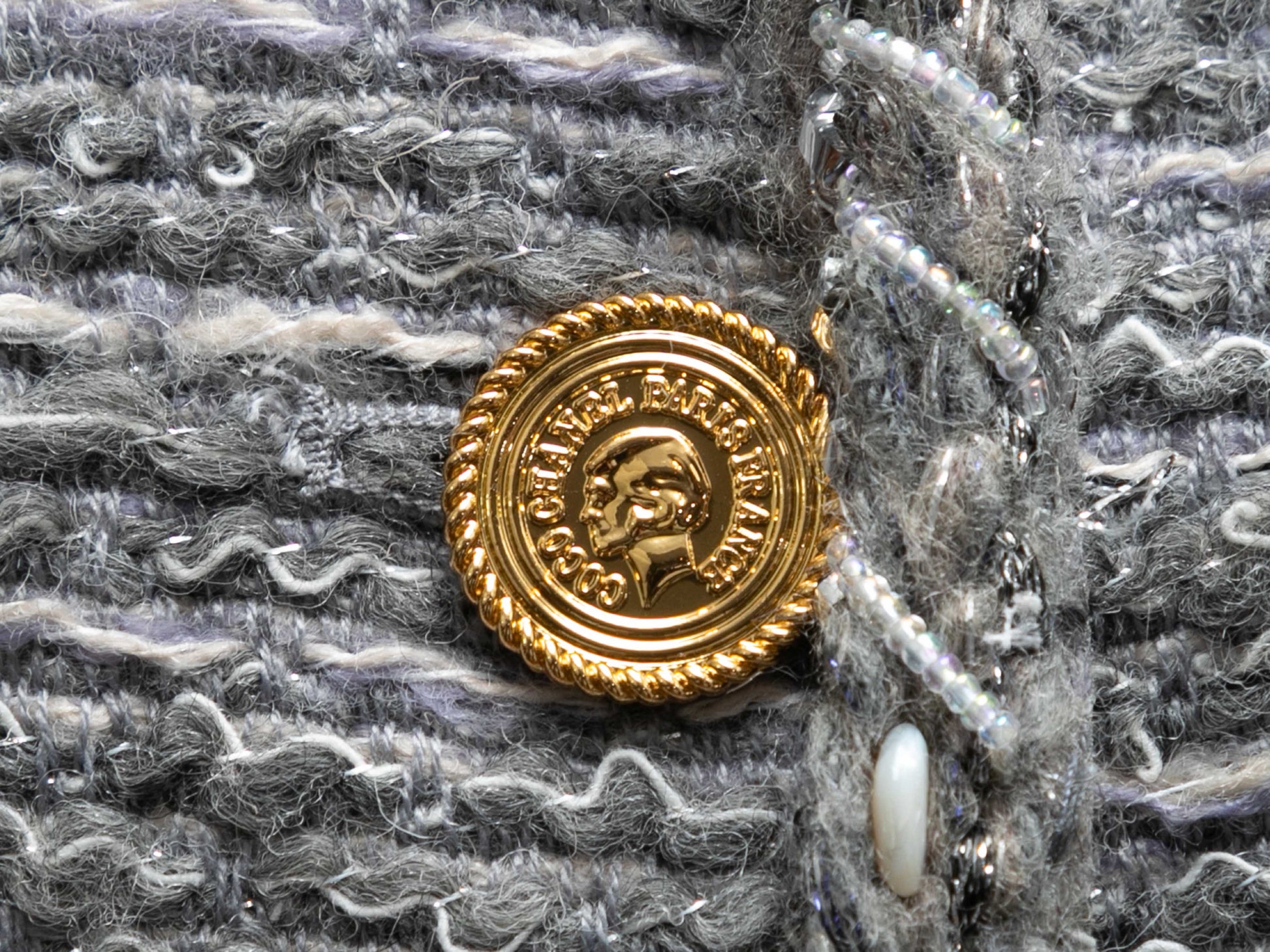 Product Details: Grey and silver cotton tweed collarless jacket by Chanel. Crew neck. Dual hips pockets. Gold-tone front button closures. 36" bust, 16" shoulder width, 21" sleeve length, 23" length.
