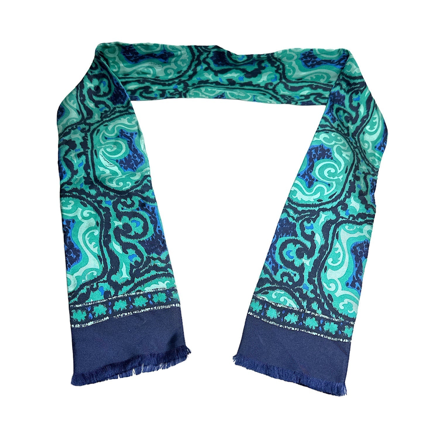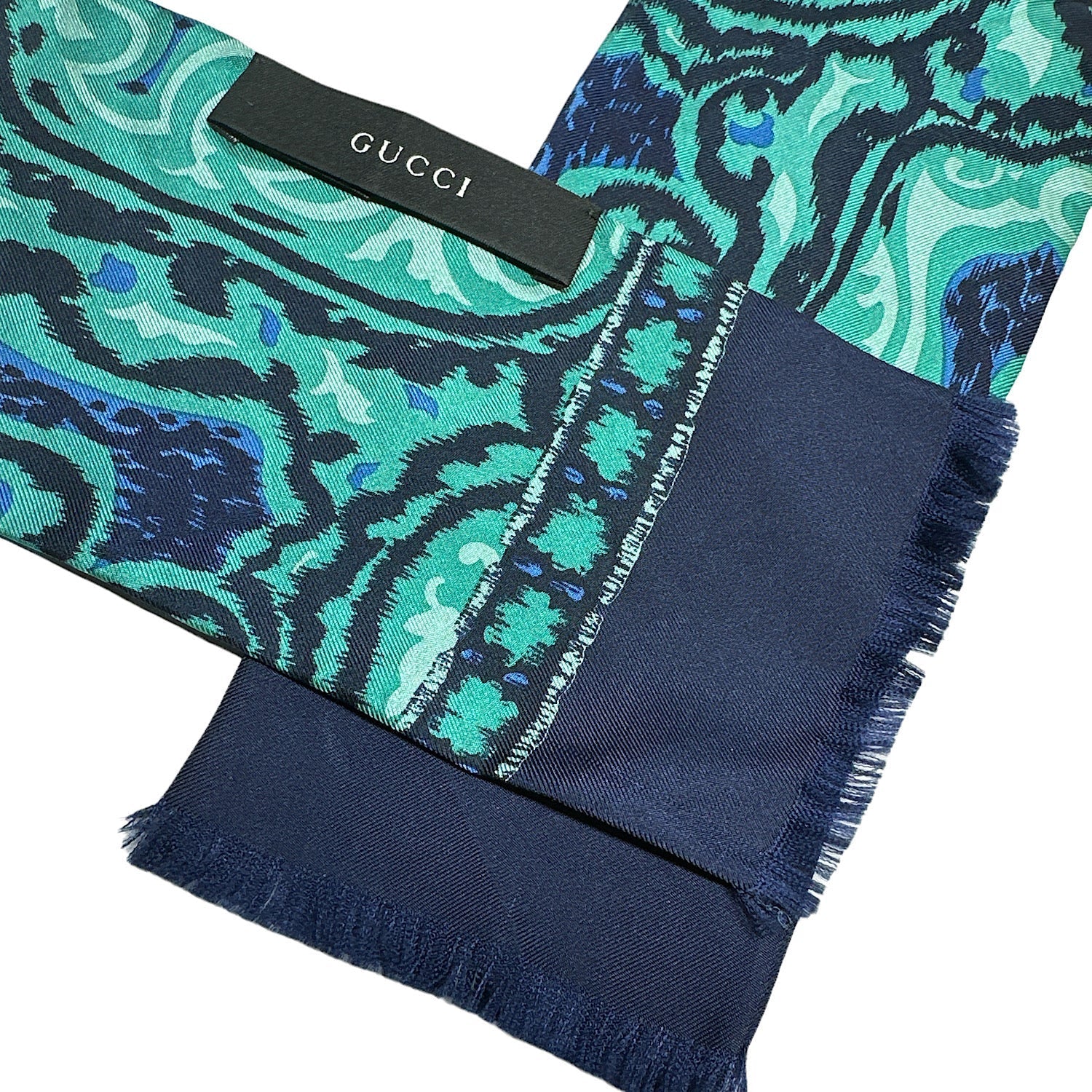 As an icon of luxury, the classic GUCCI scarf represents quality, craftsmanship, and timeless style. This bold and stunning 100% Silk Scarf has gorgeous greens and blues throughout. : 295.00