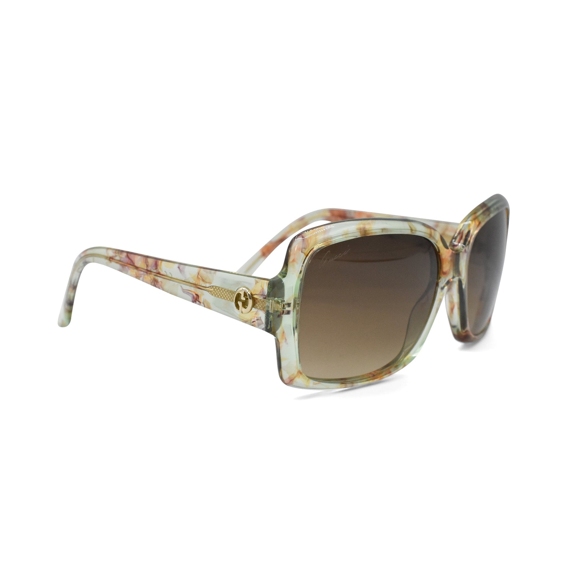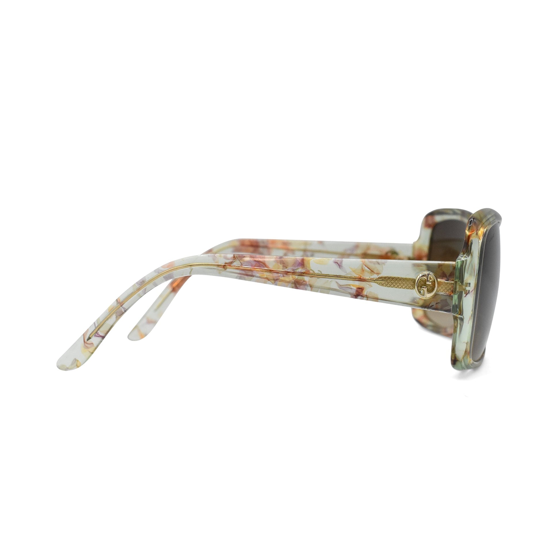 Gucci oversized sunglasses in transparent green and brown acetate with brown lenses and gold 1973 GG logo hardware on the arms.