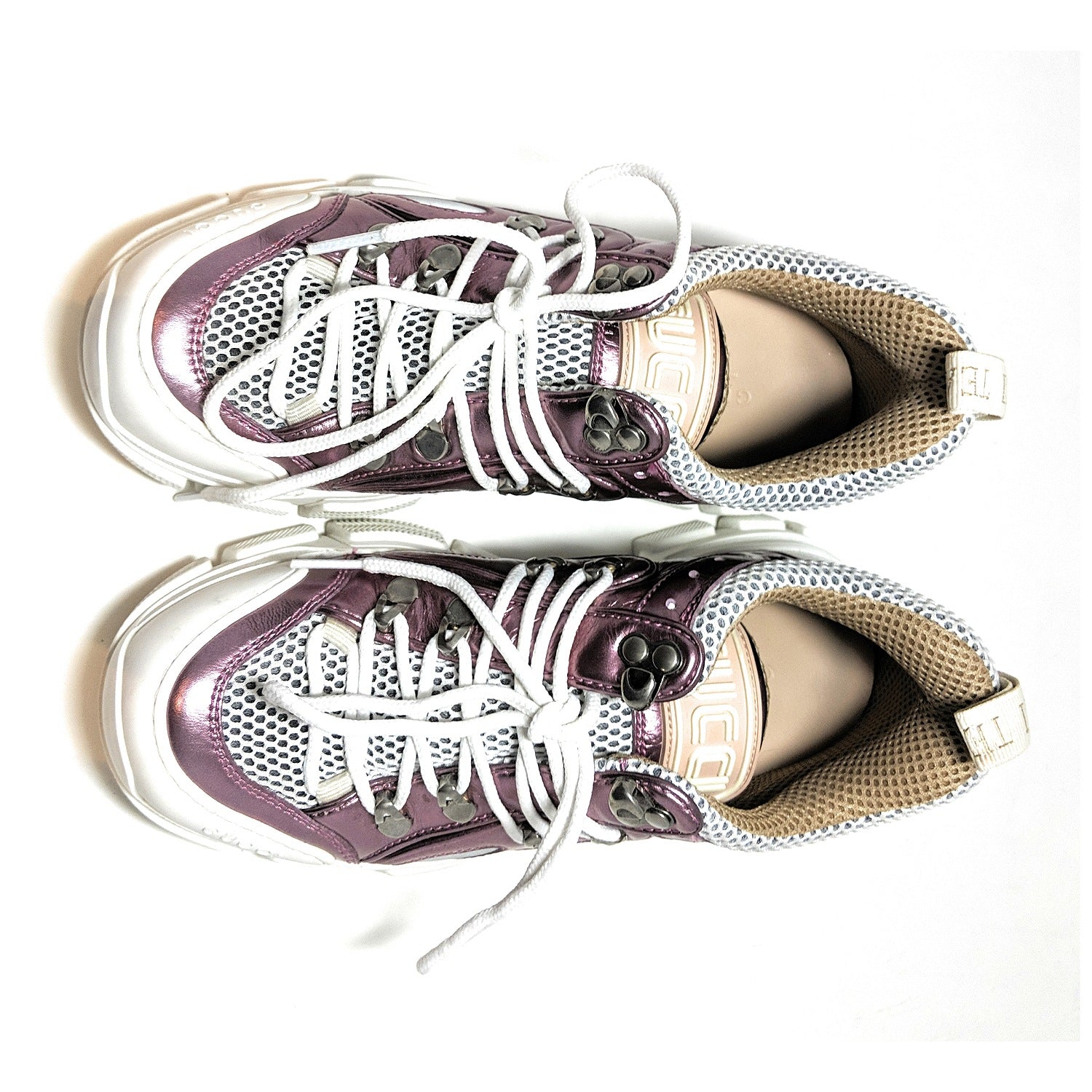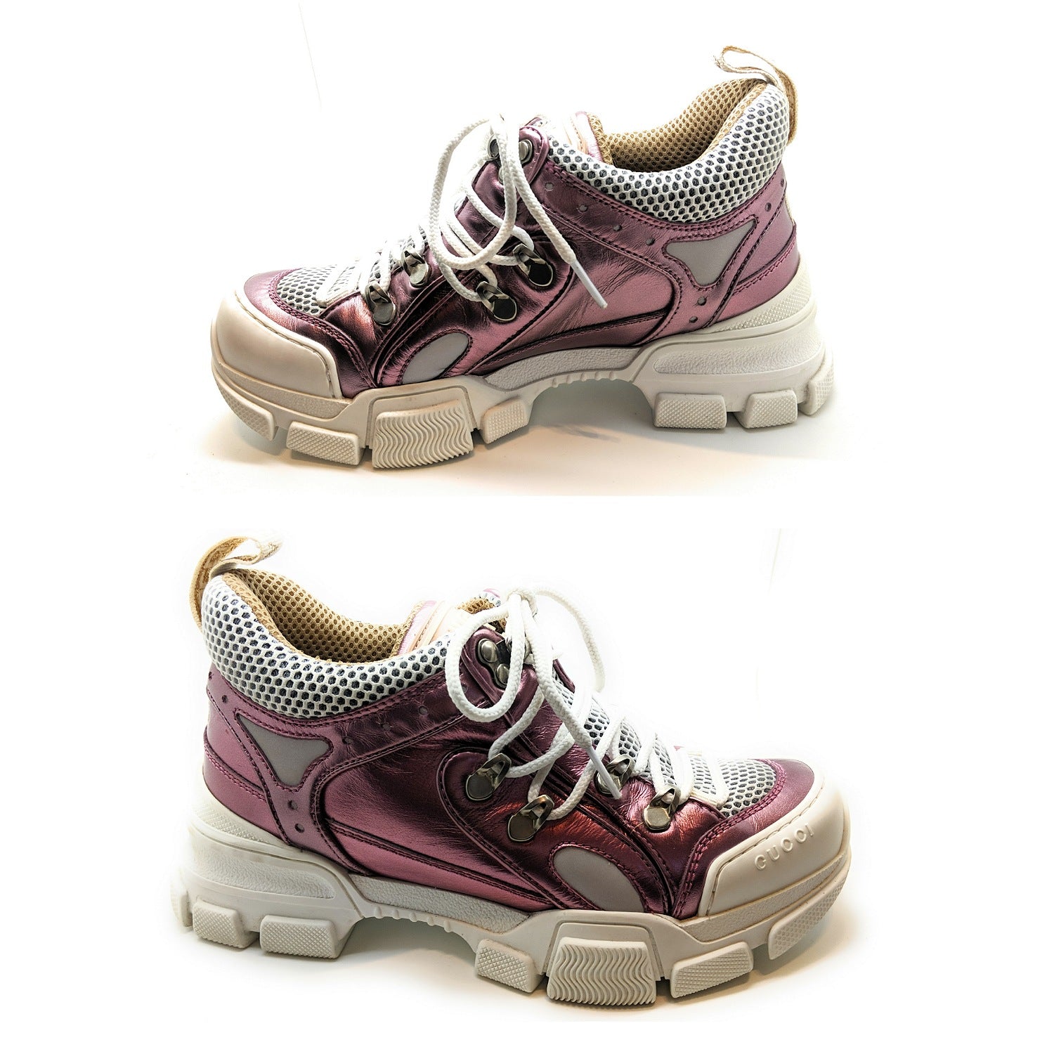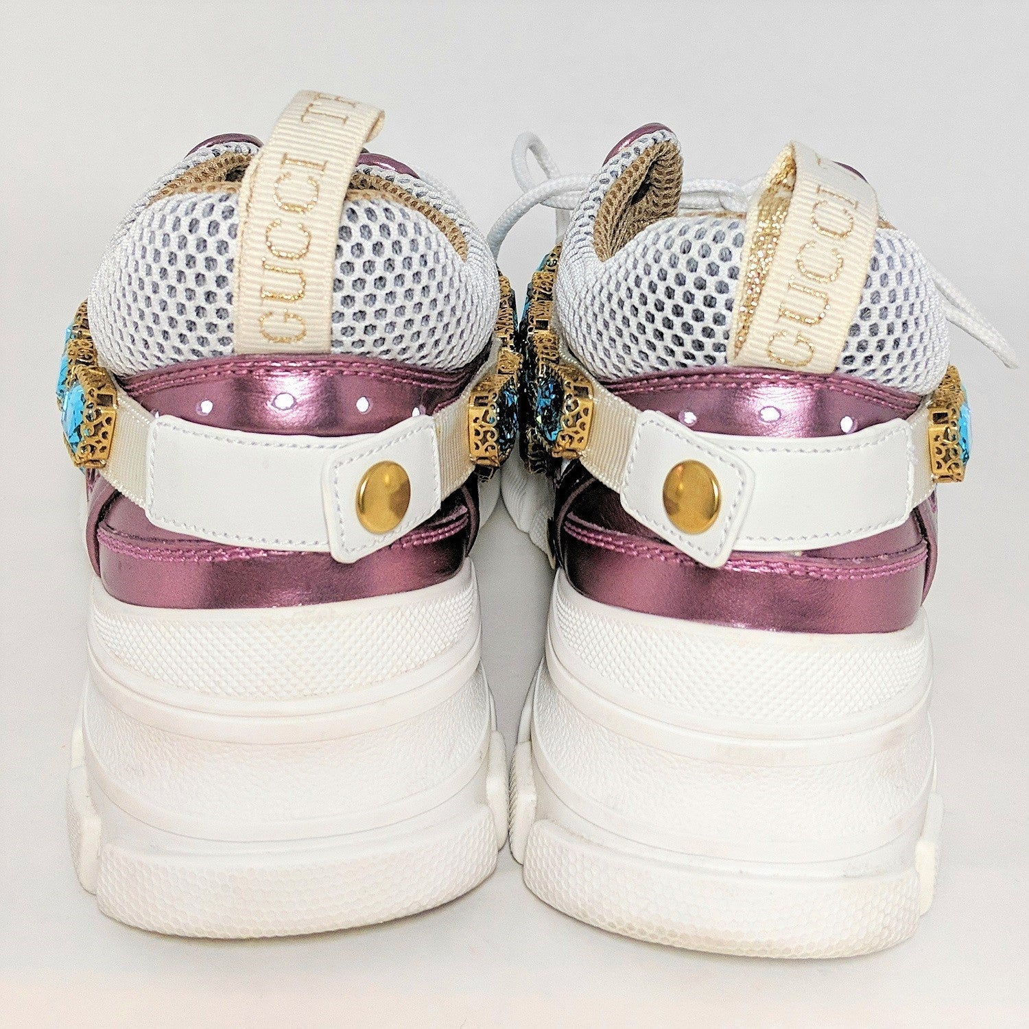 Inspired by hiking, Guccis Flashtrek sneakers are a stylish take on the chunky sneaker trend. Mounted atop a thick sole, these kicks are constructed from mesh and leather and accented with the labels SEGA-inspired logo on the tongues. These sneakers are finished off with removable crystal embellishments for an opulent touch, round toes, and comfortable insoles that provide maximum grip while walking. 1,590.