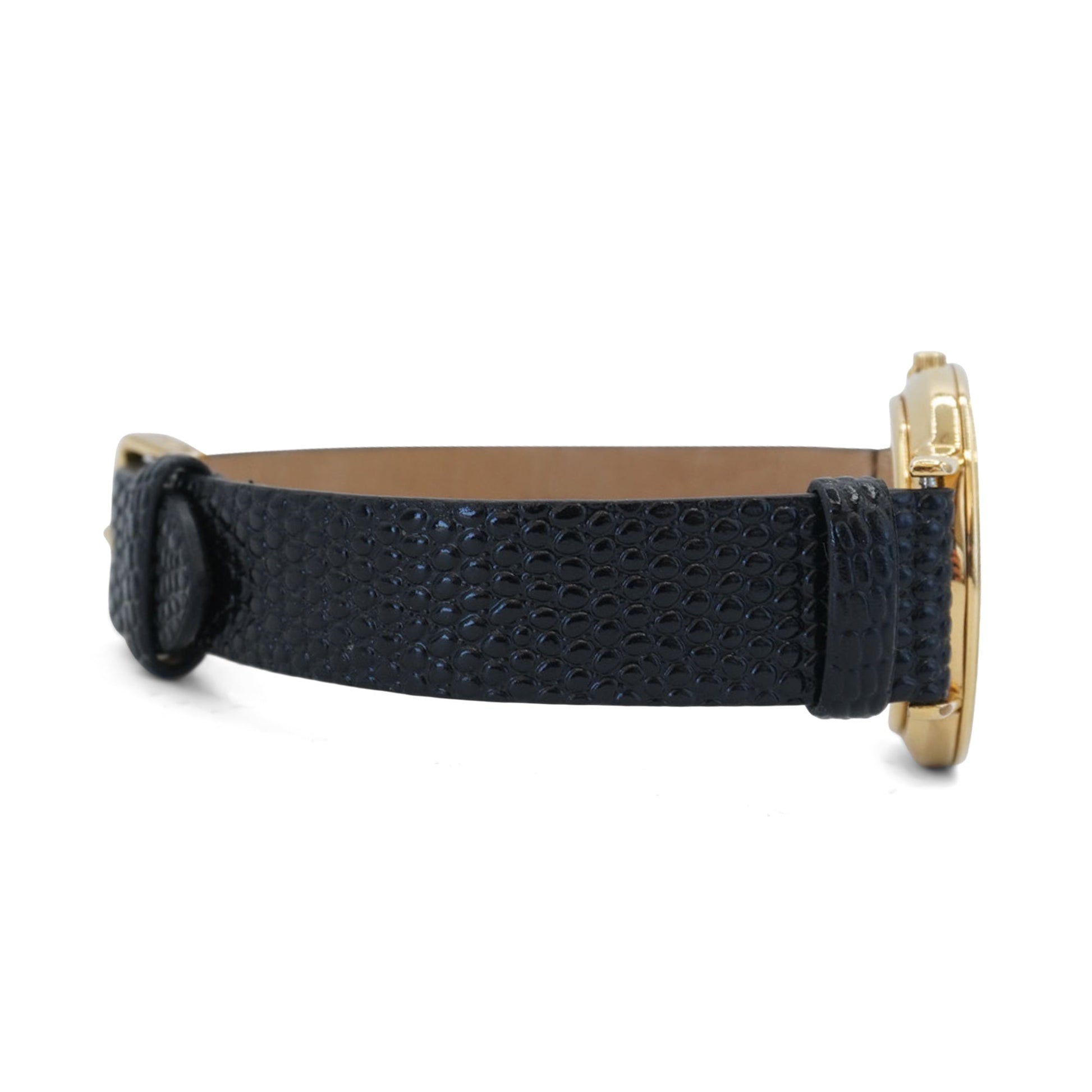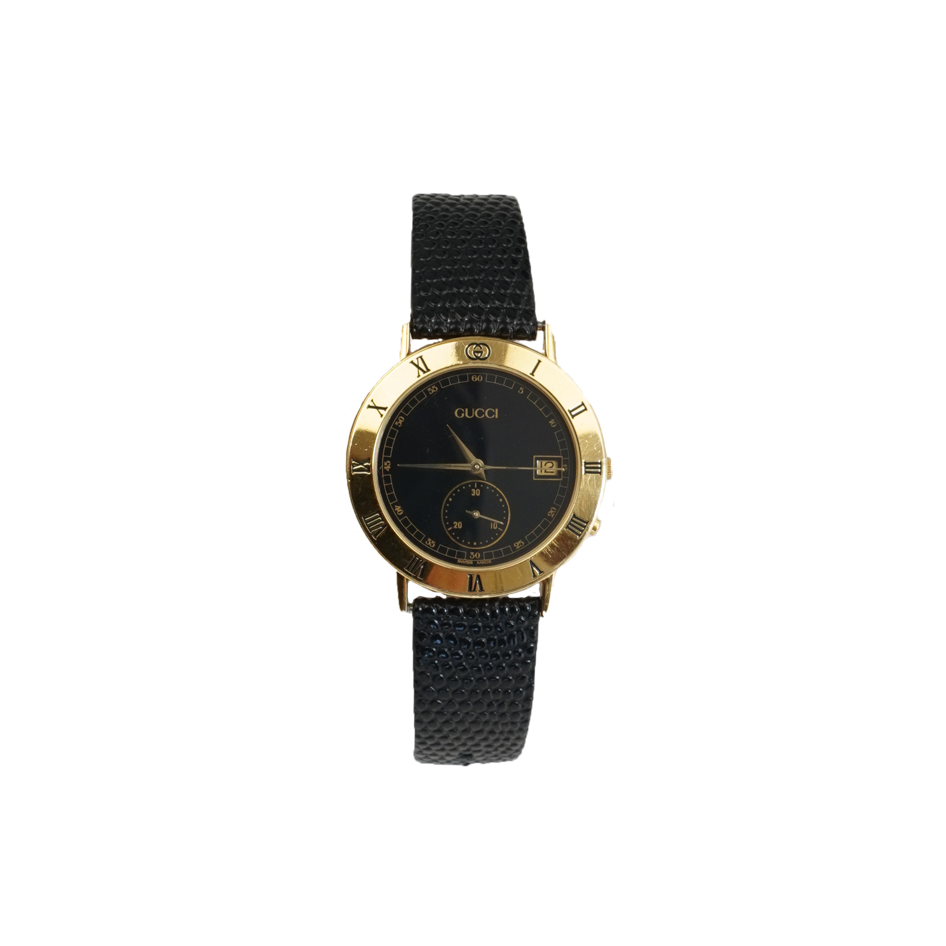Gucci '3800 Series' watch in gold toned stainless steel with a black lizard strap, a black face with an engraved bezel, roman numeral engraving, and a buckle closure.