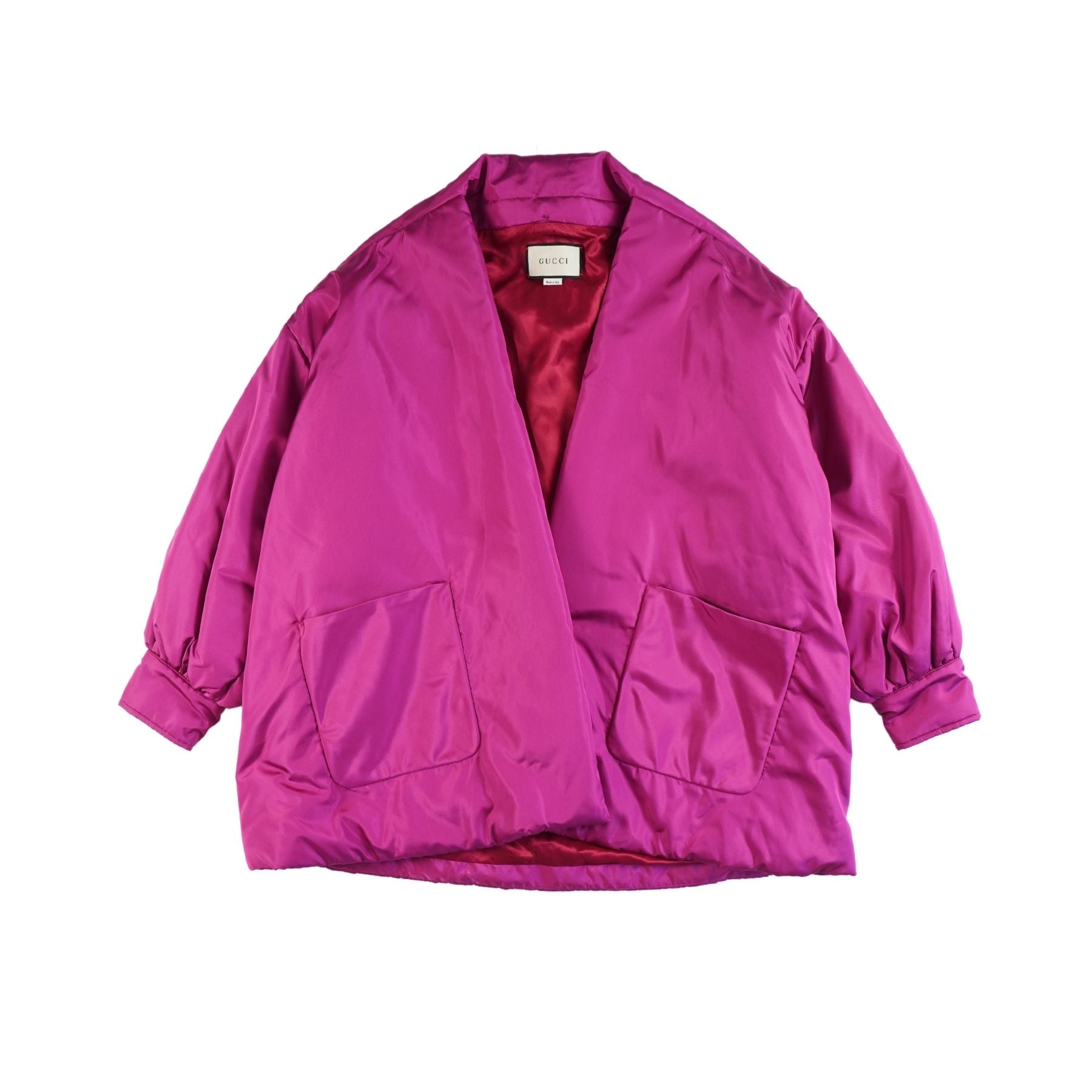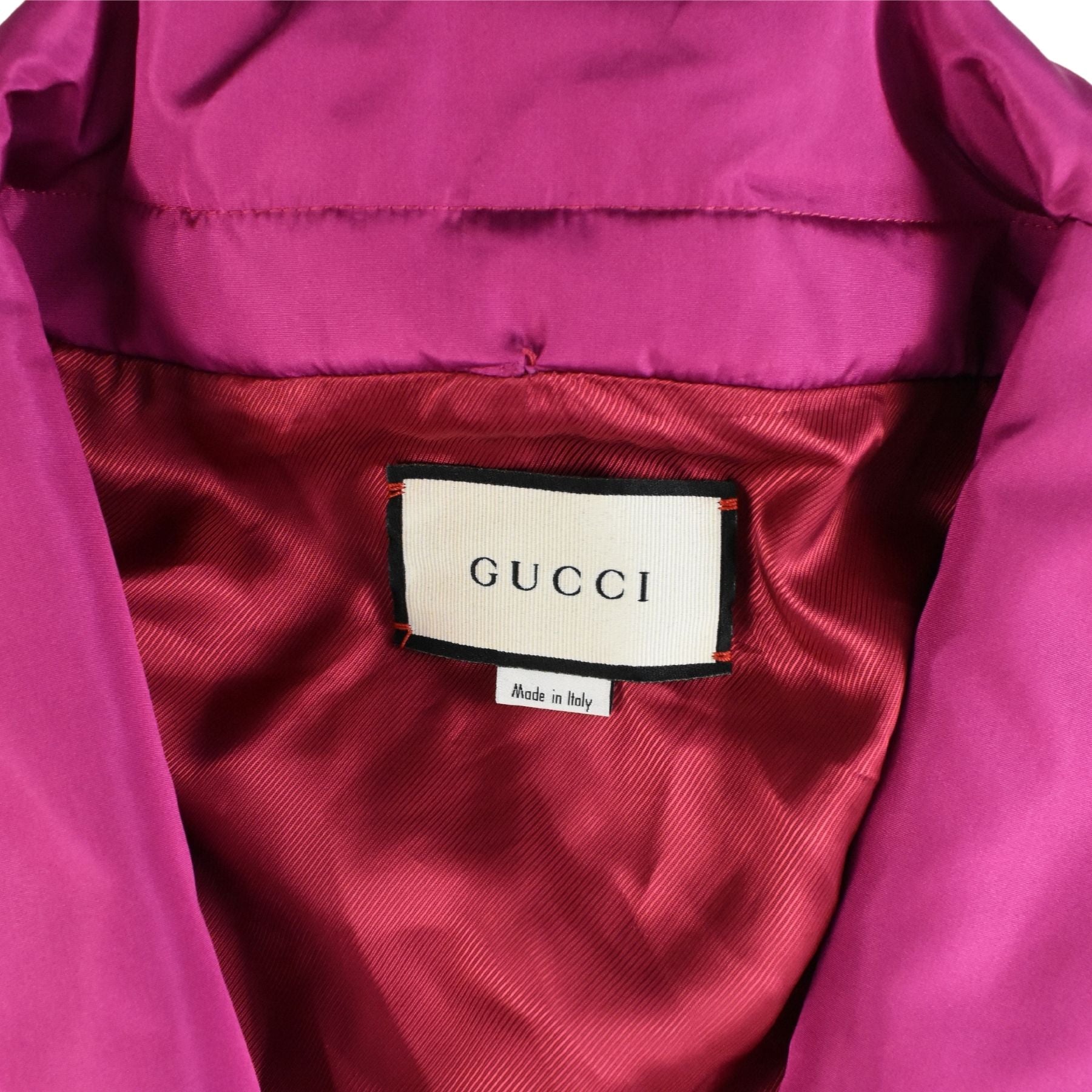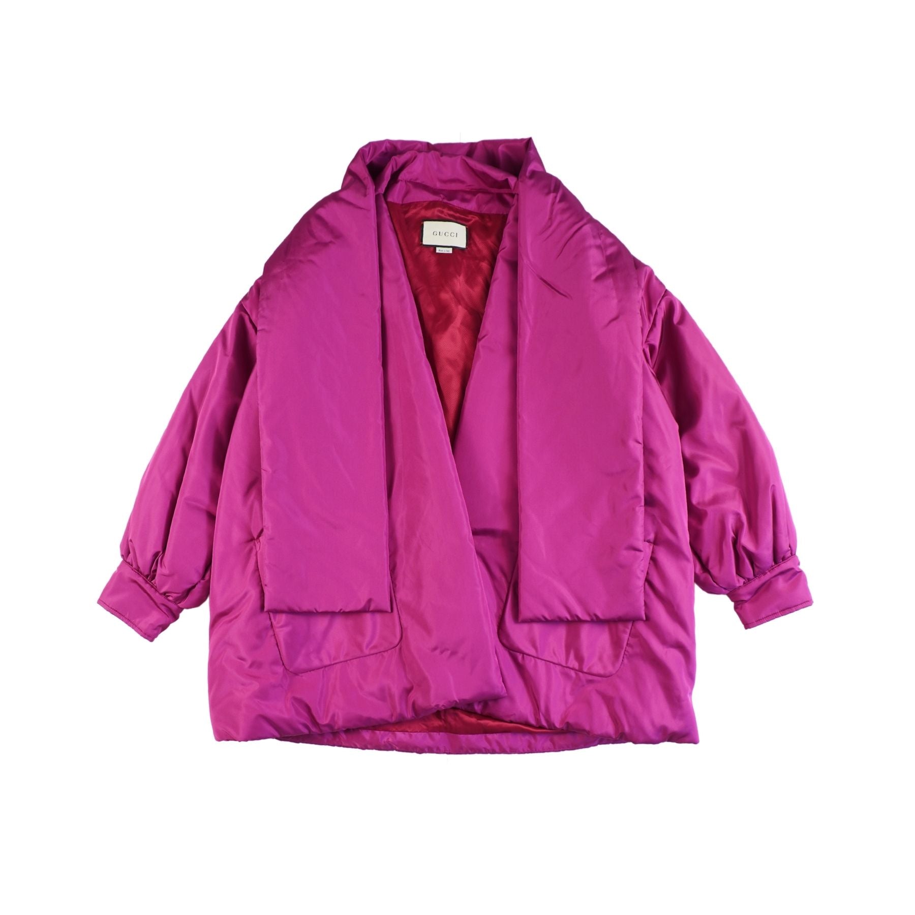 Gucci oversized 80's style puffer jacket in fuchsia pink silk. Features a single snap button closure, a deep v-neckline, front slip pockets, and puffed sleeves with a cream and gold large snap button closure detail. Comes with matching puffer scarf.