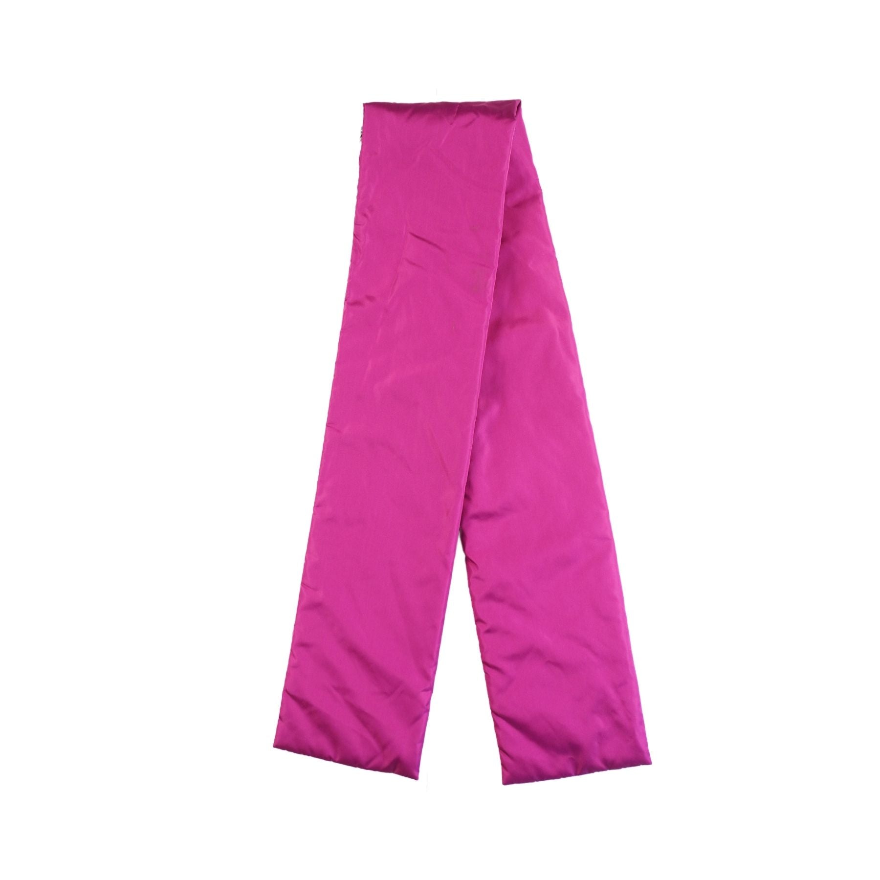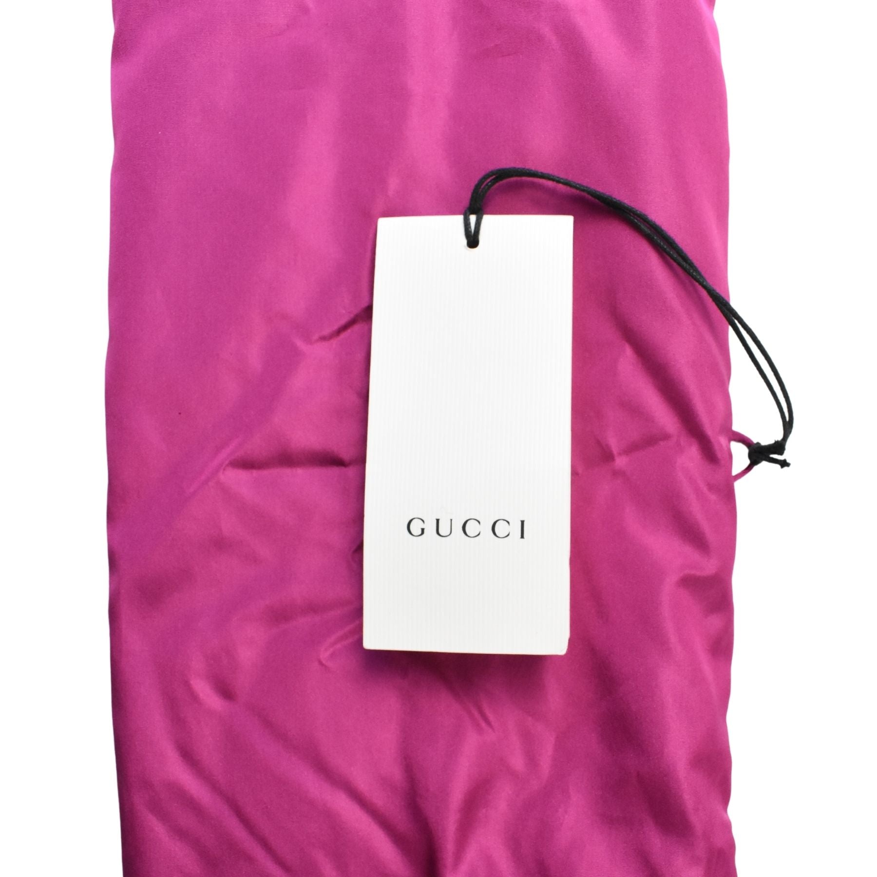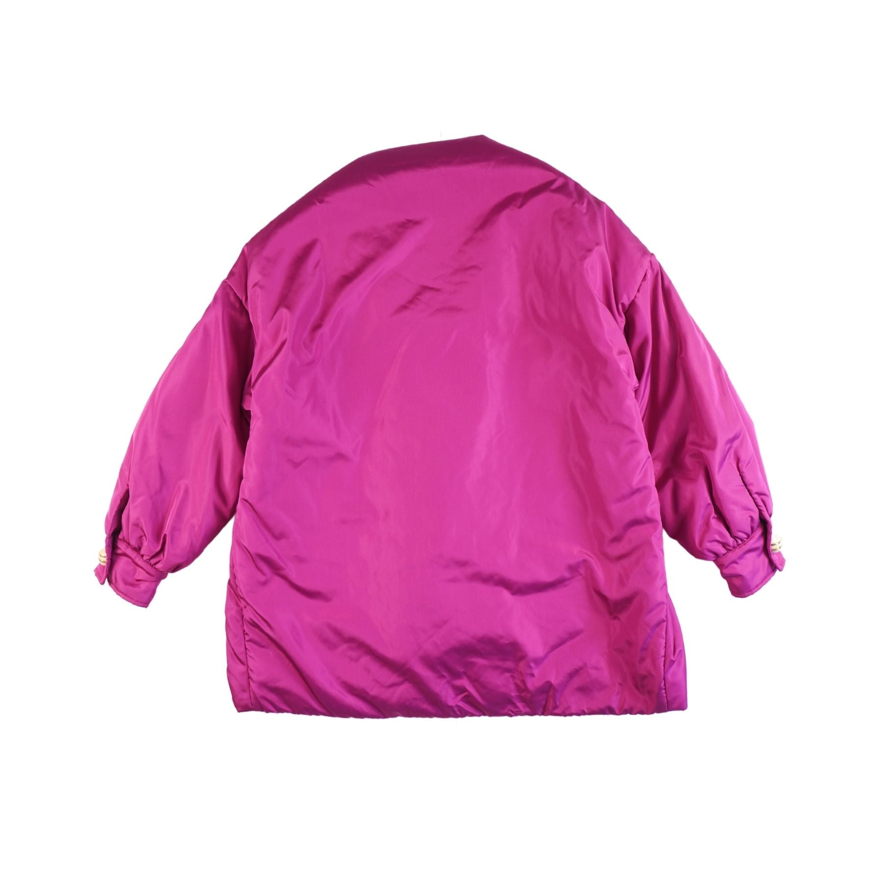 Gucci oversized 80's style puffer jacket in fuchsia pink silk. Features a single snap button closure, a deep v-neckline, front slip pockets, and puffed sleeves with a cream and gold large snap button closure detail. Comes with matching puffer scarf.
