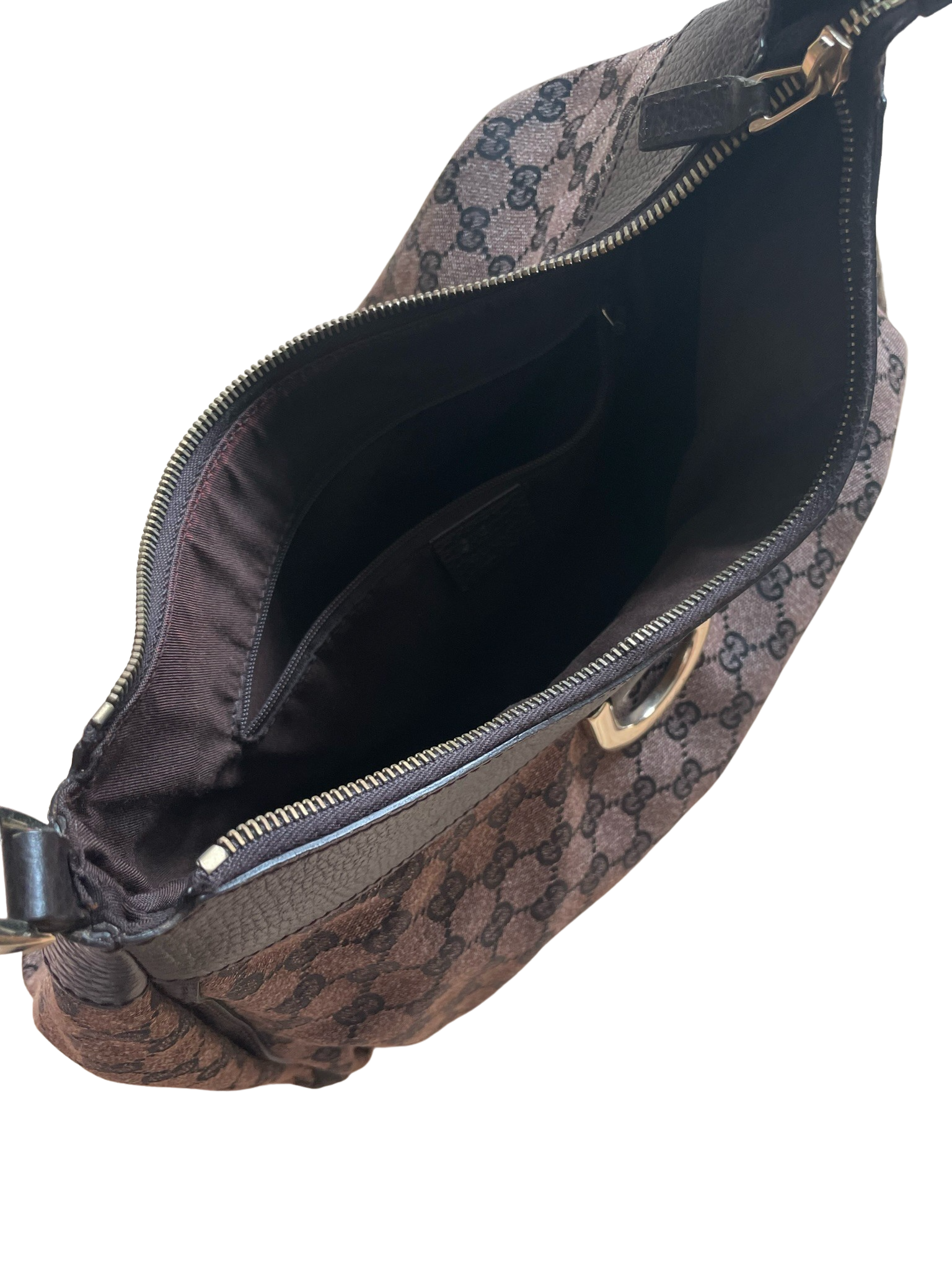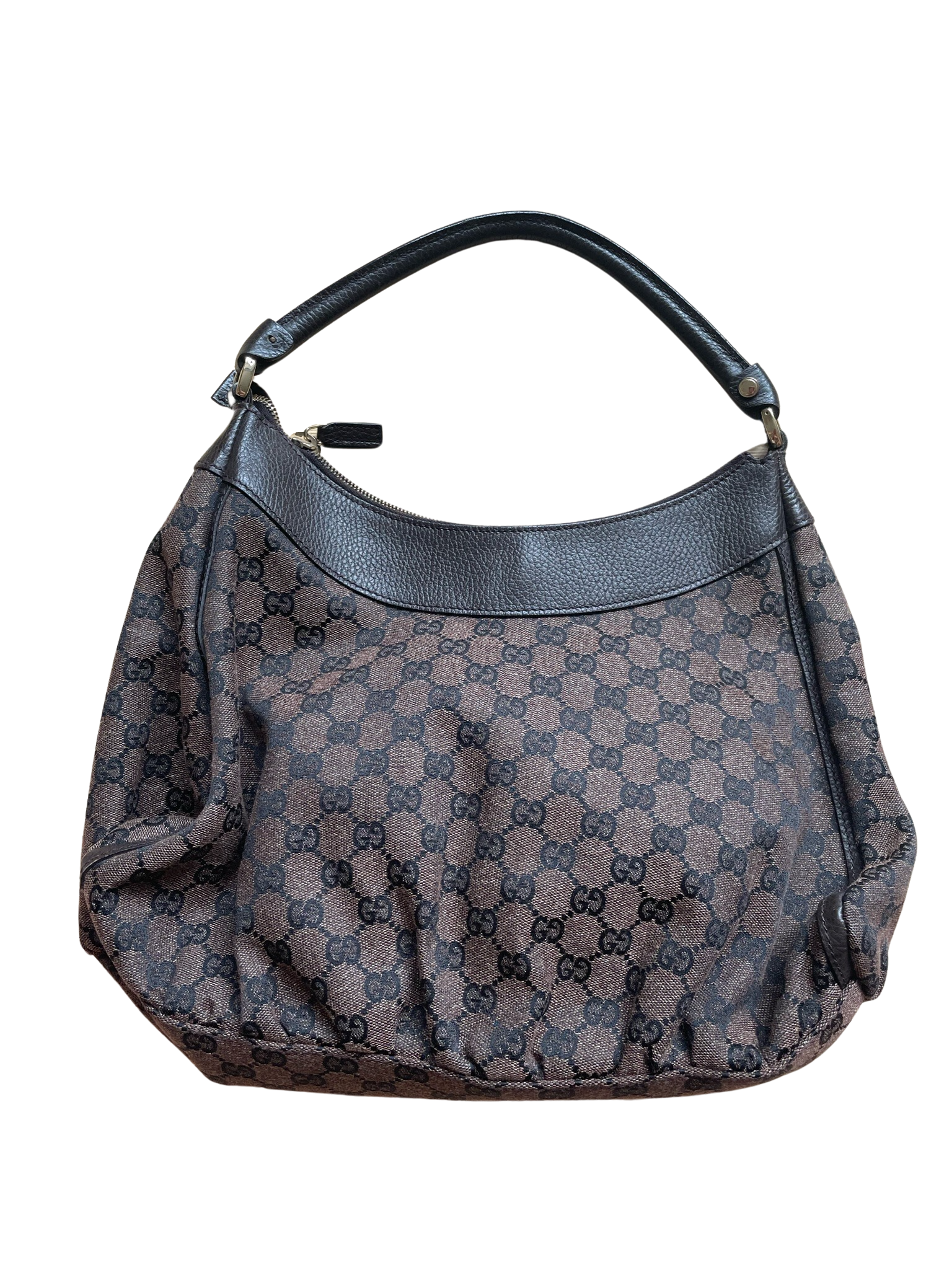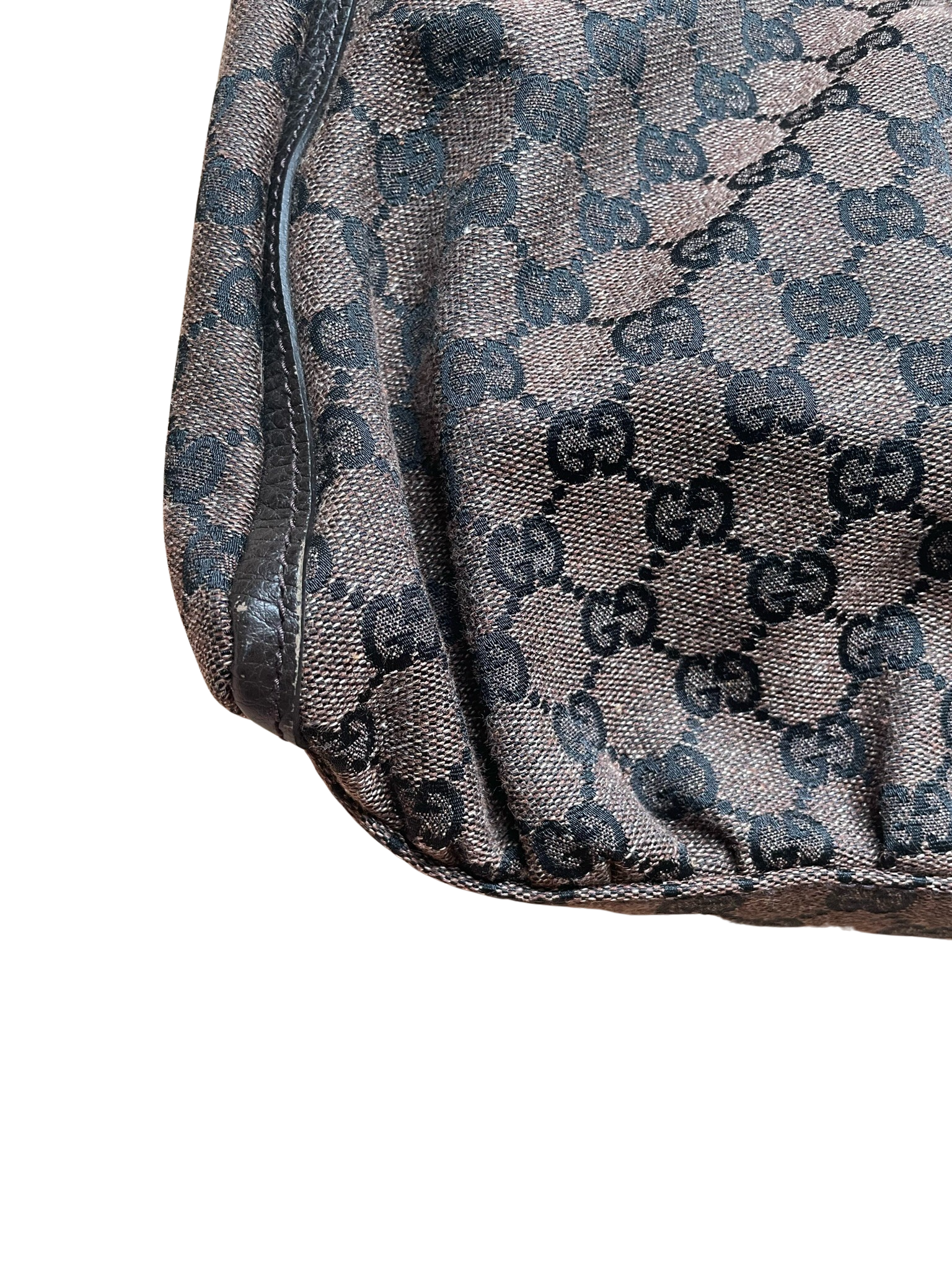 Gucci Abbey Brown Jacquard & Leather in fine condition with some signs of previous New and patina. Specifically the bag shows signs of previous wear in the form of some discolouration and scratches on particularly the corners, hardware, and handles of the bag. The inside pockets are in fine condition as well.