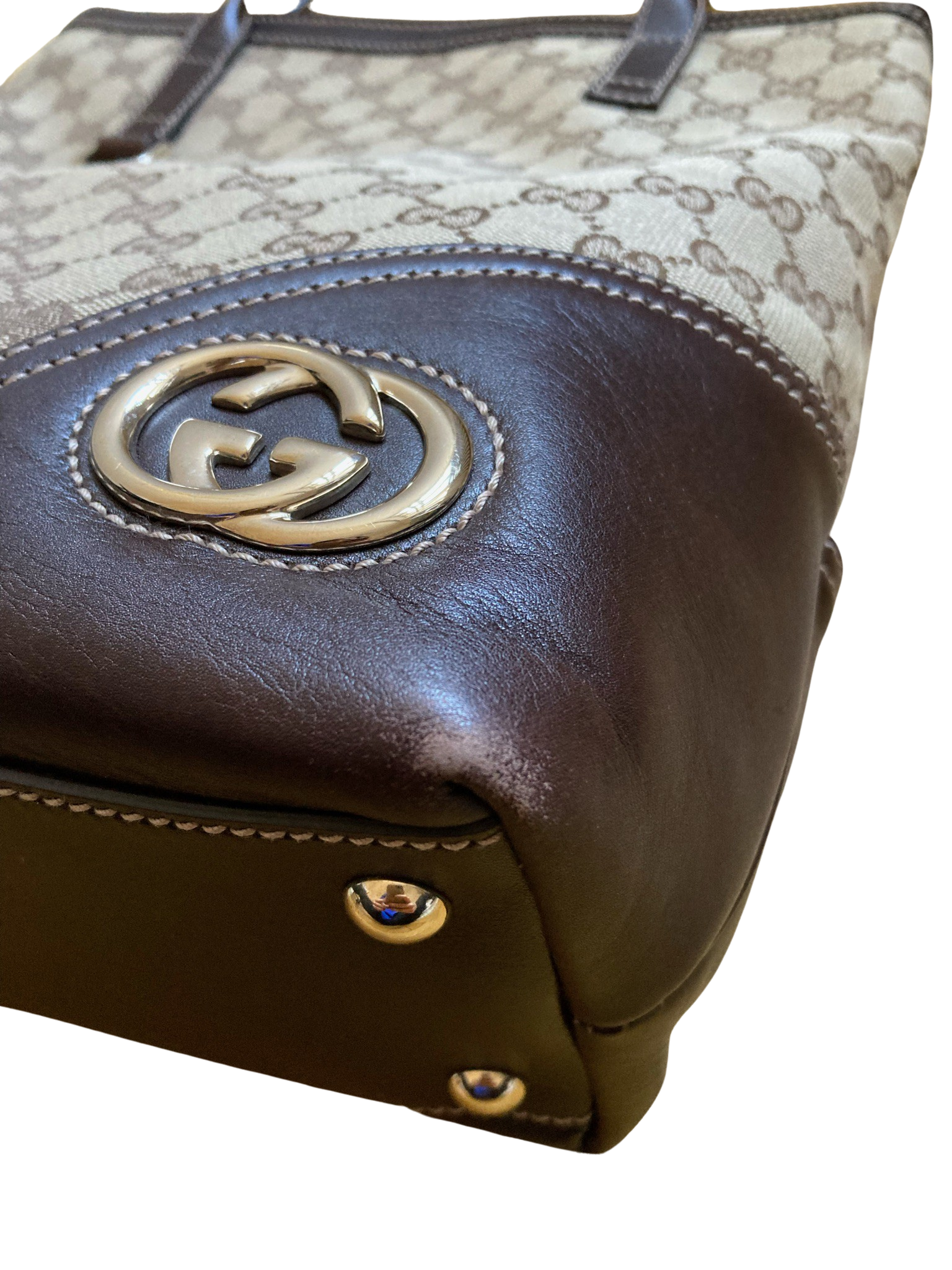 Gucci Abbey Jacquard & Leather Tote Bag in good new with some signs of previous use and patina. Specifically the bag has some signs og previous wear on the corners. Overall the bag is in good condition. The bag's interior is also in good condition. Original dustbag comes with the bag.