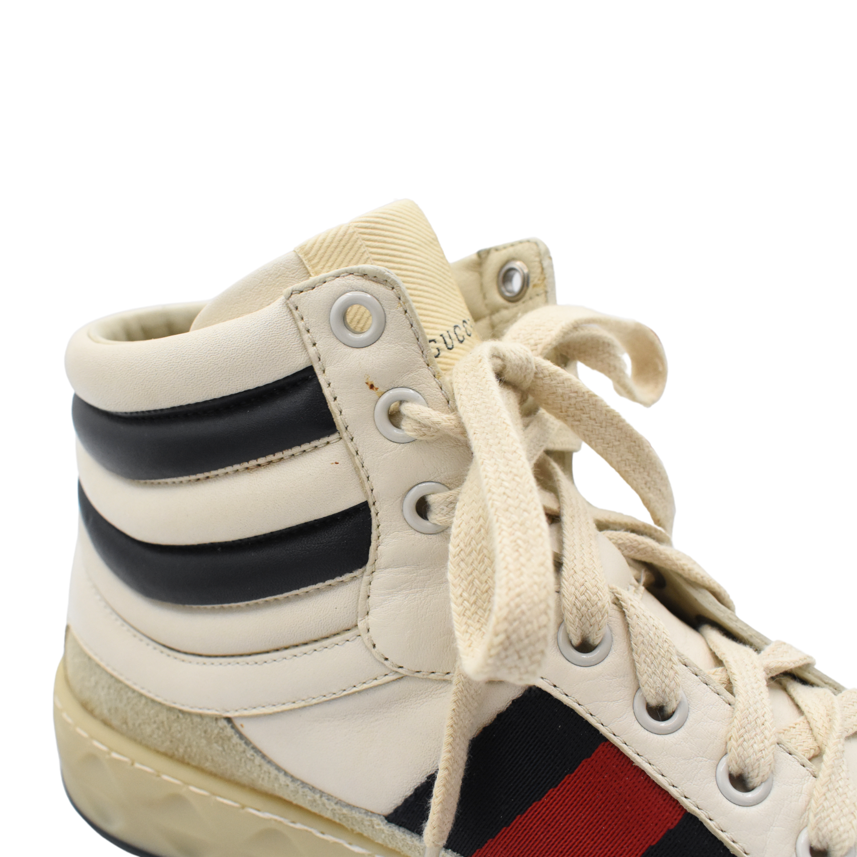 Gucci 'Ace' high-top sneakers in white leather with with grey suede panelling, navy stripes around the ankle, a signature red and navy racing stripe on the sides, and a cream rubber sole.