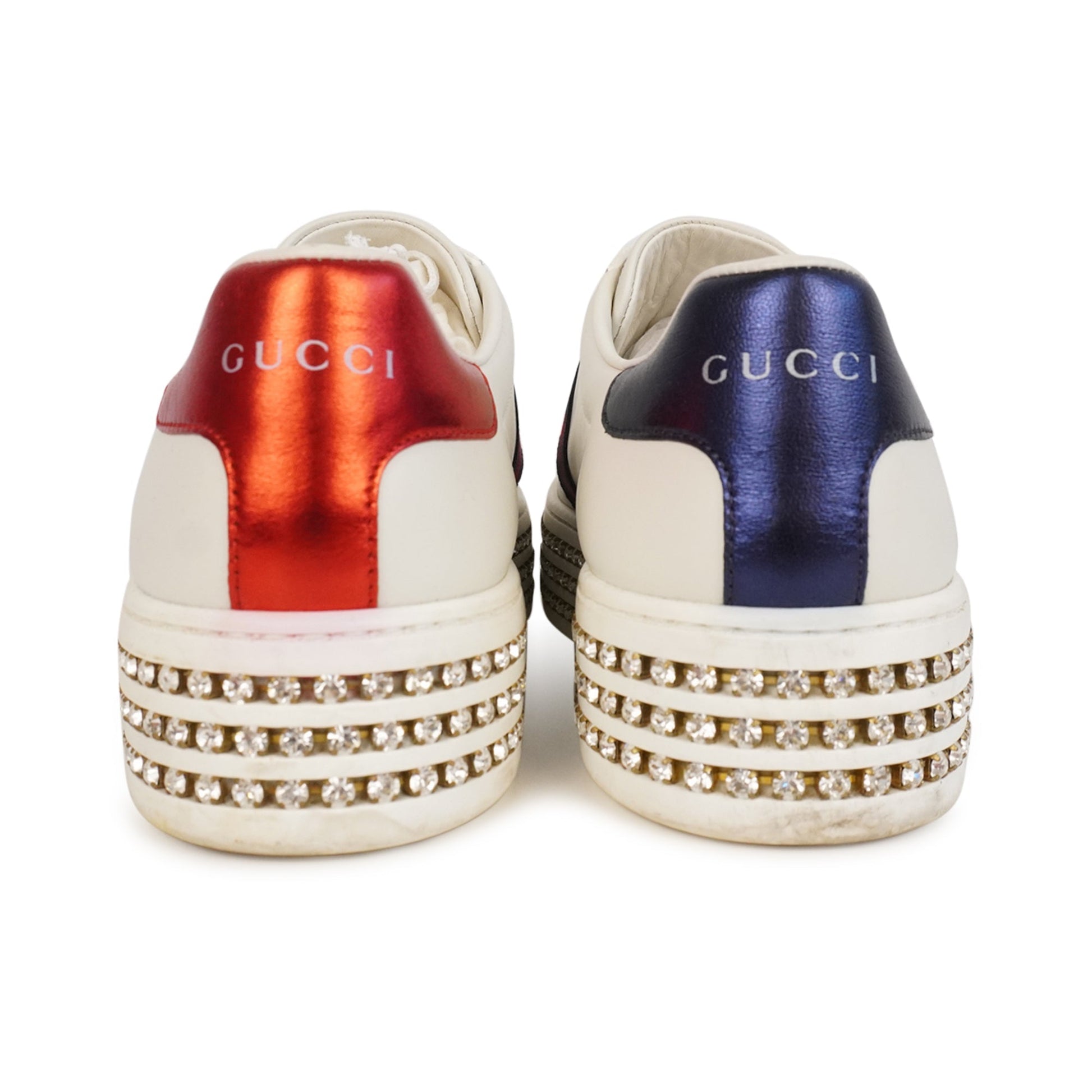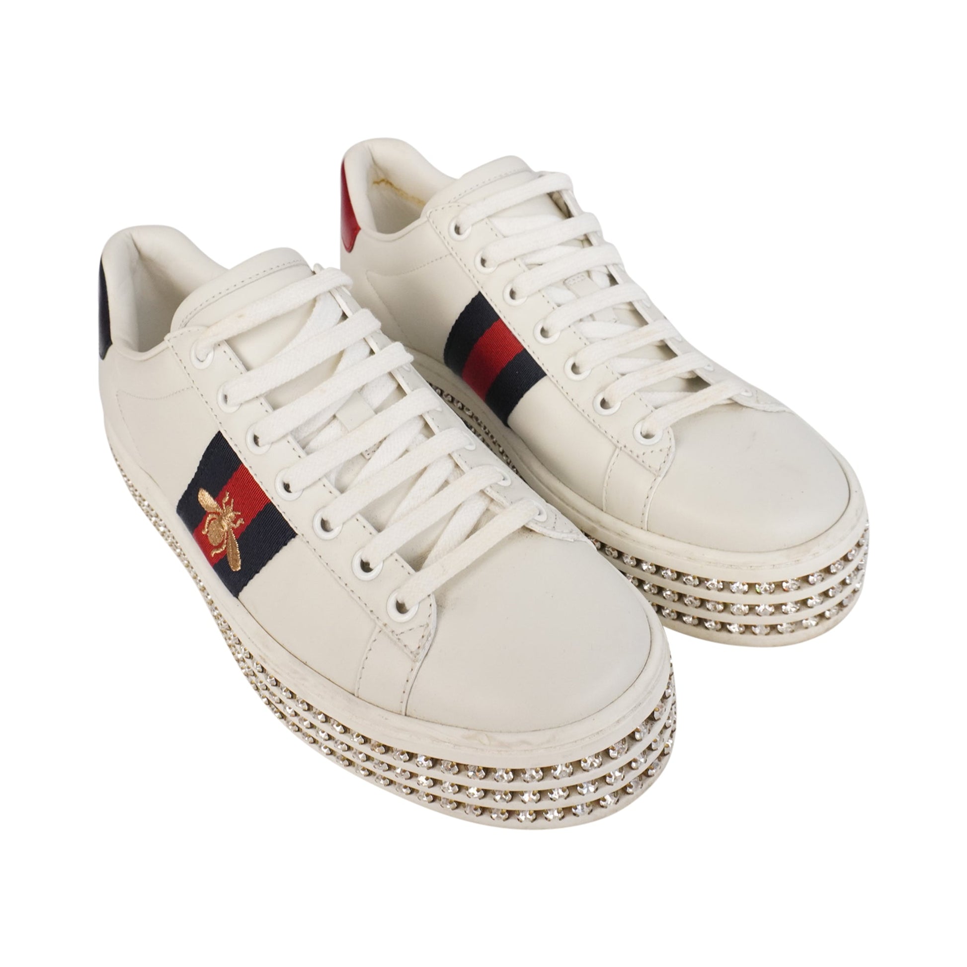 Gucci 'Ace' low-top sneakers in white leather with a rubber rhinestone white platform sole. Features navy blue and red racing stripes on the sides with a gold embroidered bee, white flat laces, and red and blue metallic leather heel caps.