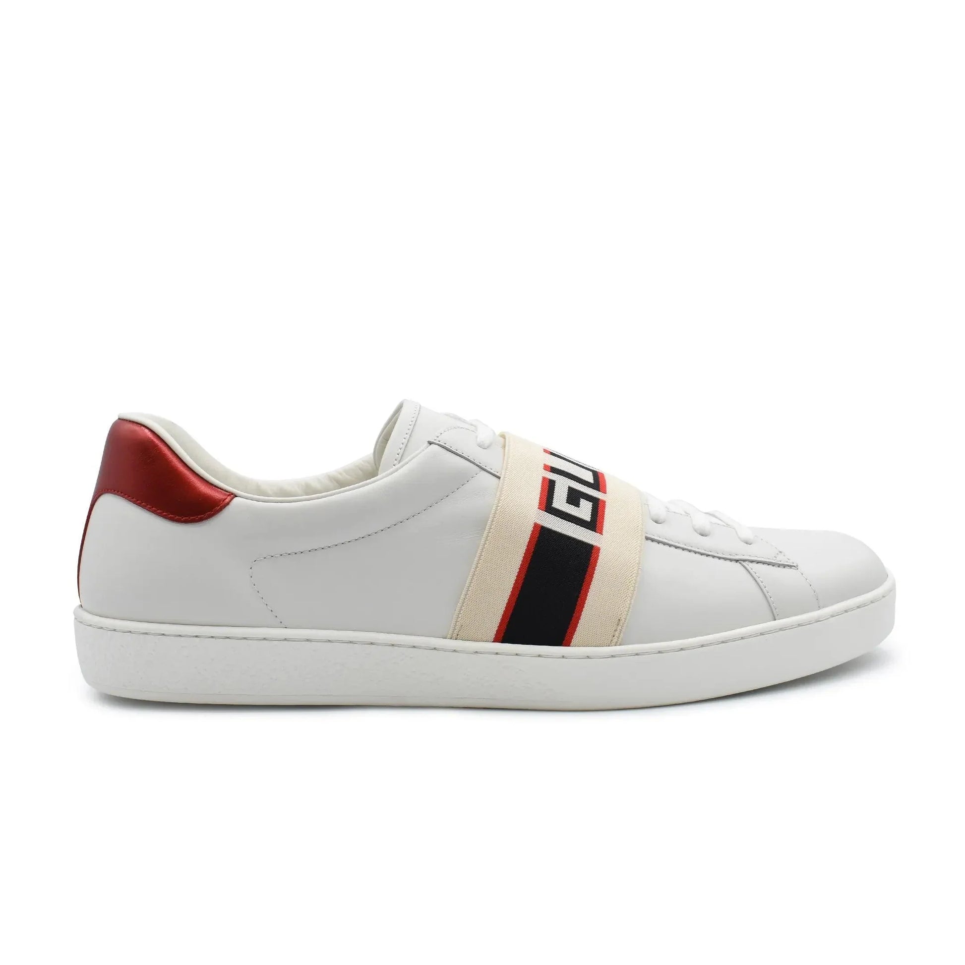 Gucci 'Ace' low top sneakers in white with red heel details. Features logo in black and red on a cream elastic band across the top of shoe.