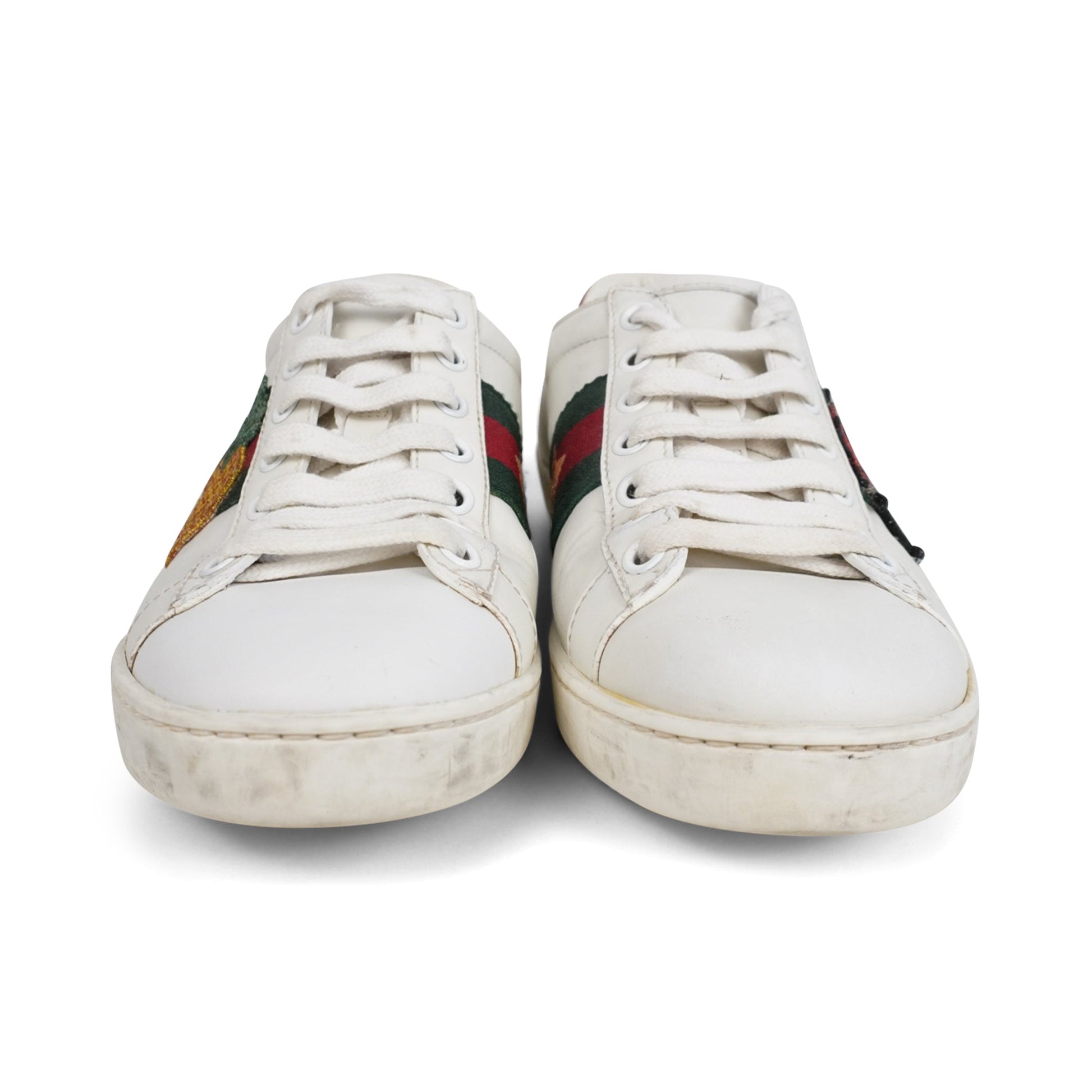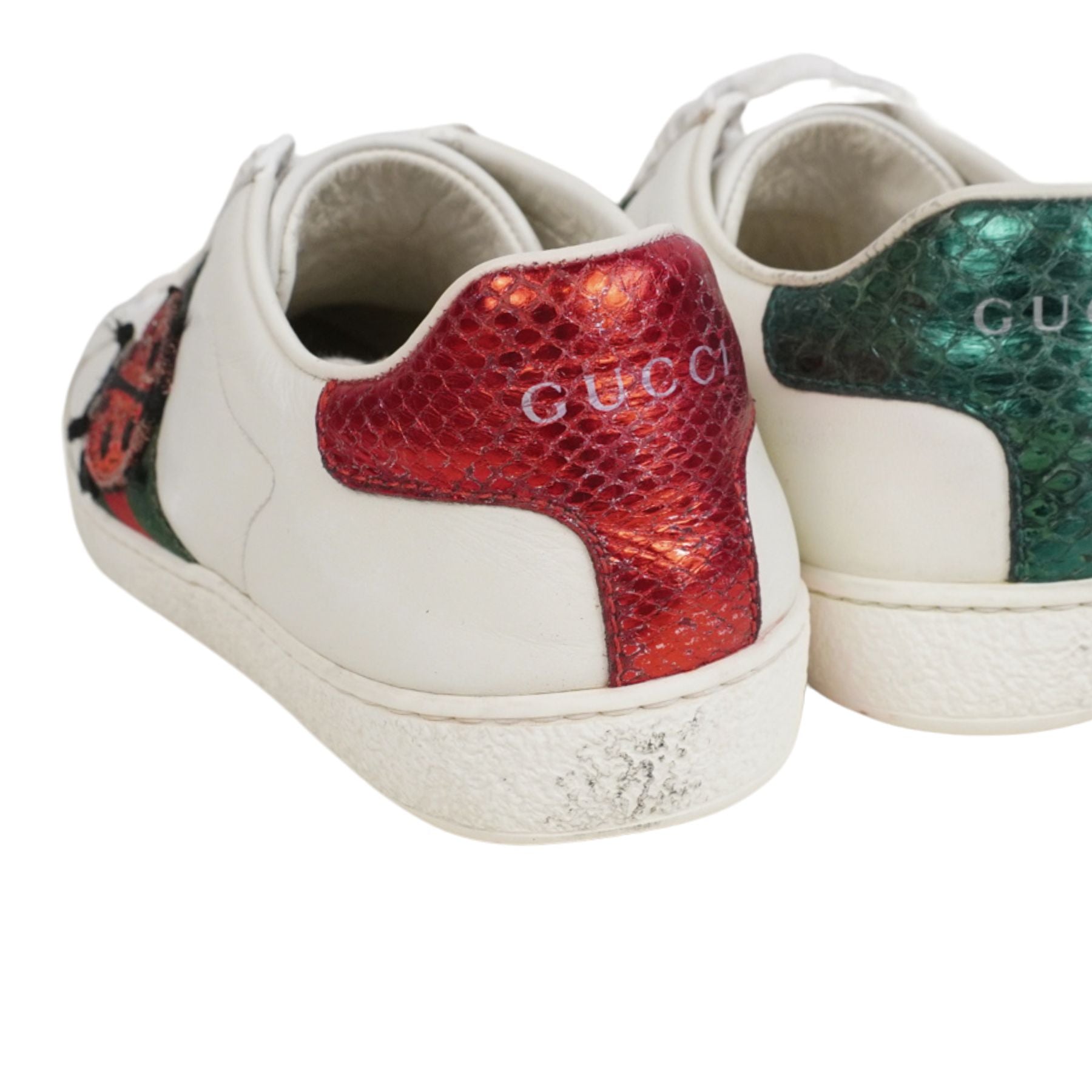 Gucci 'Ace' low-top sneakers in white leather with red and green snakeskin heel caps. Features red and green canvas racing stripes on the sides with a lady bug embroidered patch on one side and a pineapple patch on the other, white flat laces, and a white rubber sole.