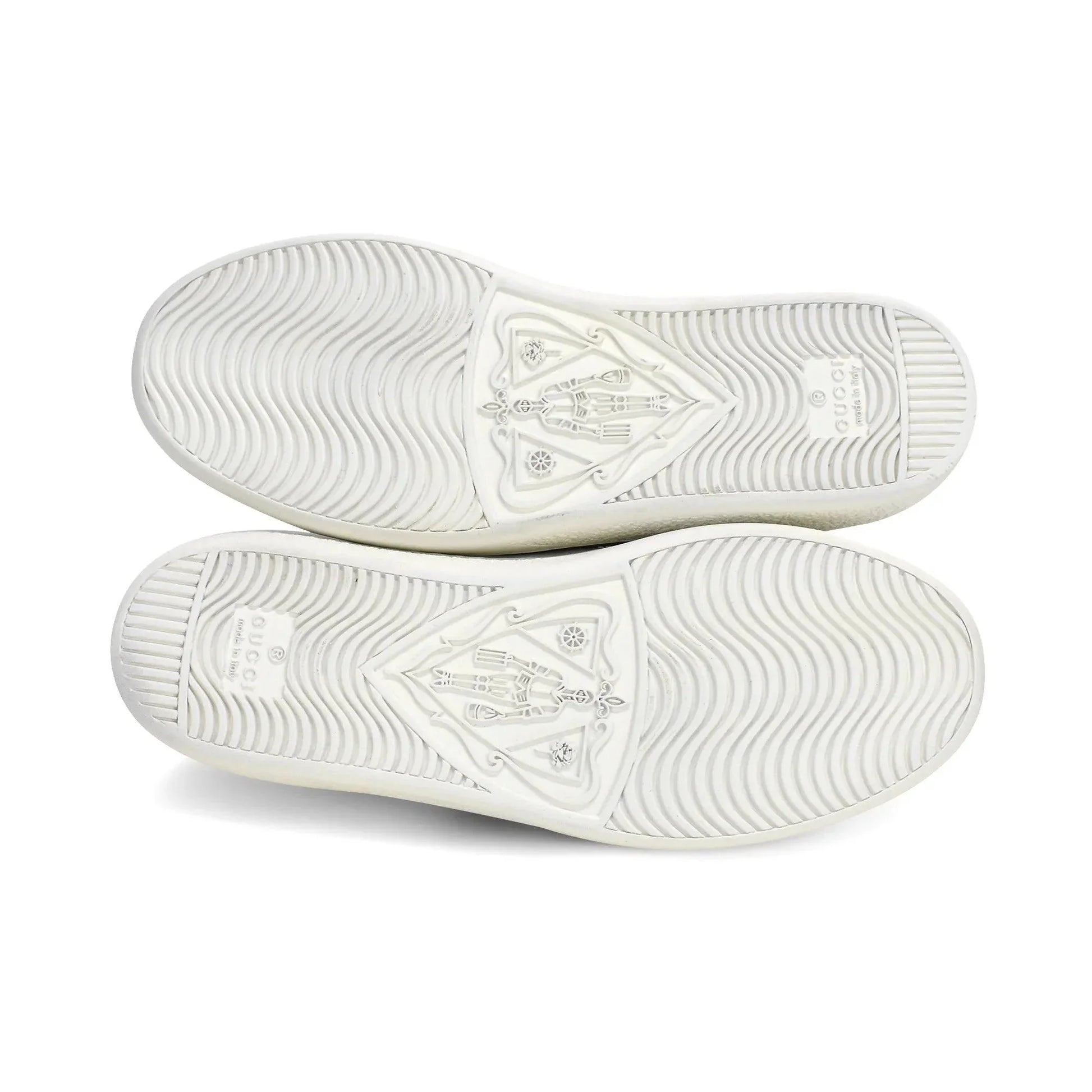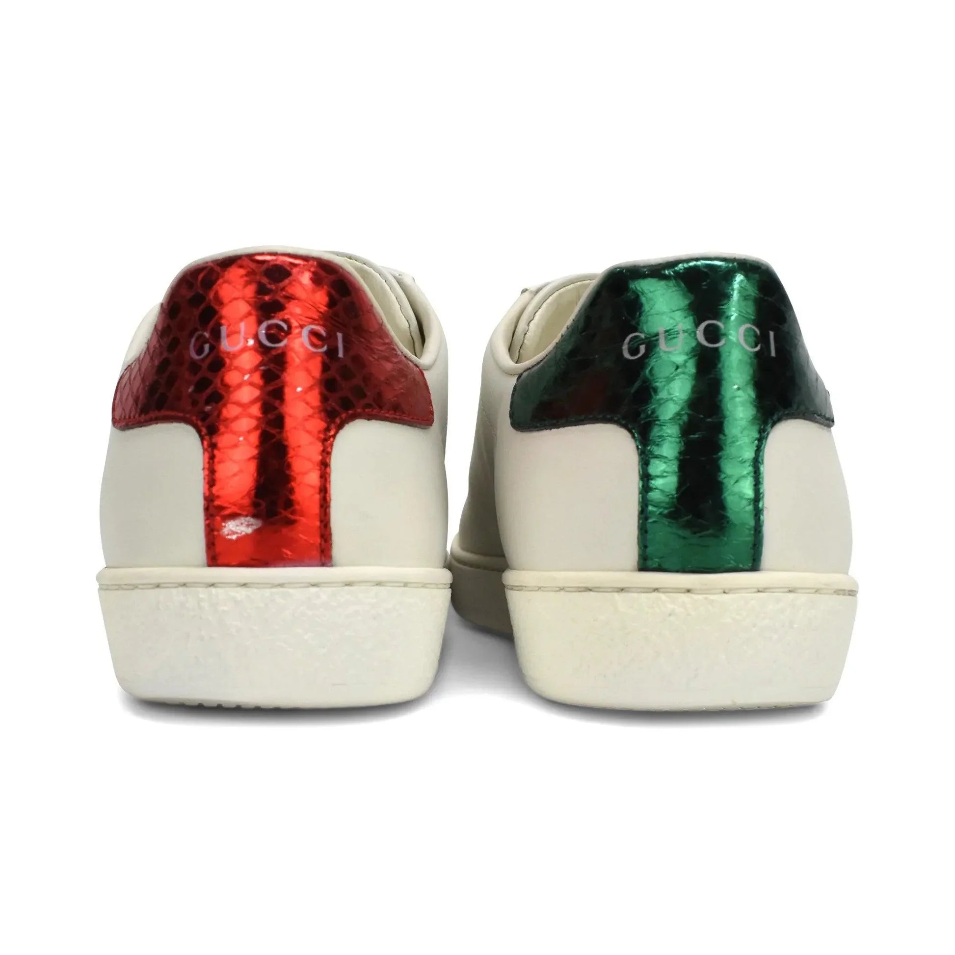 Gucci 'Ace' low-top sneakers in white leather with red and green heel details. Features sequinned green and red racing stripes with beaded lips in red and silver on the sides.