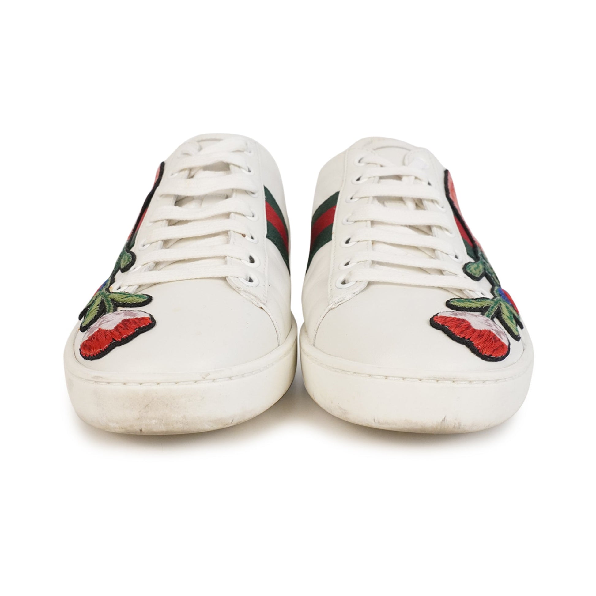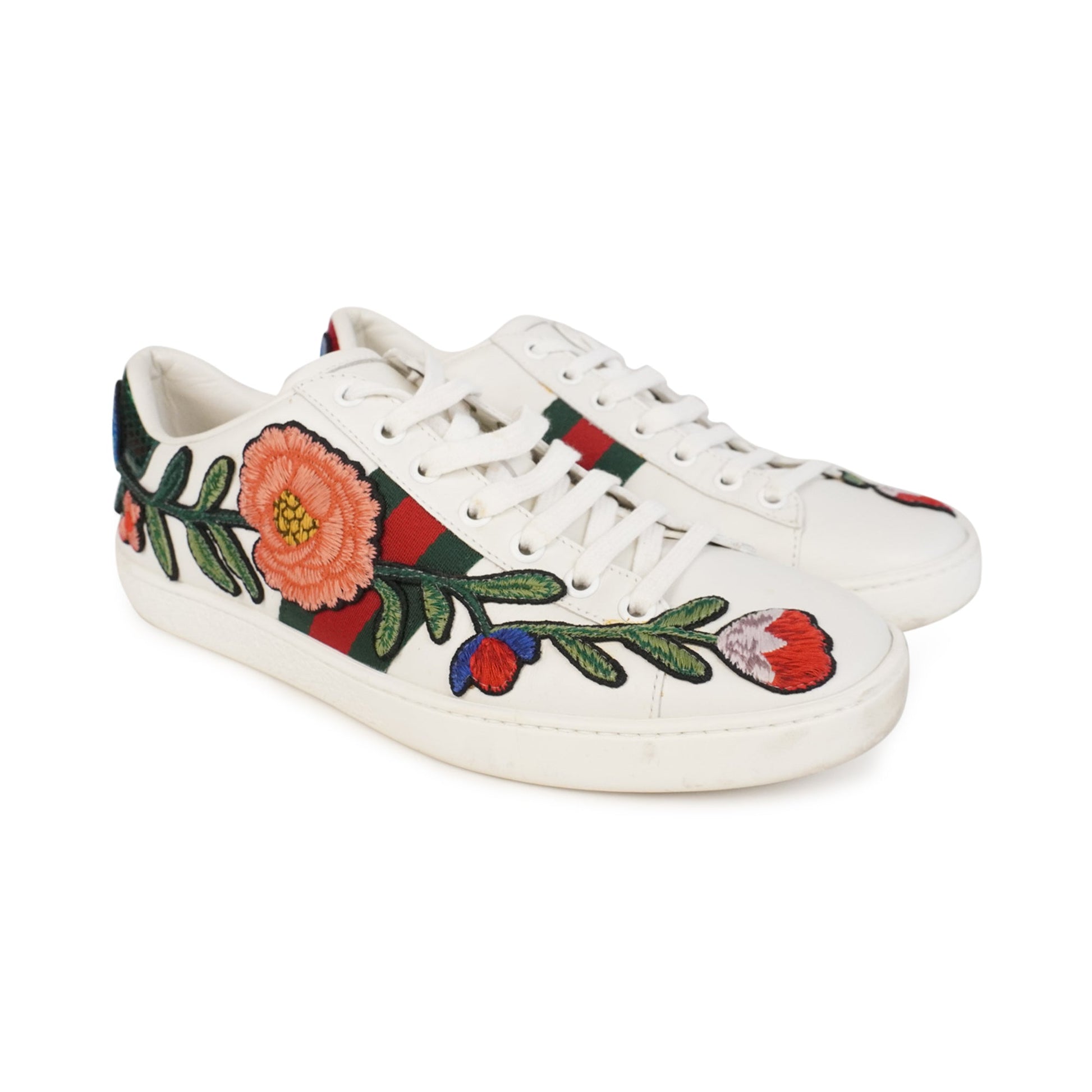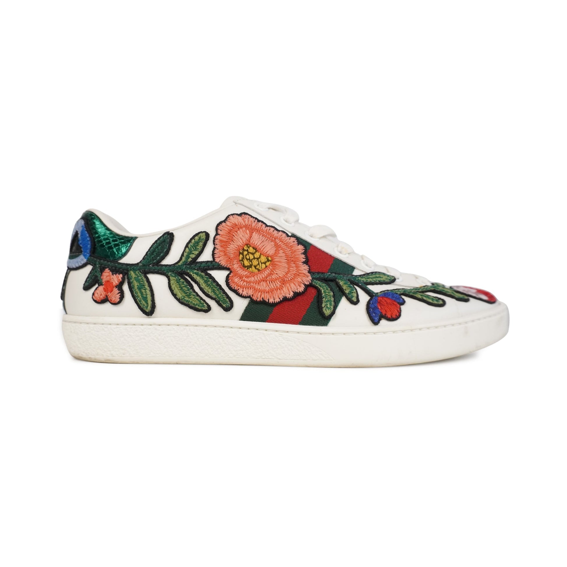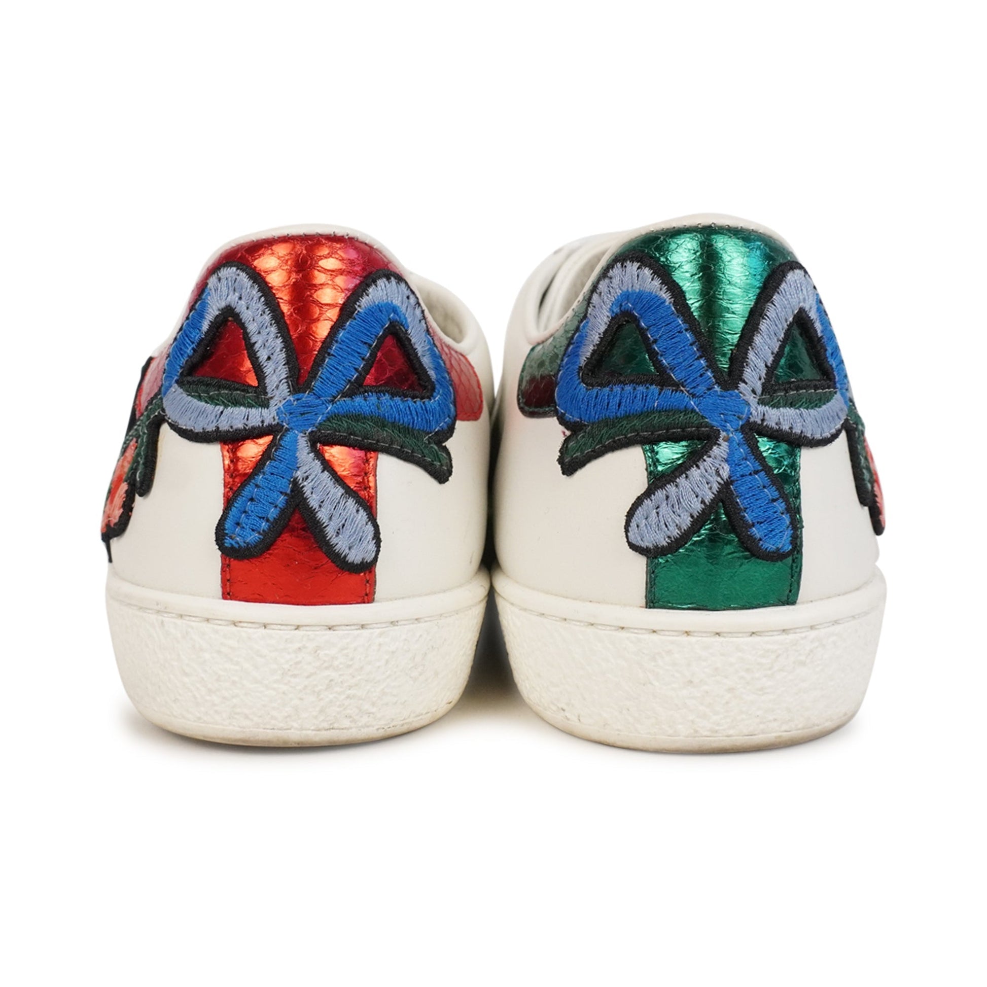 Gucci 'Ace' low-top sneakers in white leather with red and green cotton racing stripes on the sides. Features floral patches on the sides, embroidered bows on the red and green snakeskin embossed leather heel caps, and white flat laces.