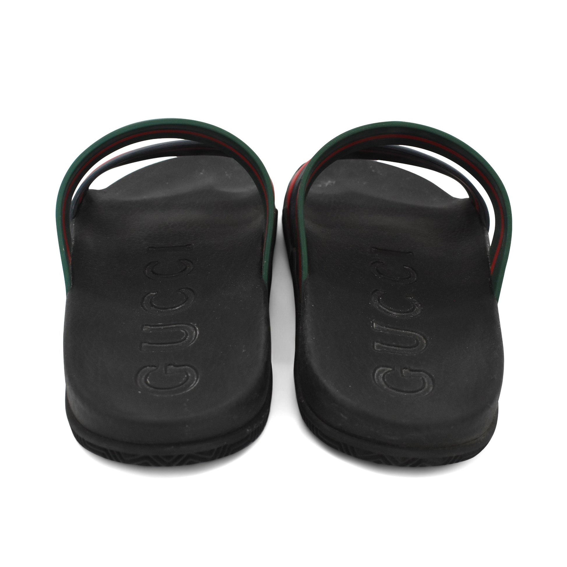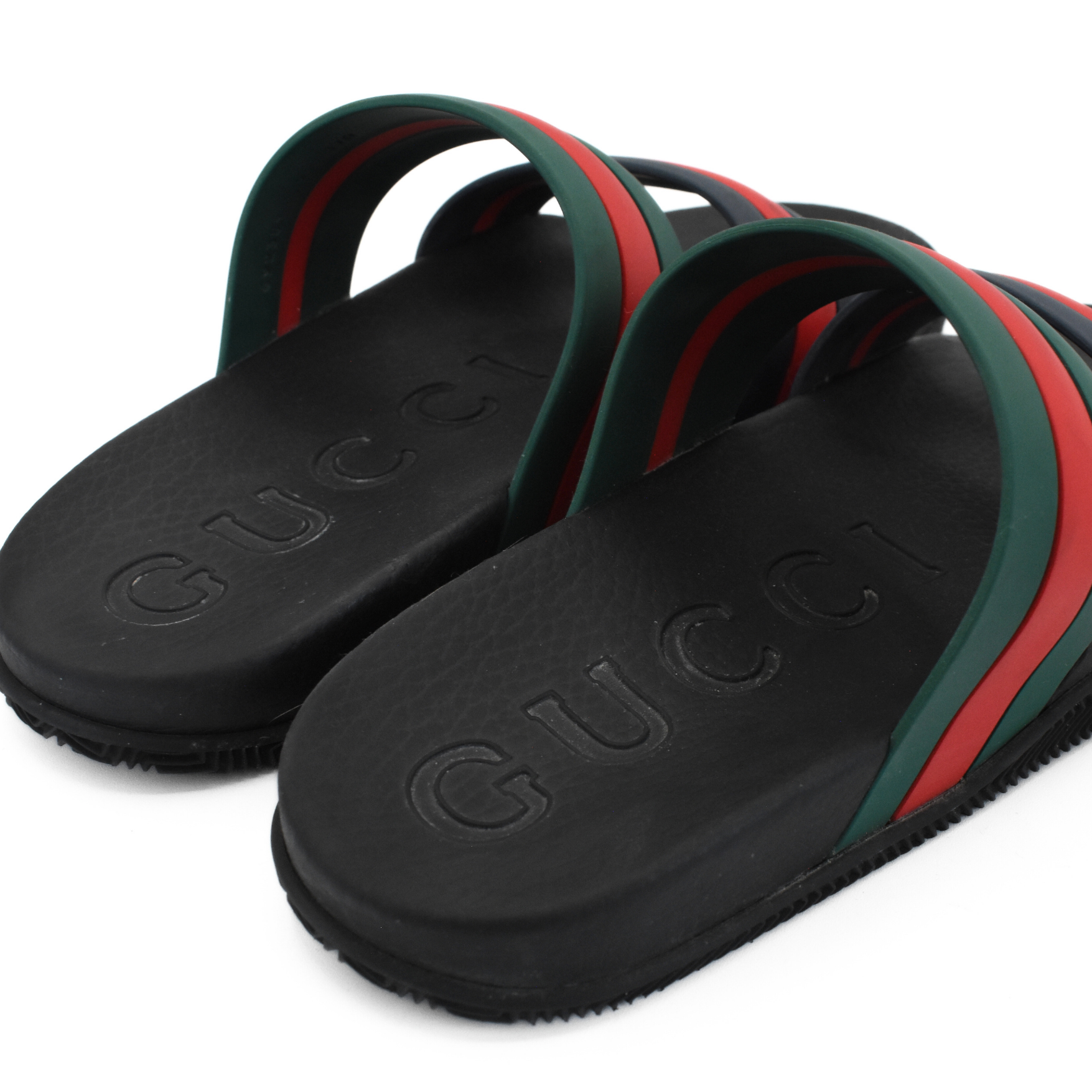 Gucci 'Agrado' sandals in black rubber with red, navy, and green dual straps.