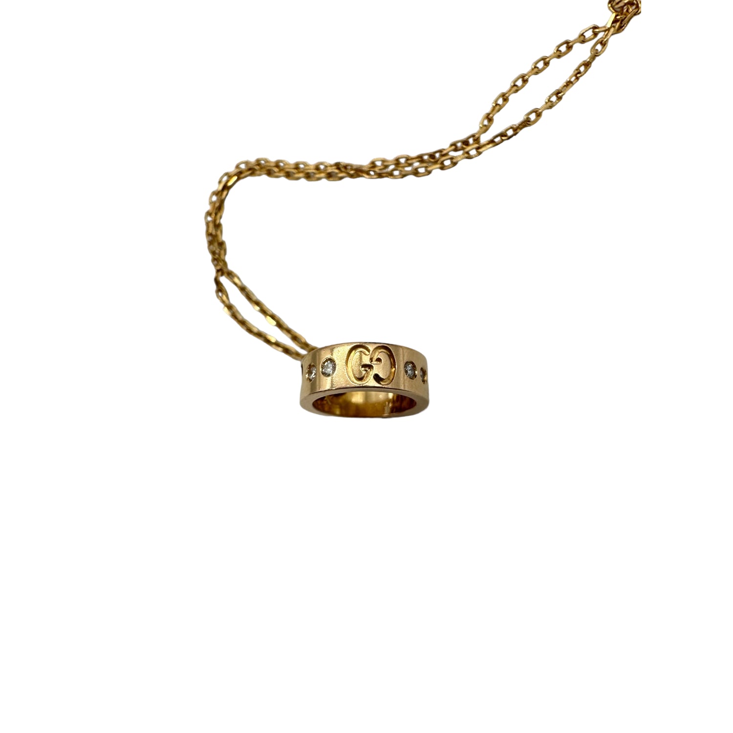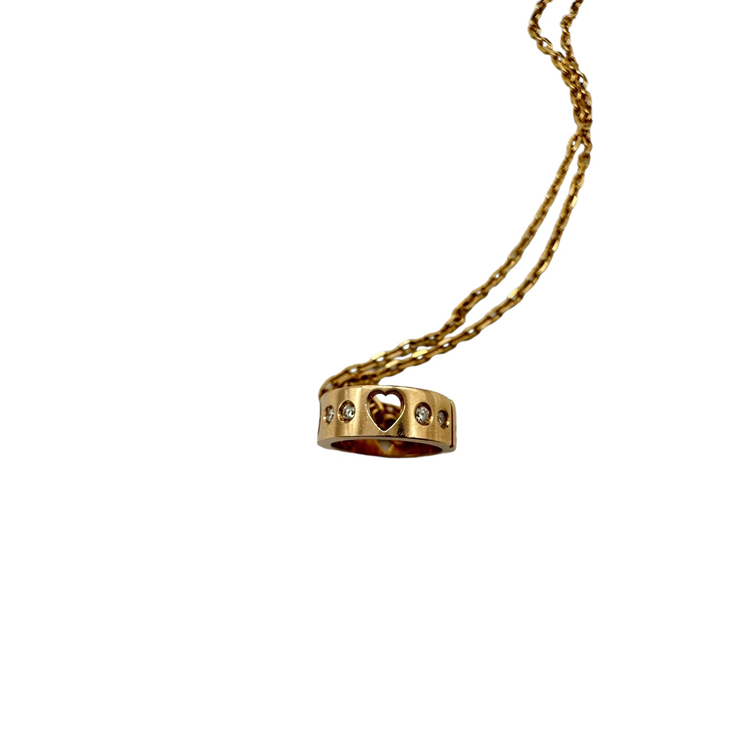 We are offering this beautiful 18k Yellow Gold & Diamond Gucci Amor pendant necklace. This piece has a delicate adjustable ring pendant with heart shaped cut outs and eight diamonds, all hanging from an 18in yellow gold chain.