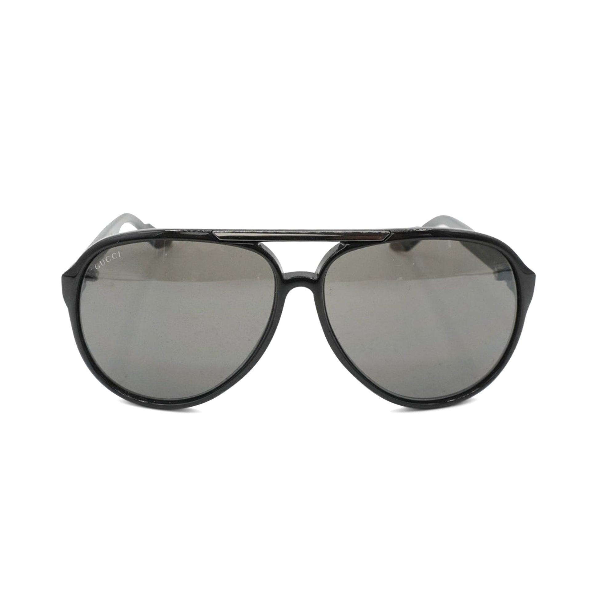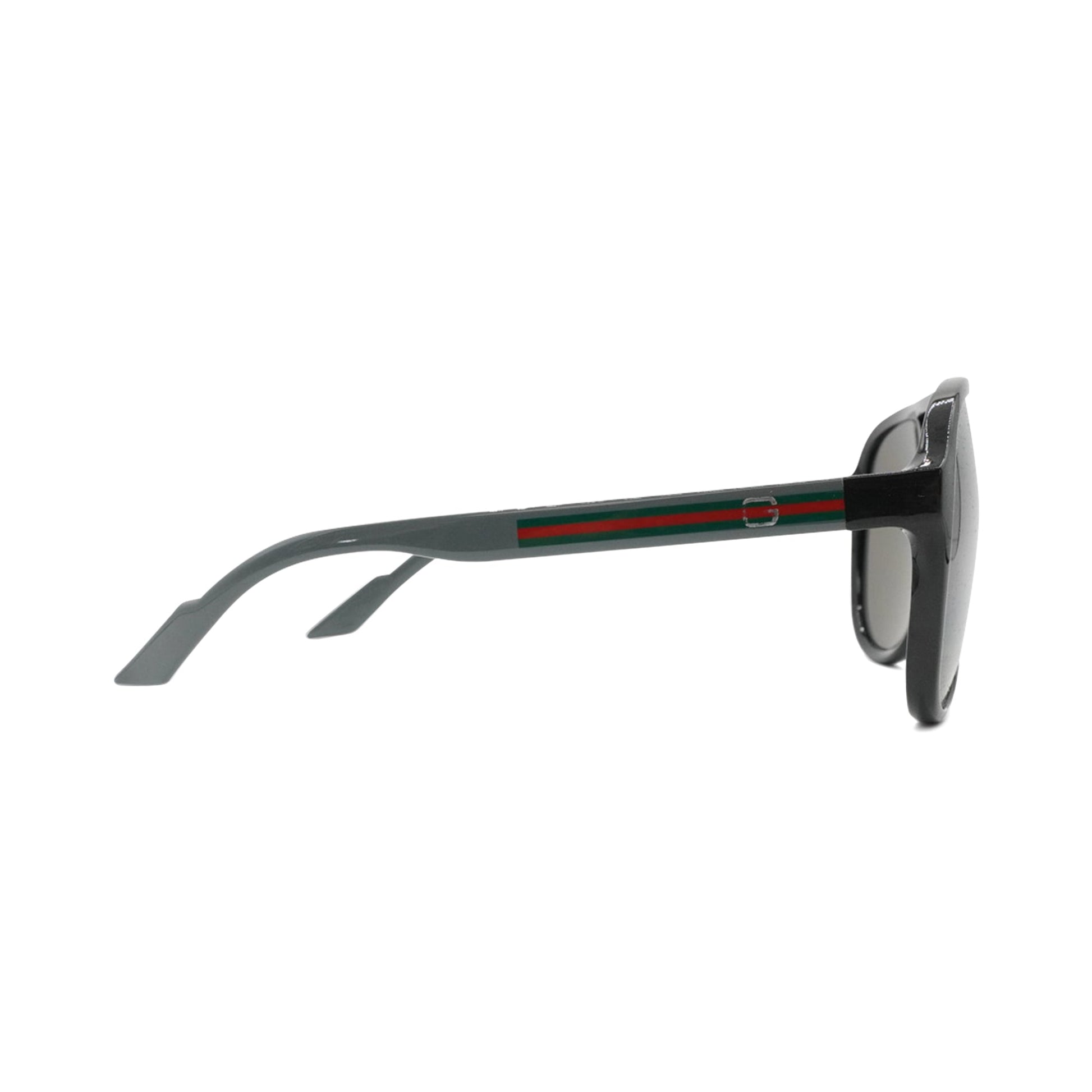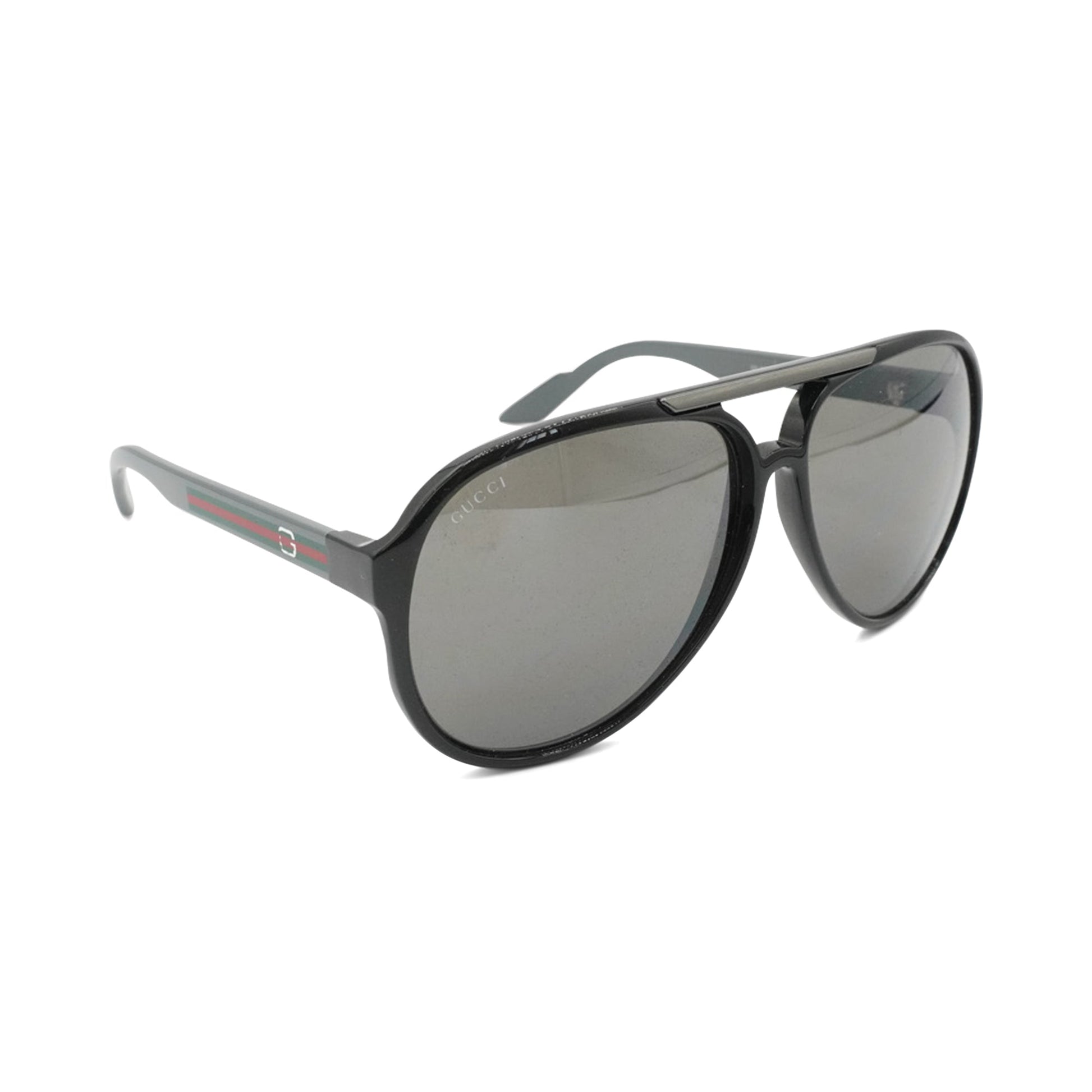 Gucci aviator sunglasses in black acetate with grey arms and red and green racing stripe detail.