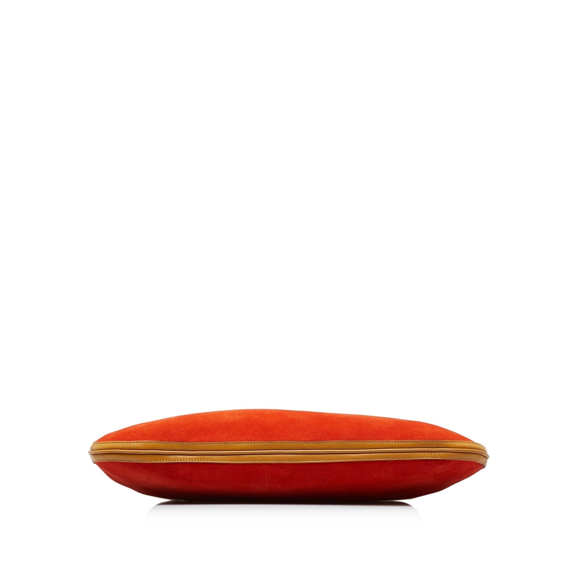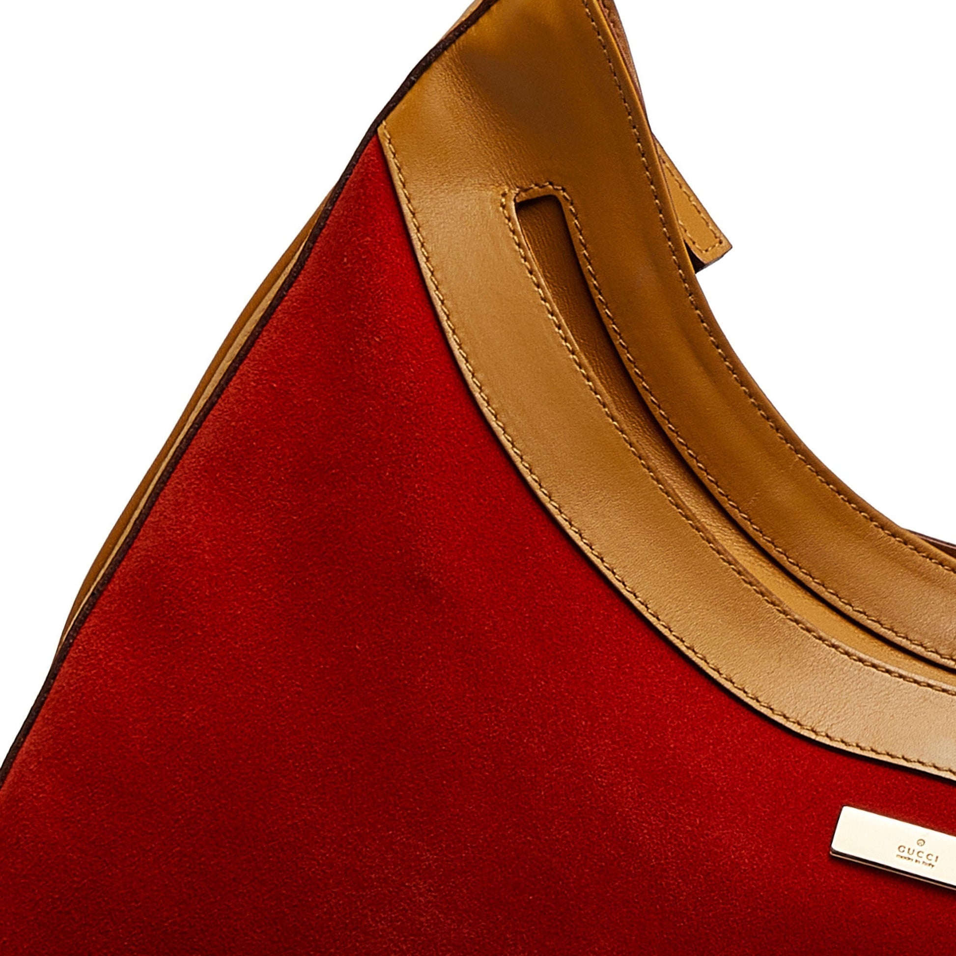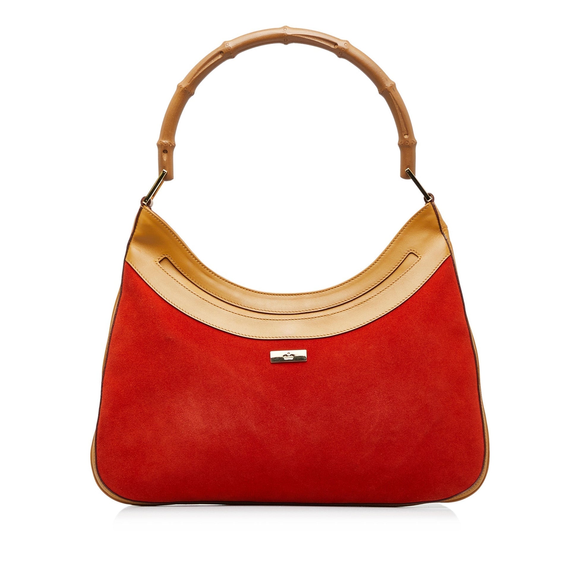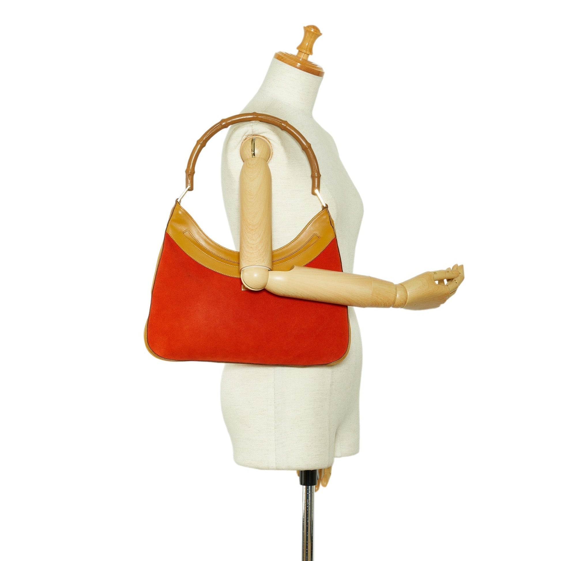 This shoulder bag features a suede body with leather trim, a bamboo handle, a top zip closure, and an interior zip pocket. Comes with dust bag