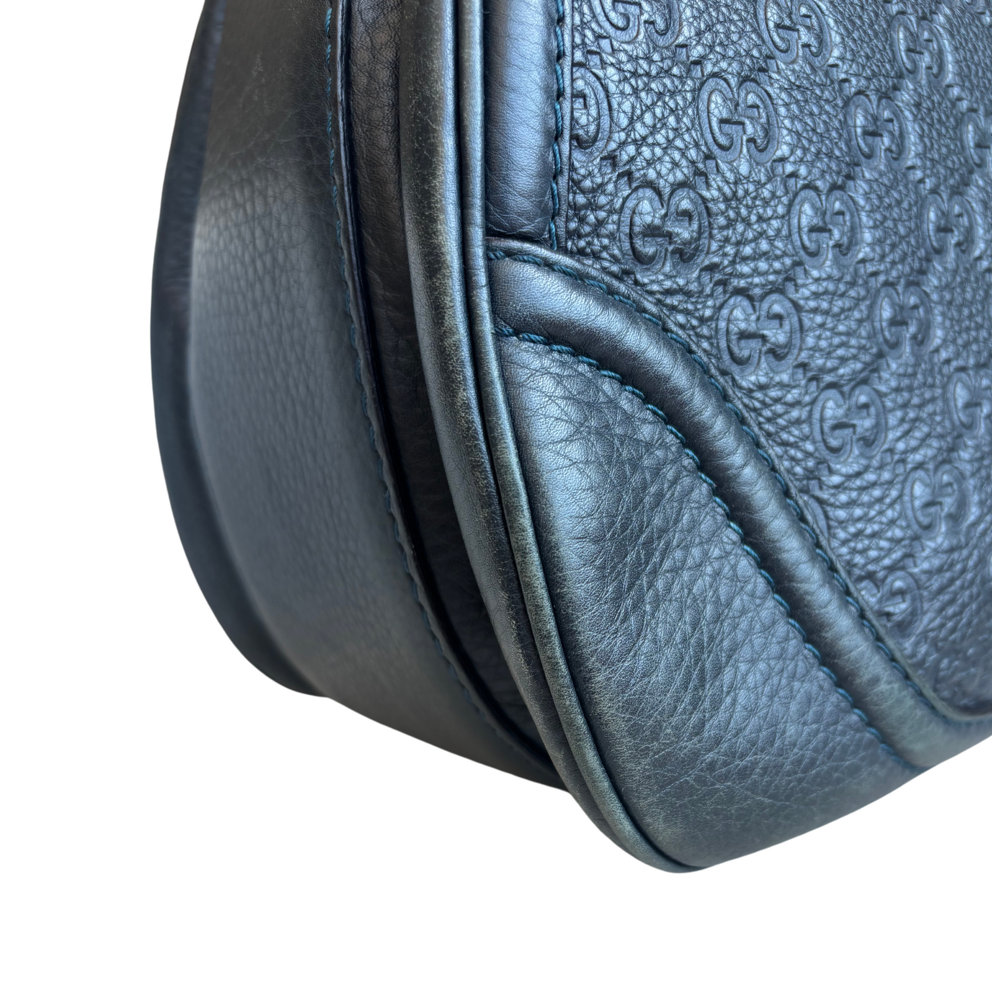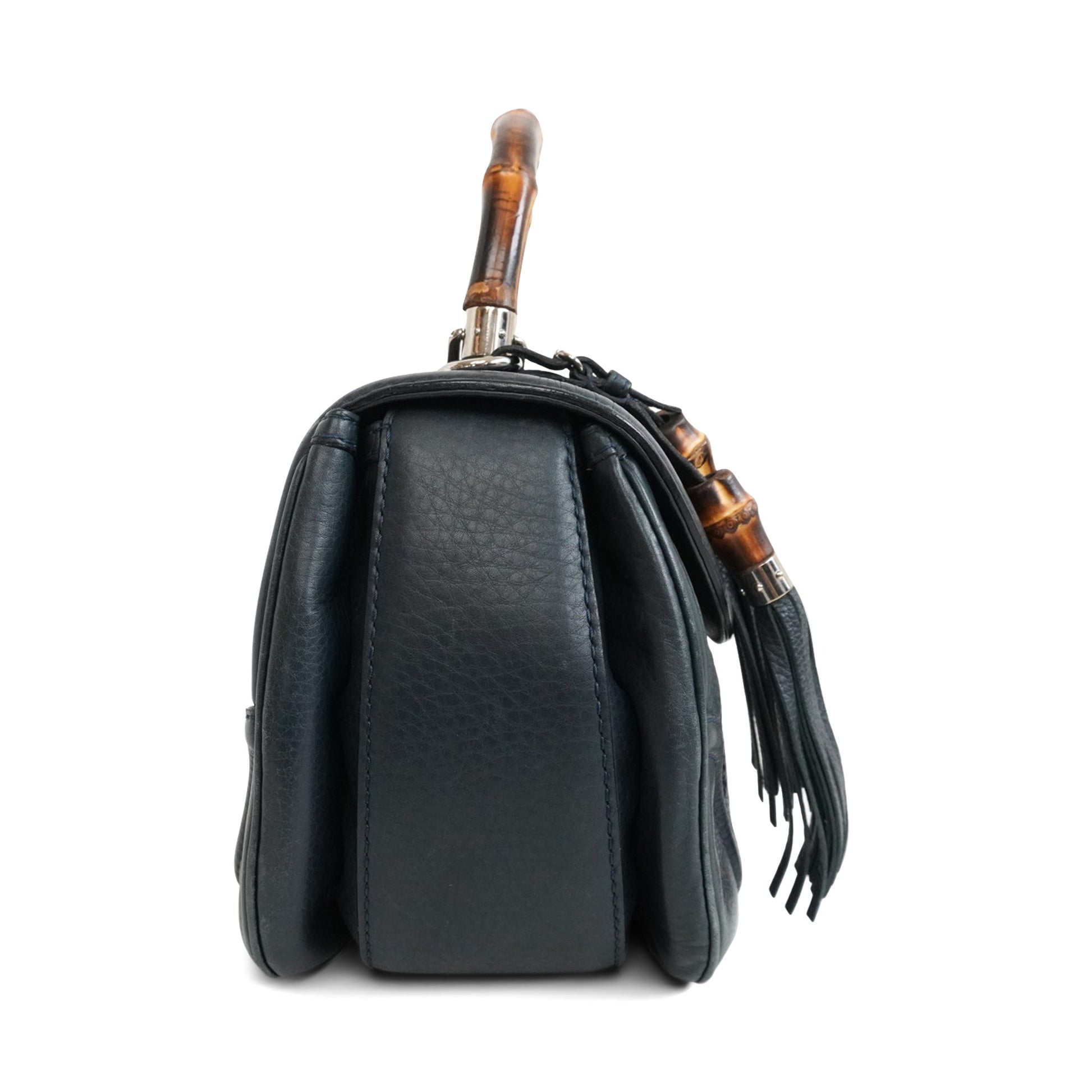 Gucci top handle bag in navy monogram embossed leather with a bamboo top handle, tassel charms, a top flap opening with a bamboo turn lock, and a beige canvas interior with zip and slip pockets. The bag includes a removable and adjustable shoulder strap with silver chain hardware.