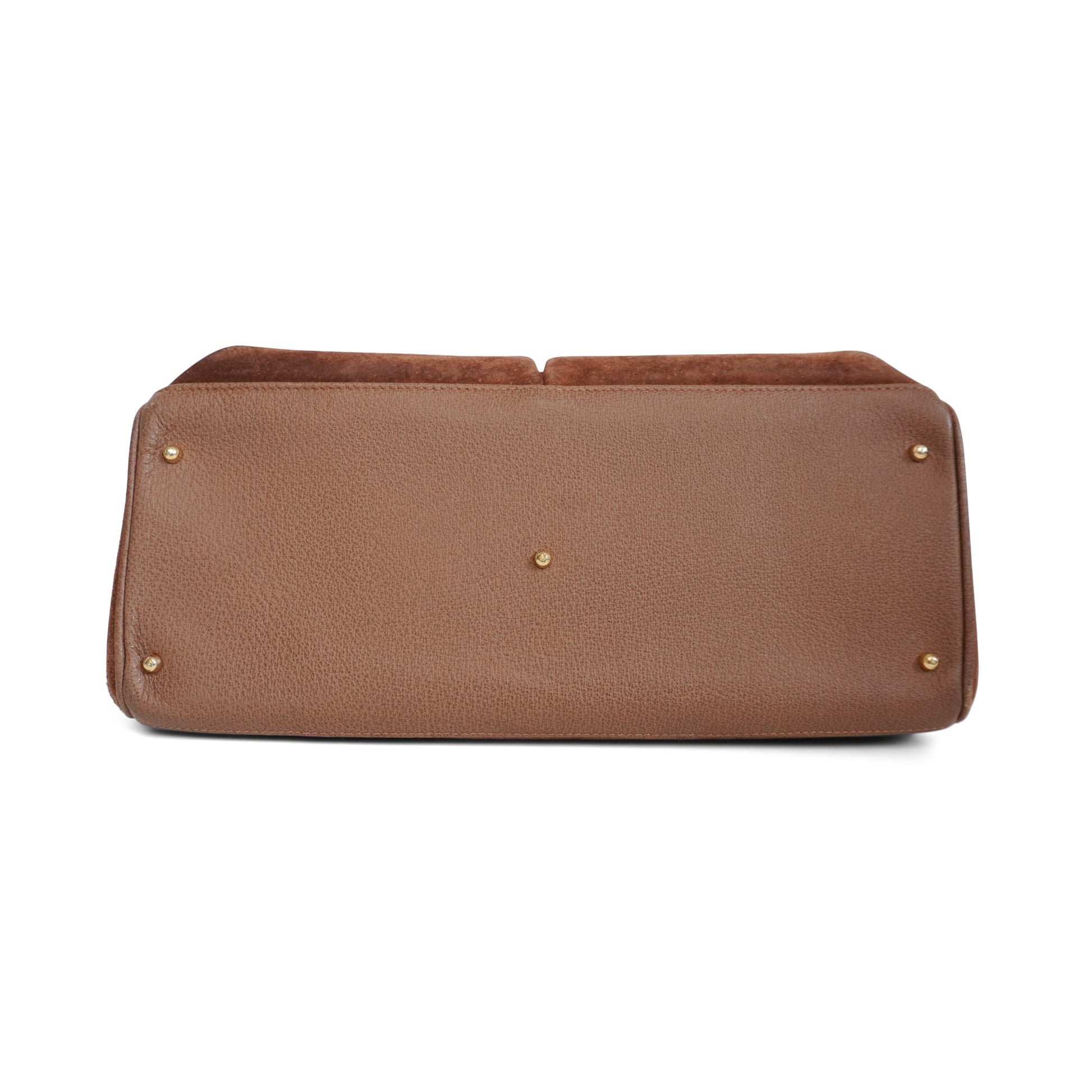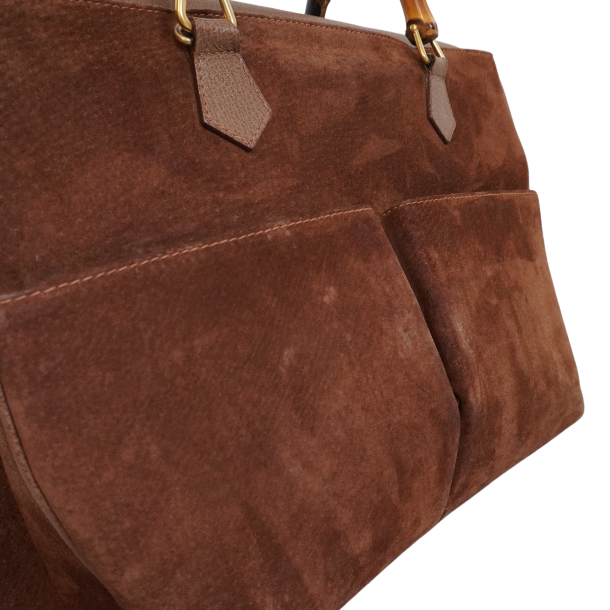 Gucci vintage tote bag in brown suede with leather trim and dual bamboo top handles with gold hardware. The bag has two large front slip pockets, a magnetic top snap closure, and a printed canvas lined interior with two main compartments and zip pockets.