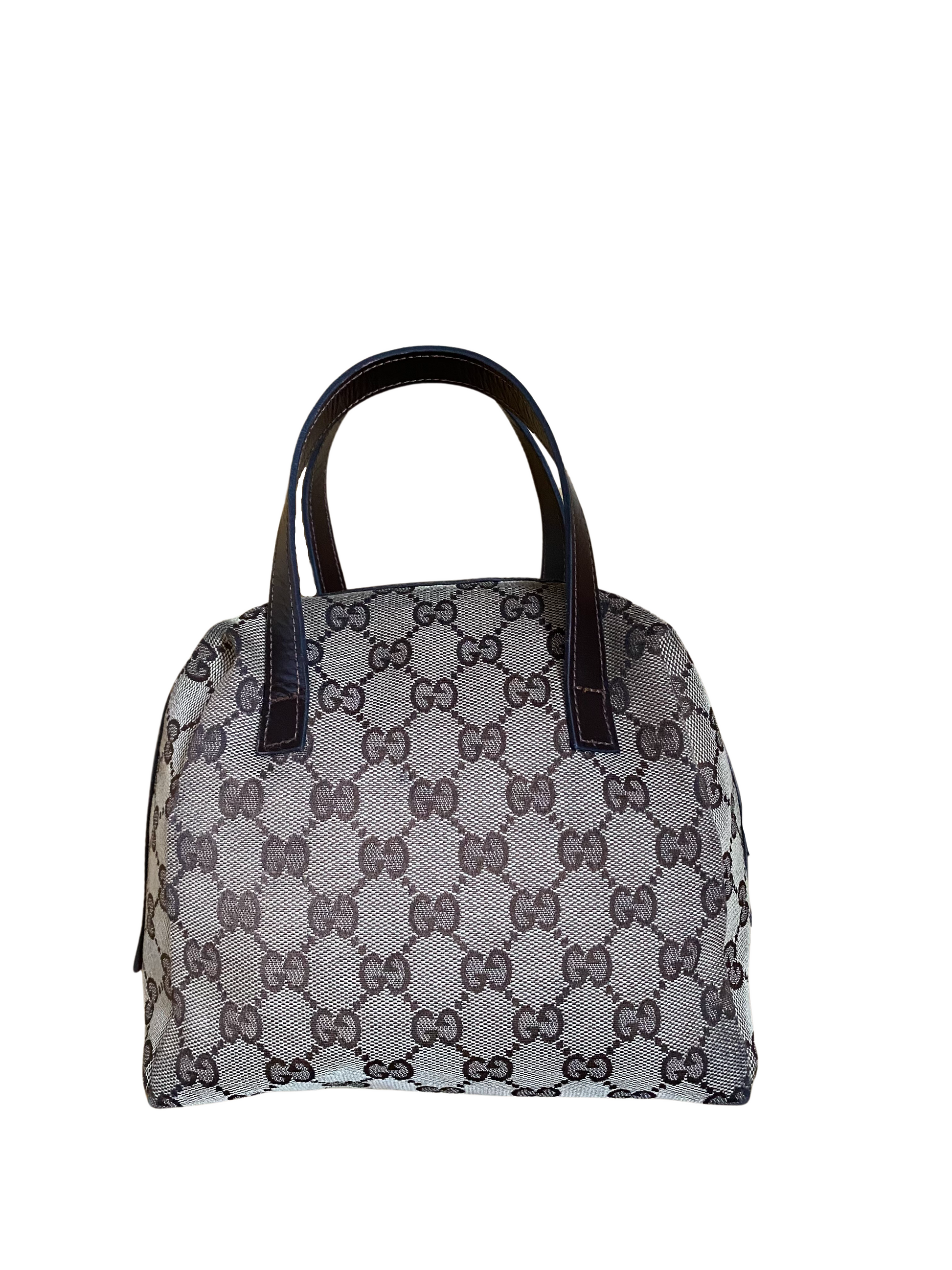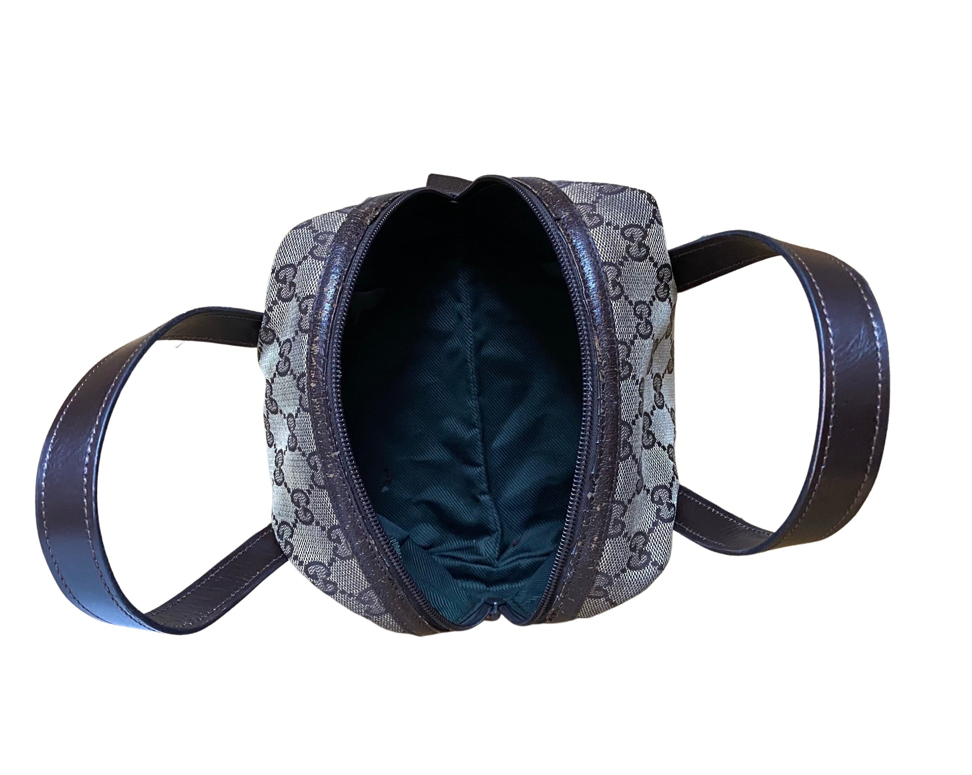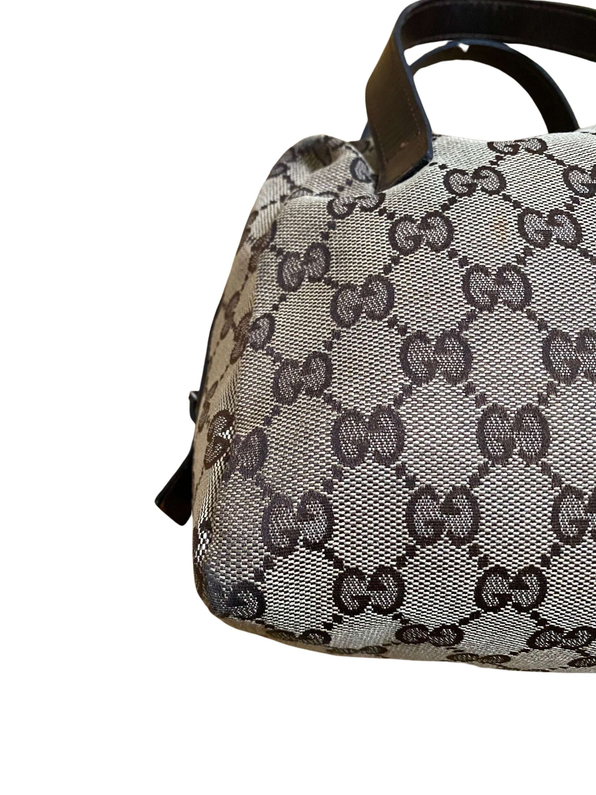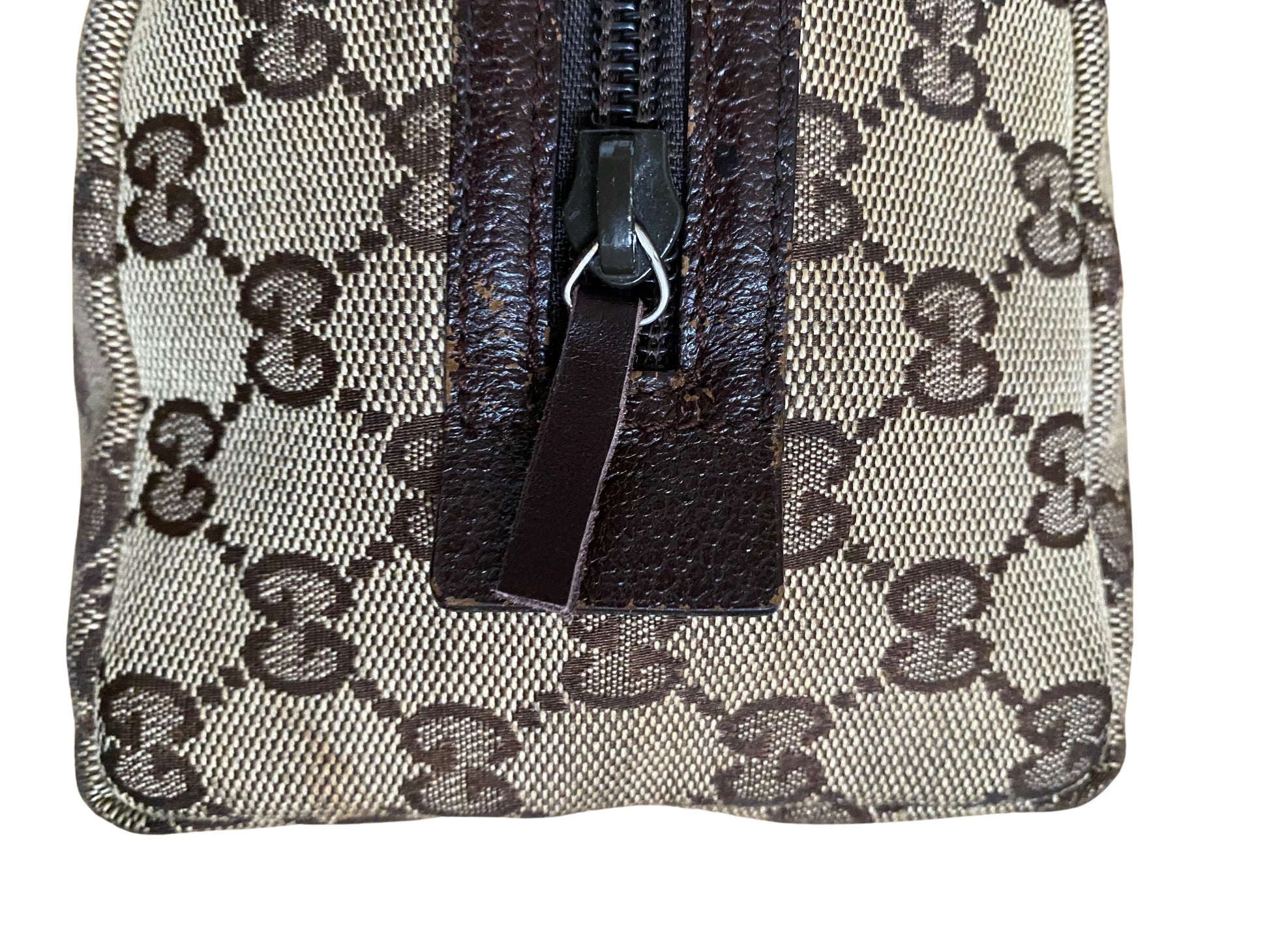 Gucci Beige & Dark Brown Jacquard & Leather Bag in fine condition with some signs of previous New and patina on canvas and leather. Specifically, the canvas has minor stains, and in general, the corners and canvas show signs of wear. Moreover, the leather handles have been redone and the small leather piece attached to the zipper. For this reason, these replaced leather piecesare not of Gucci origin.The inside is in new condition.