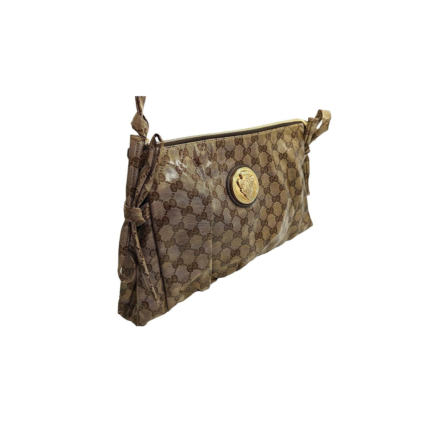 Carry your things in style with this sophisticated Gucci Beige/Ebony GG Crystal Hysteria Clutch Bag. It features glossy 'crystal' ted canvas with bow details on the sides and a large gold-tone Gucci crest logo. A glamorous piece to add to any collection.