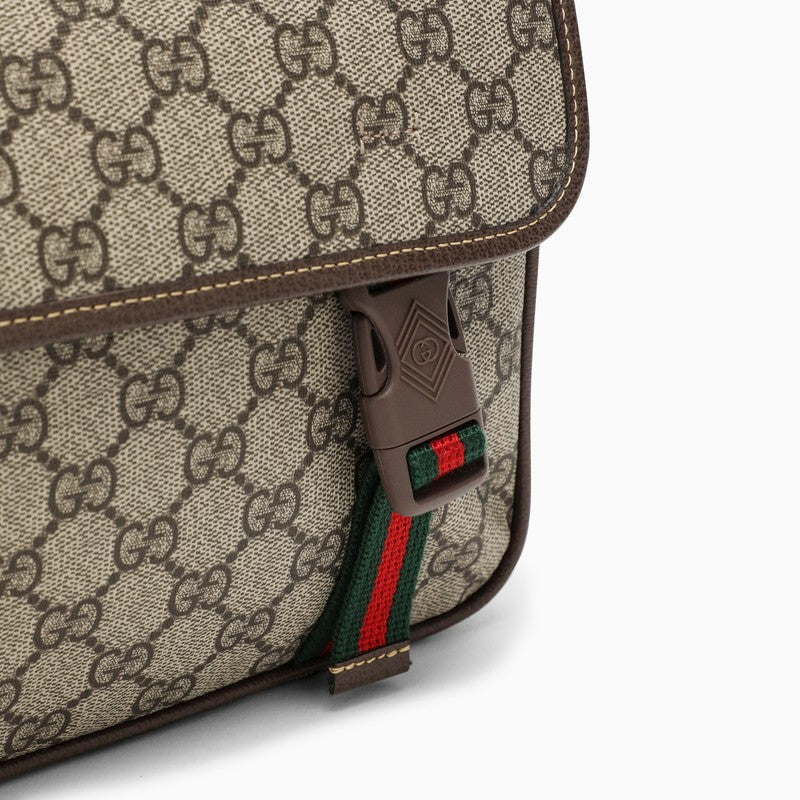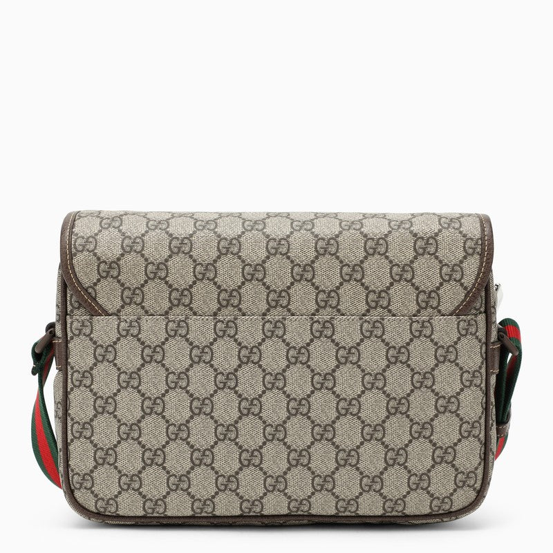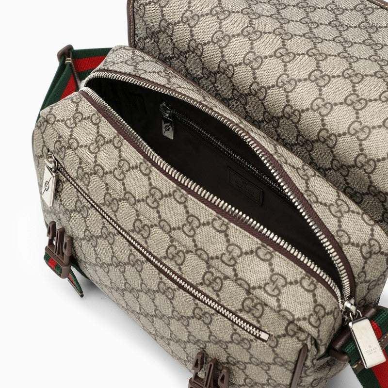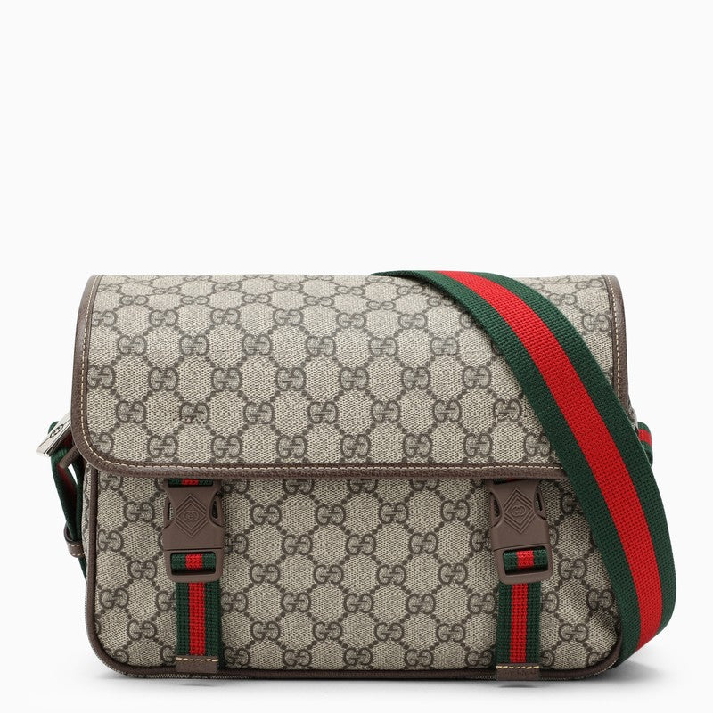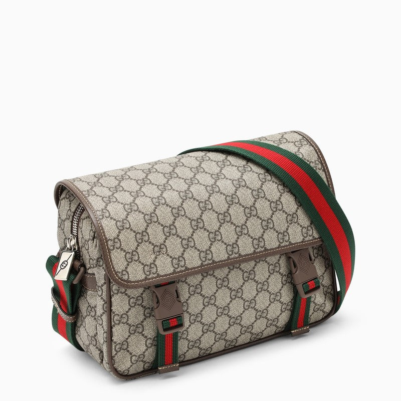 Gucci messenger bag made of beige cotton canvas, featuring GG Supreme fabric, green/red/green web insert, flap and snap hook closure, fabric shoulder strap, top zip closure and two zipped pockets. Width 27 cm x Height 20 cm x Depth 10 cm Adjustable shoulder strap length min 85 cm - max 110 cm