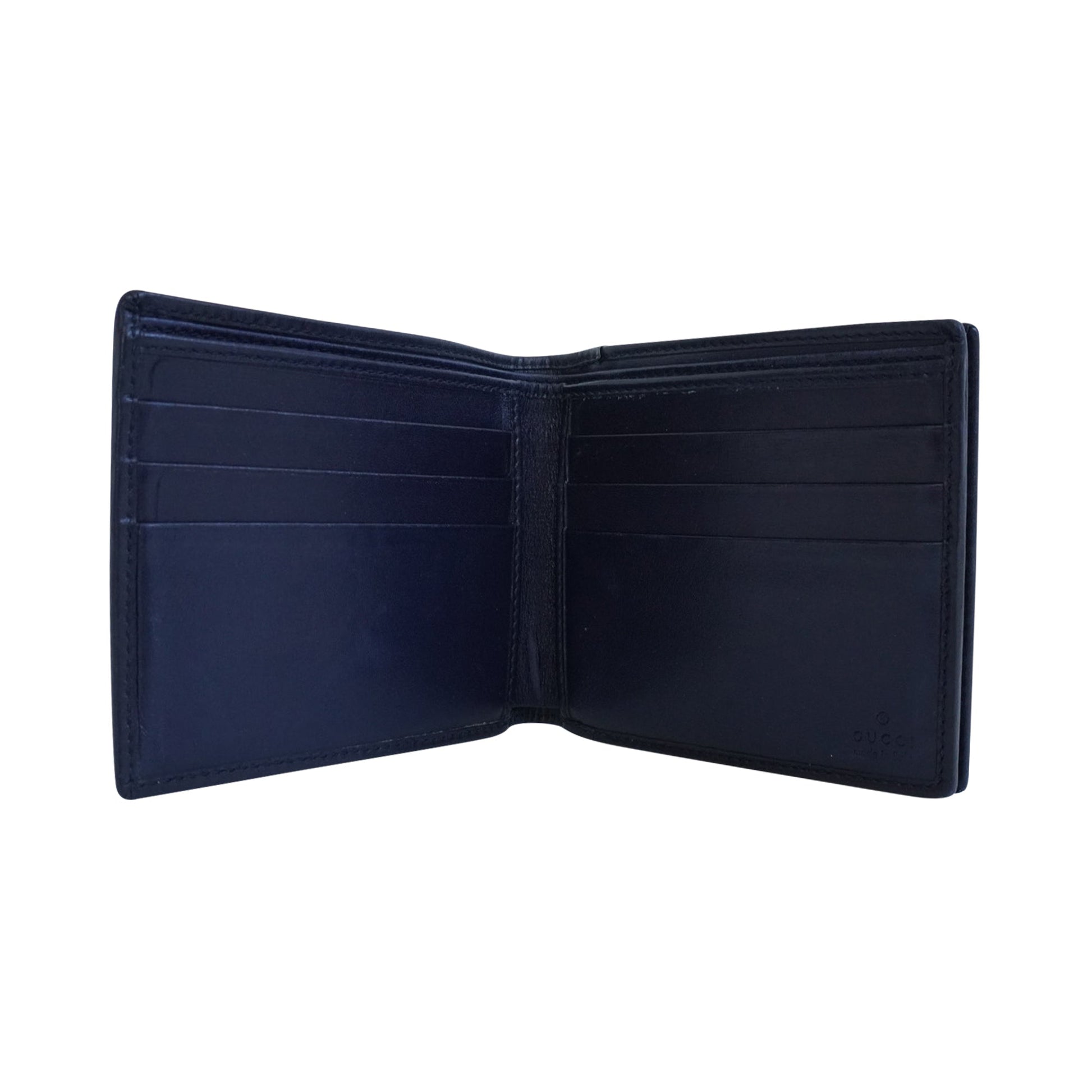 Gucci bifold wallet in navy and grey monogram canvas with navy leather trim and lining. Features navy-red racing stripe webbing down the spine with a silver D-ring at the base. The wallet has 8 card slots and 2 cash pockets