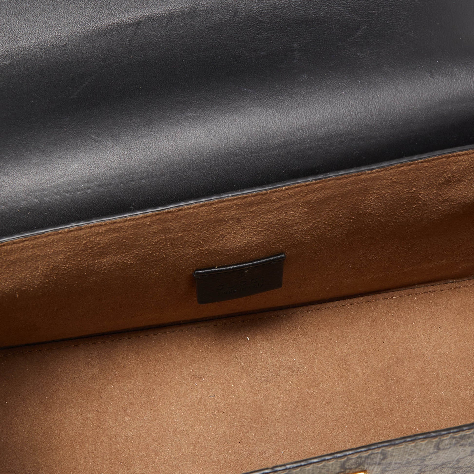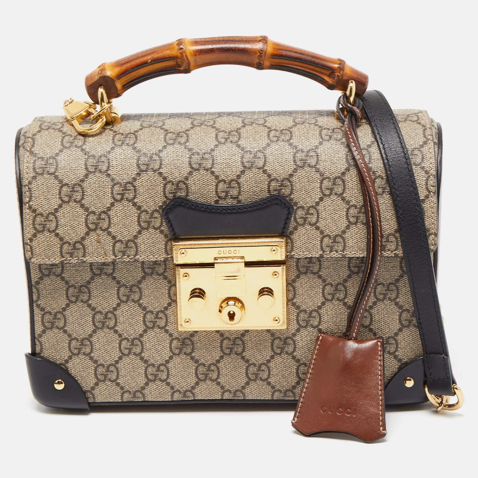 GUCCI Black/Beige GG Supreme Canvas Small Padlock Bamboo Top Handle Bag