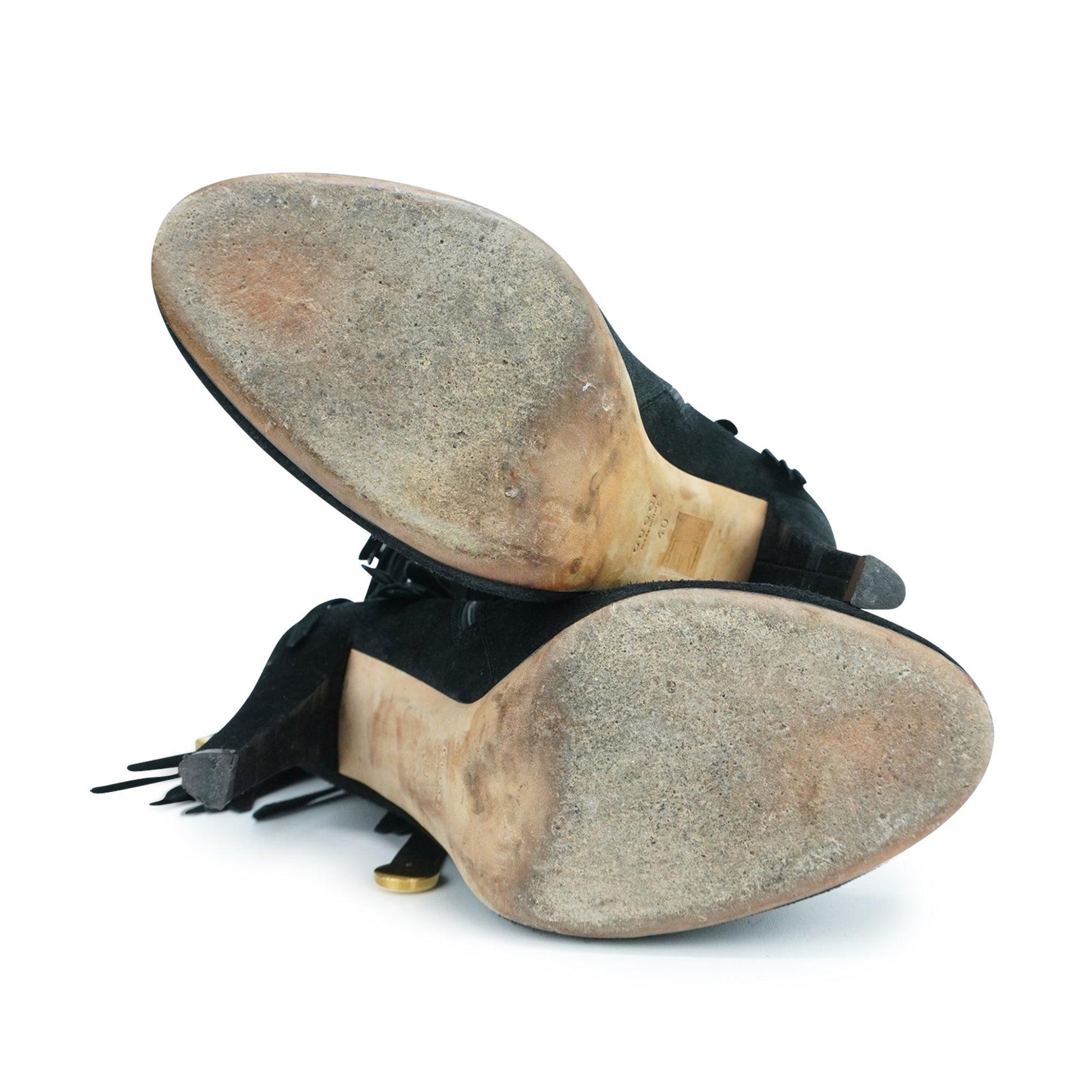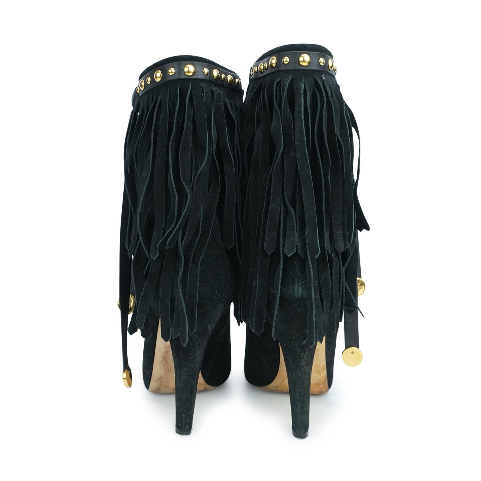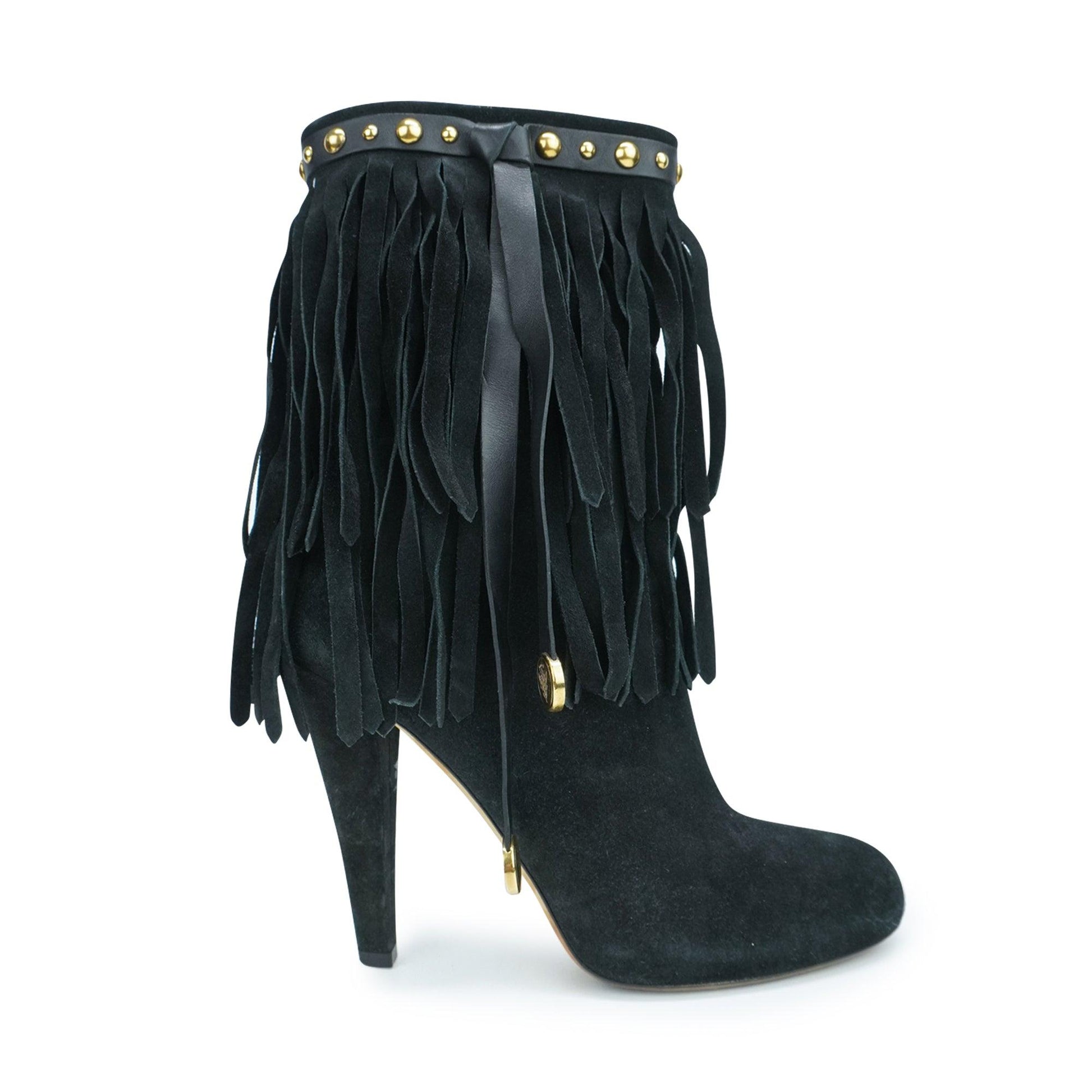 Gucci calf high pointed-toe heels in black suede with fringe and stud detailing on the trim. Features a side zip closure and a stiletto heel. Includes box.