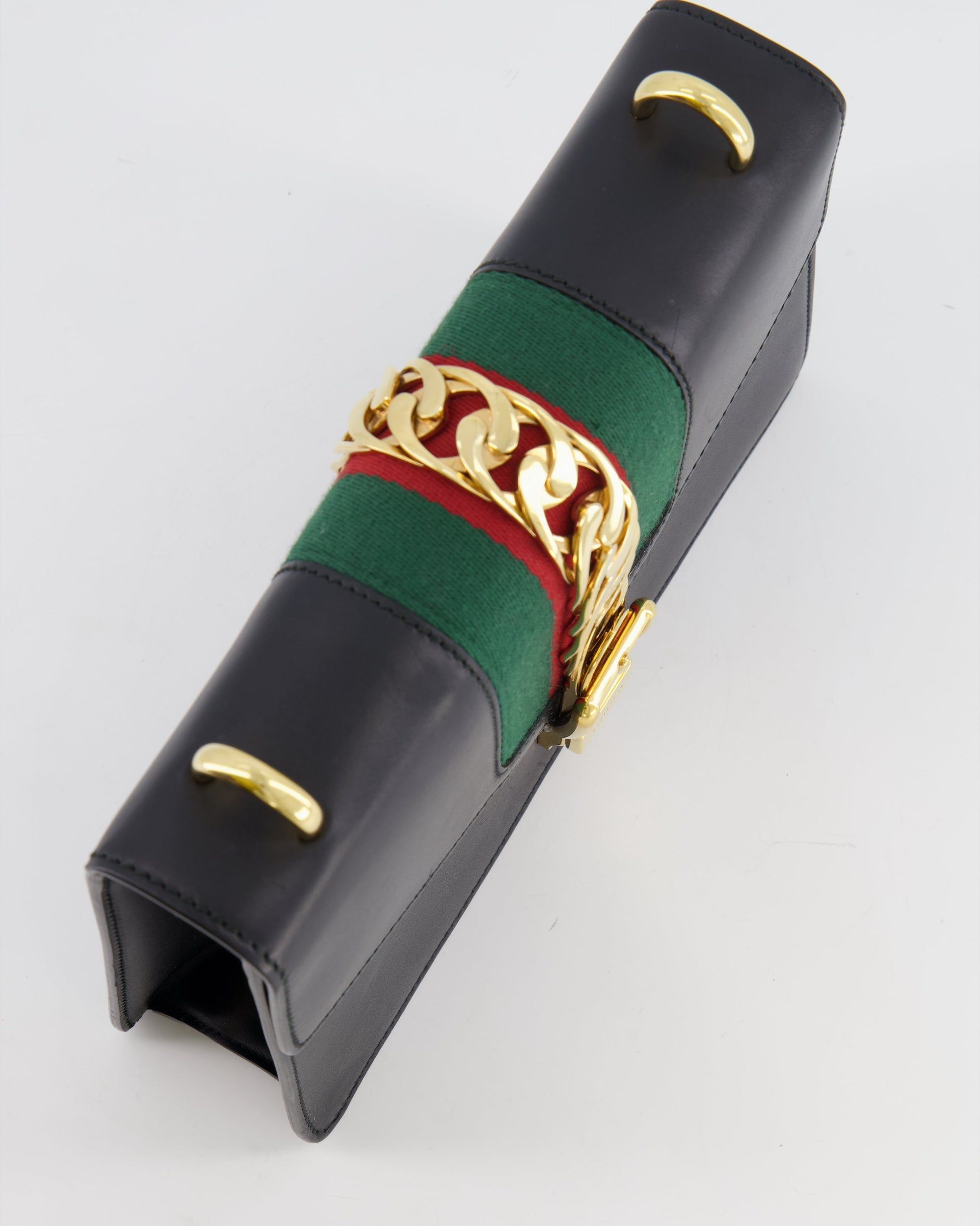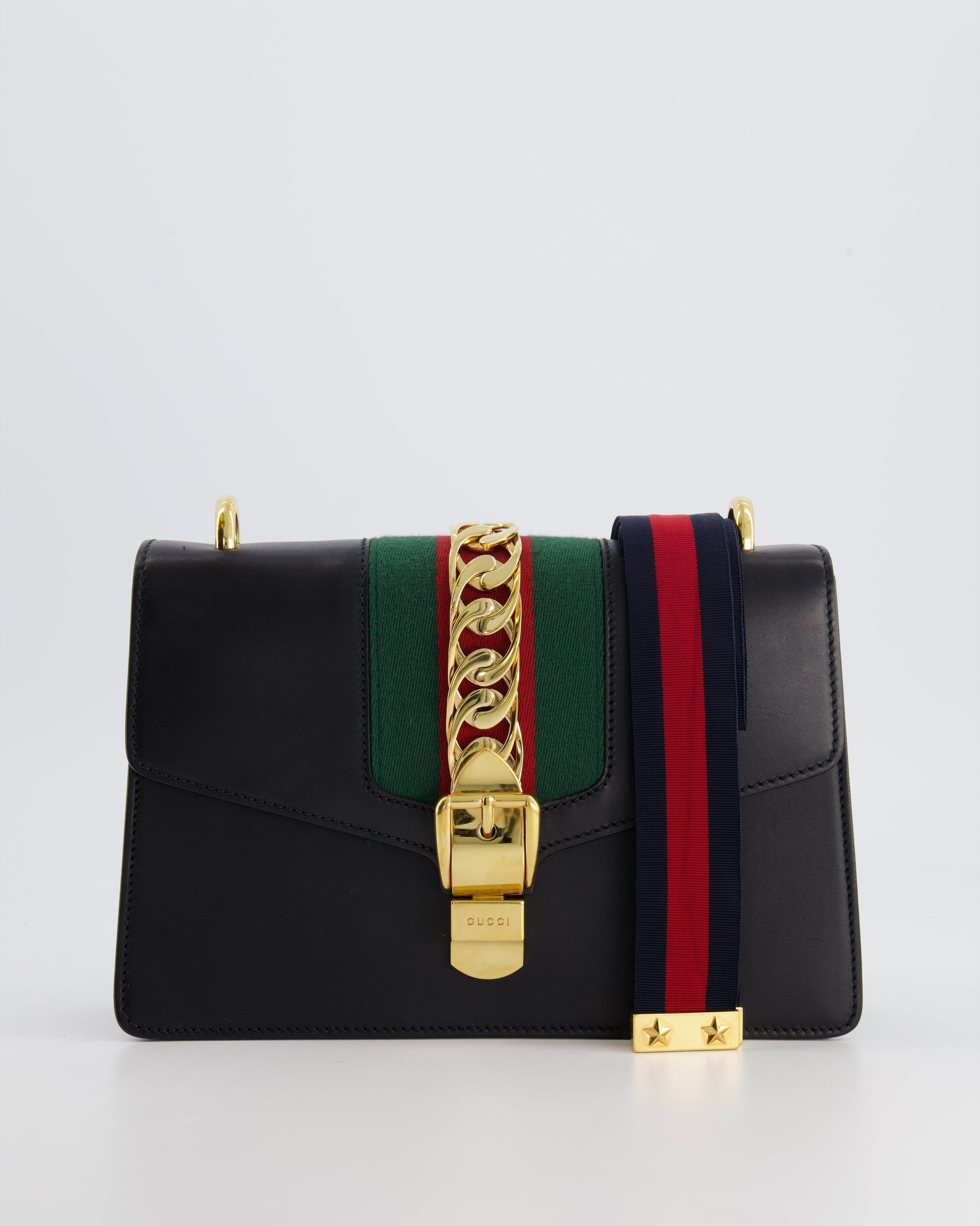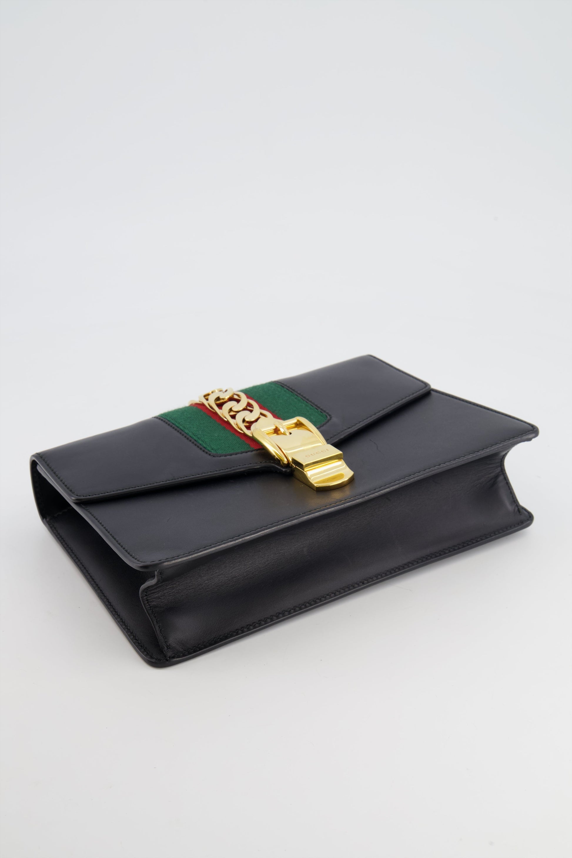 Gucci Black Leather Small Sylvie Bag Canvas with Gold Hardware and Canvas Strap