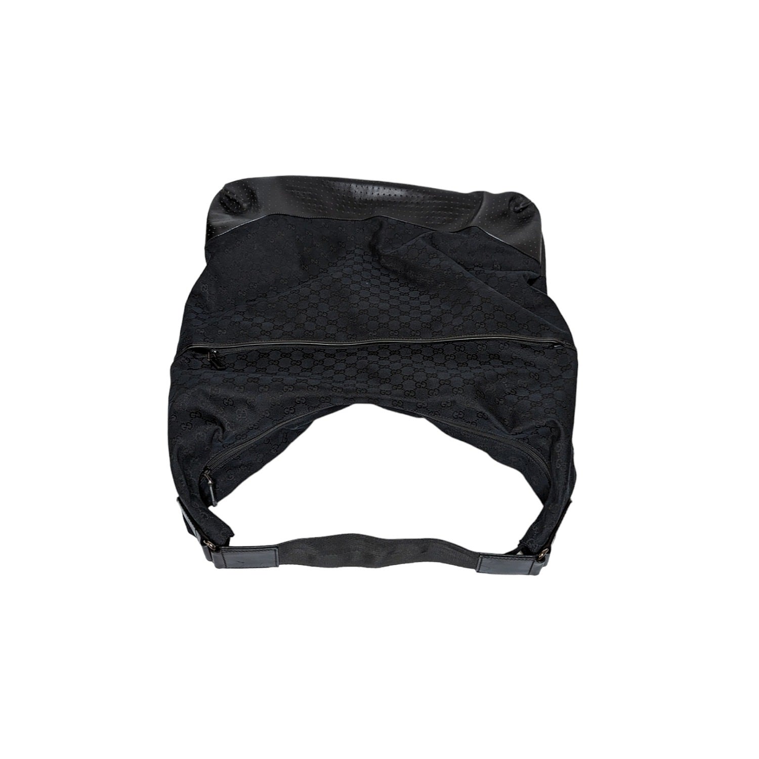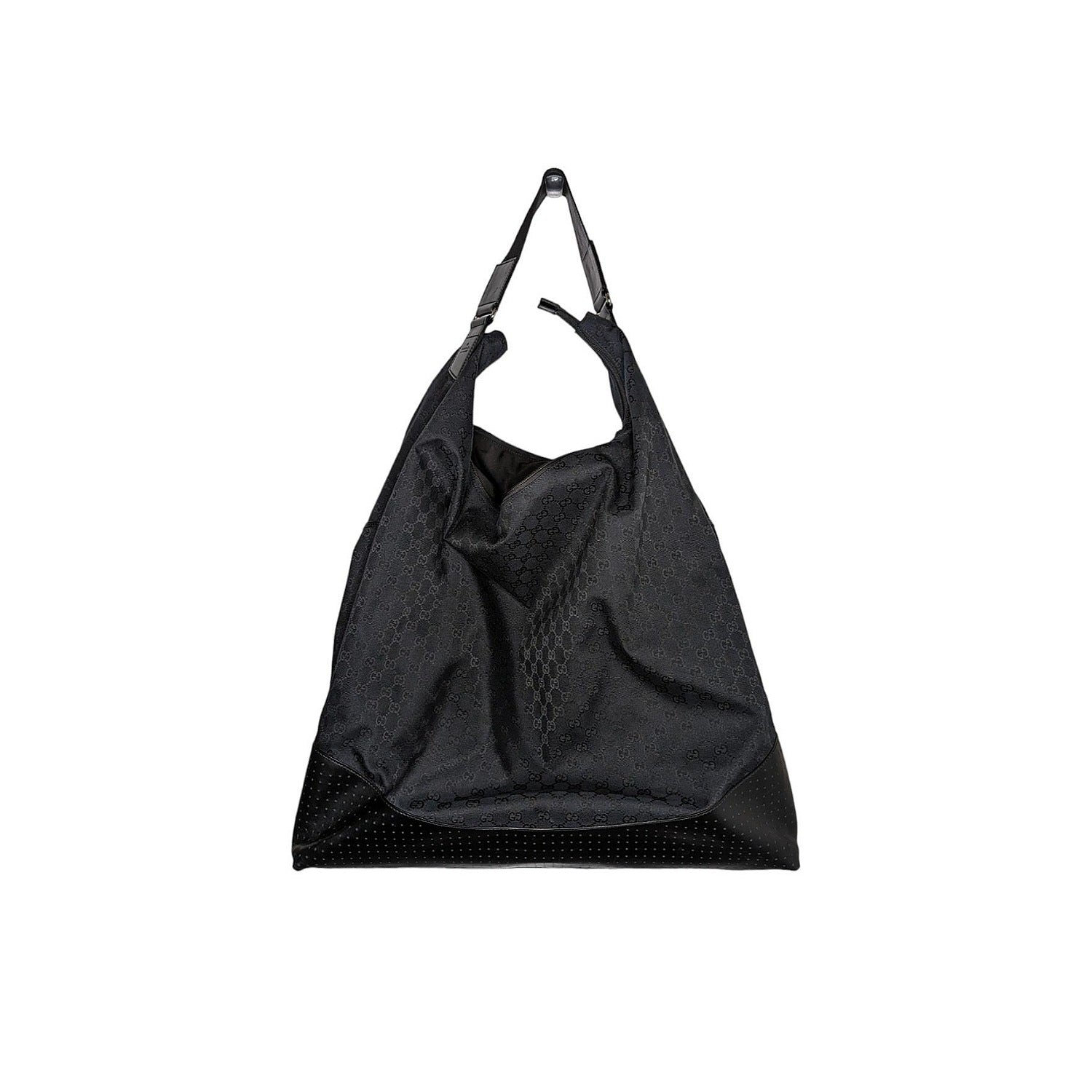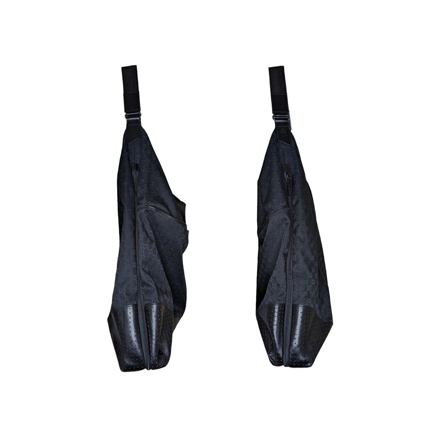 This Gucci travel garment hobo is beautifully crafted of sizable black Gucci monogram GG nylon. It has a sturdy leather trim and nylon shoulder strap with silver hardware. The top zipper opens to a fabric interior. Plenty of compartments and pockets to store your clothes and travel essentials.