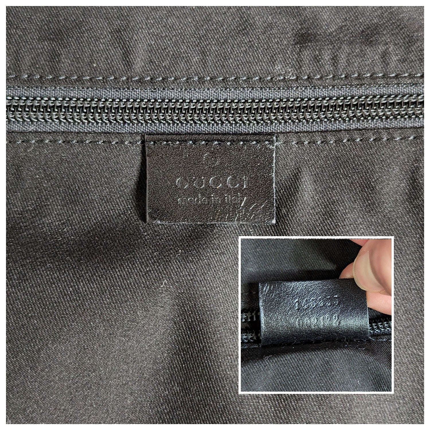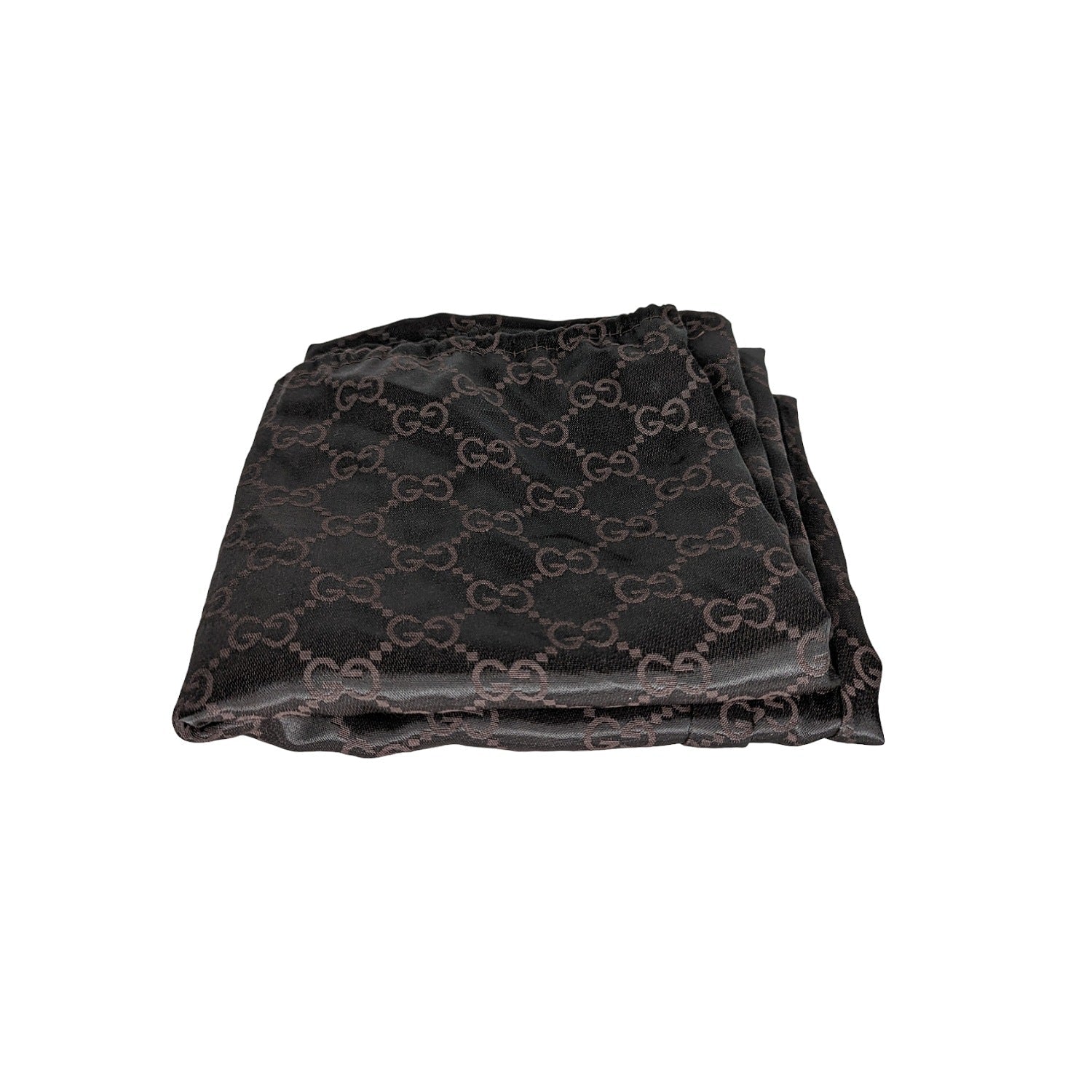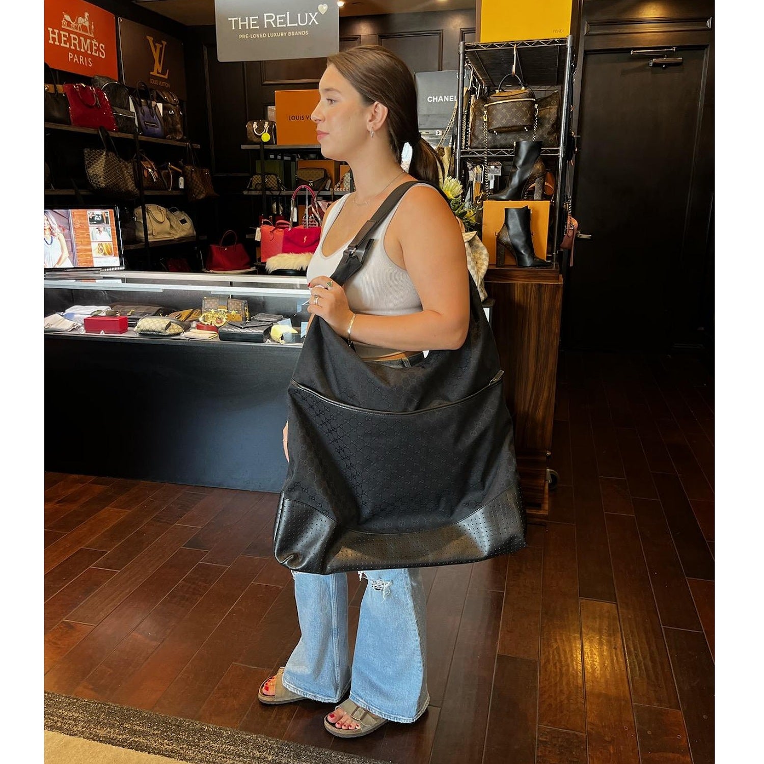This Gucci travel garment hobo is beautifully crafted of sizable black Gucci monogram GG nylon. It has a sturdy leather trim and nylon shoulder strap with silver hardware. The top zipper opens to a fabric interior. Plenty of compartments and pockets to store your clothes and travel essentials.