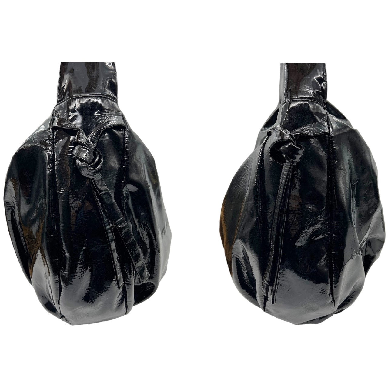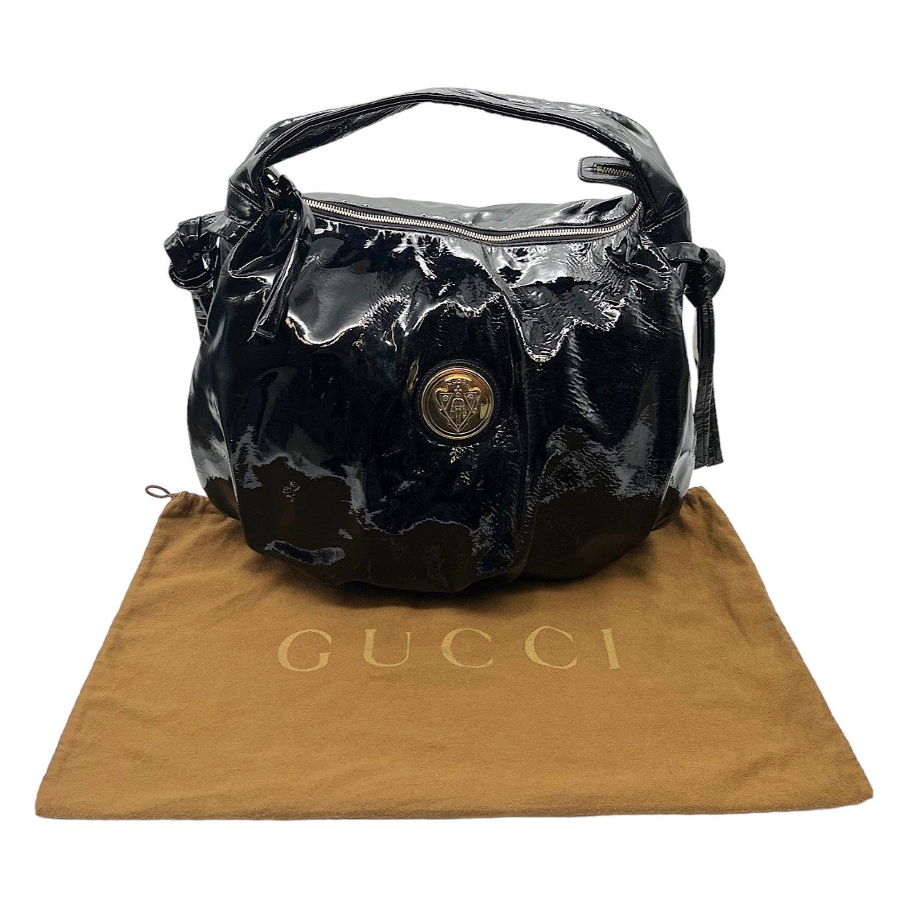 We are offering this black Gucci Hysteria handbag. Made in Italy, this handbag is finely crafted of a black patent leather exterior with a very beautiful vintage Gucci logo emblem in gold-tone hardware. It has a flat patent leather handle and it has a zipper closure that opens up to a spacious interior with the Gucci signature jacquard fabric lining with a single zipper pocket and another small pocket.