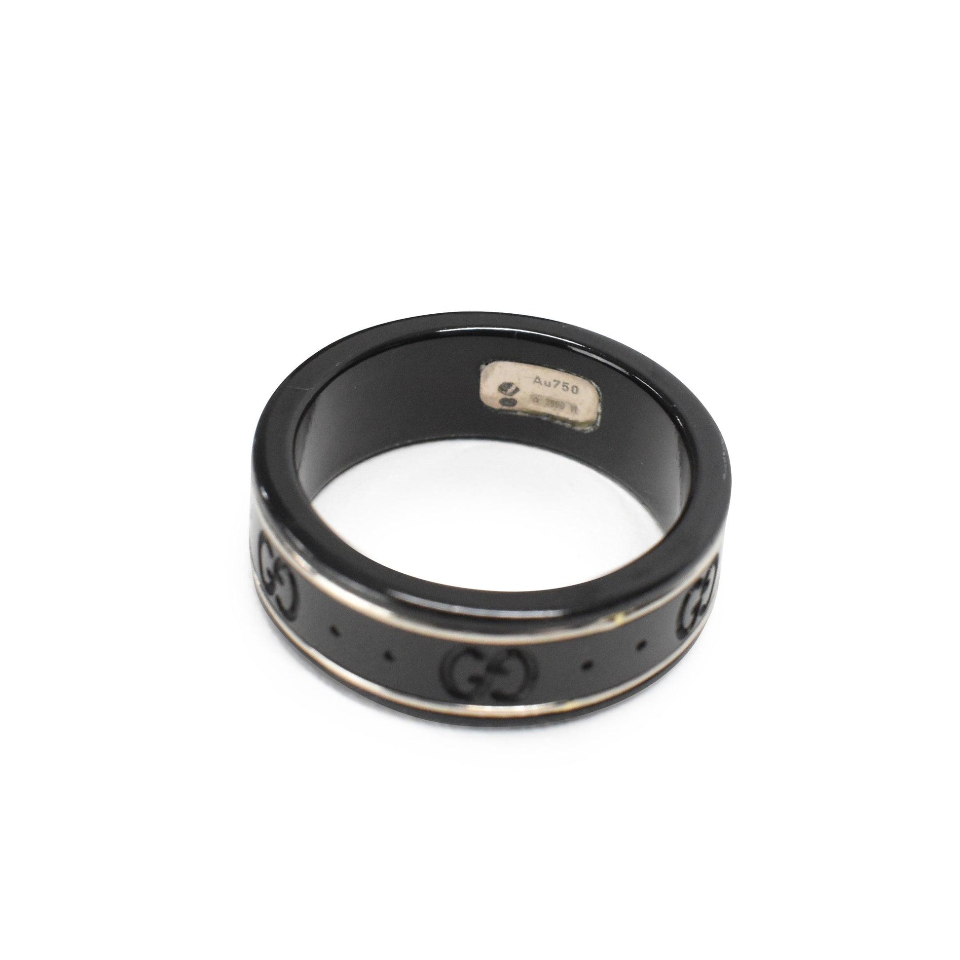 Gucci 'Icon' Ring in black metal with GG logo engraving and a thin silver stripe.