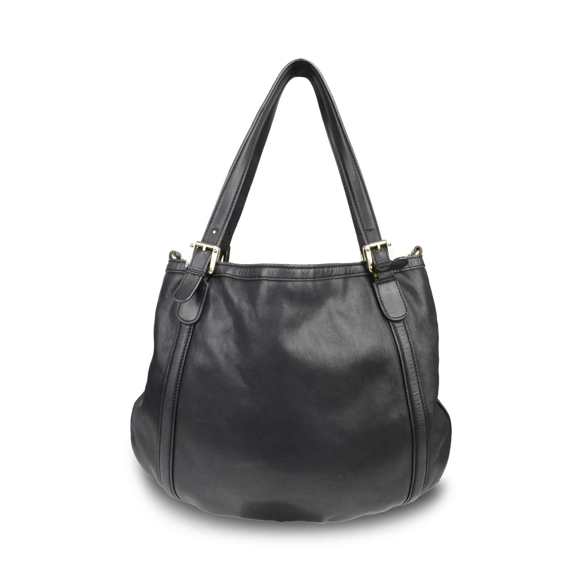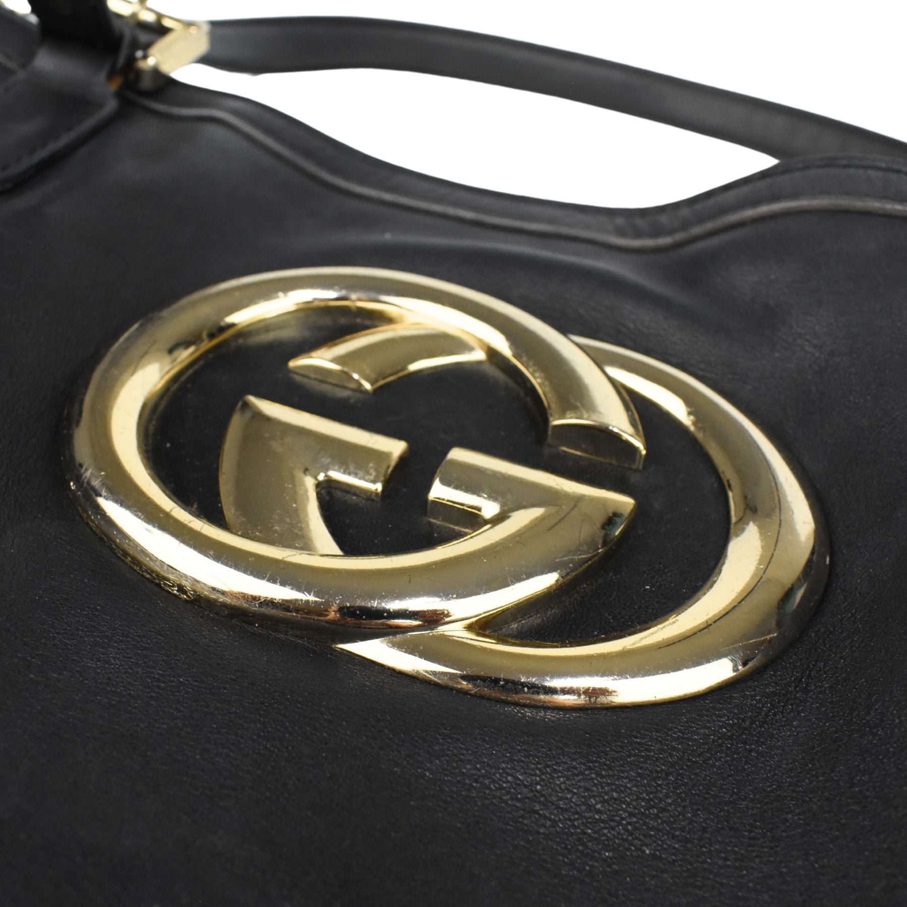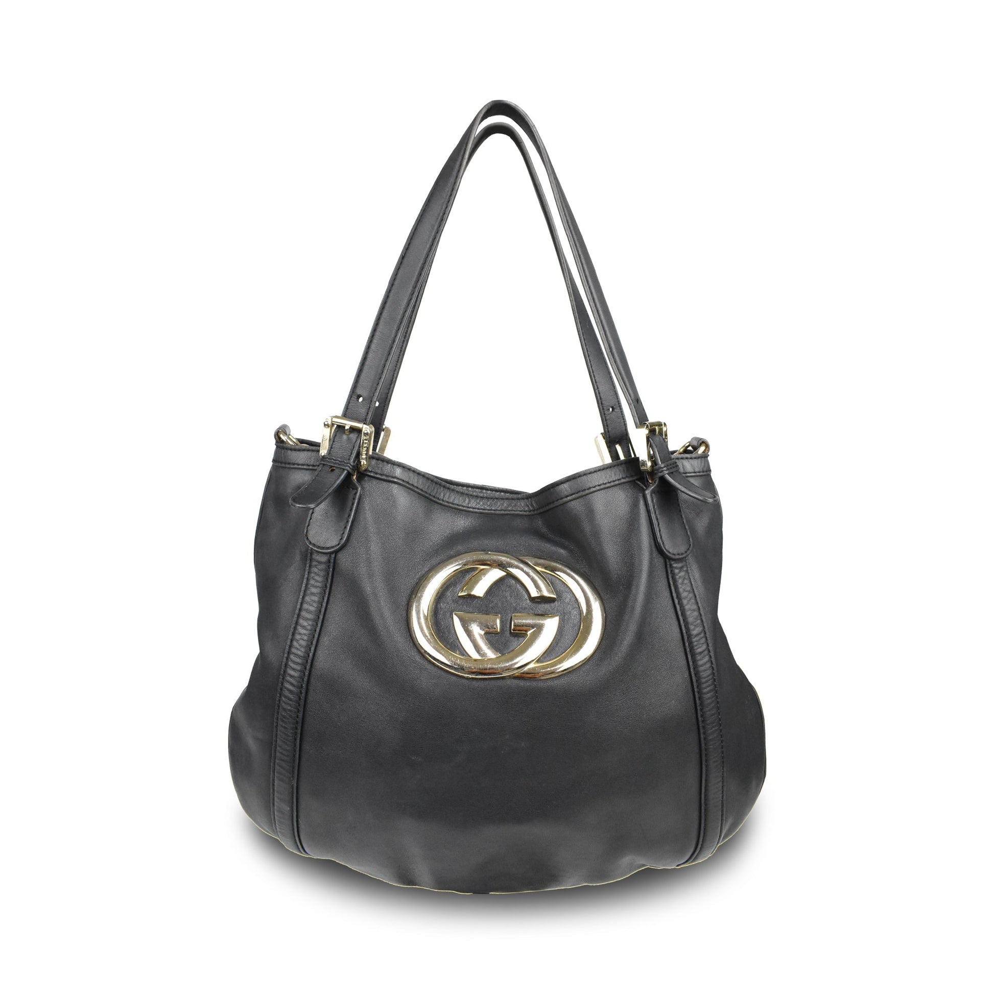 Gucci 'Britt' hobo bag in black smooth leather with with a large GG plaque in gold hardware. Features dual top buckle handles and a detachable crossbody strap.