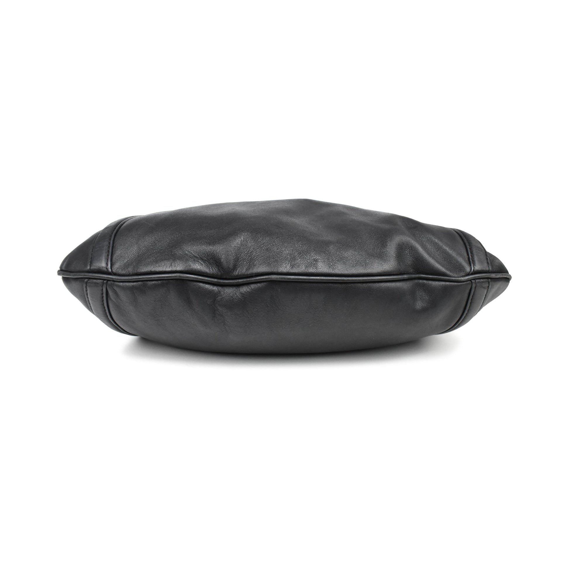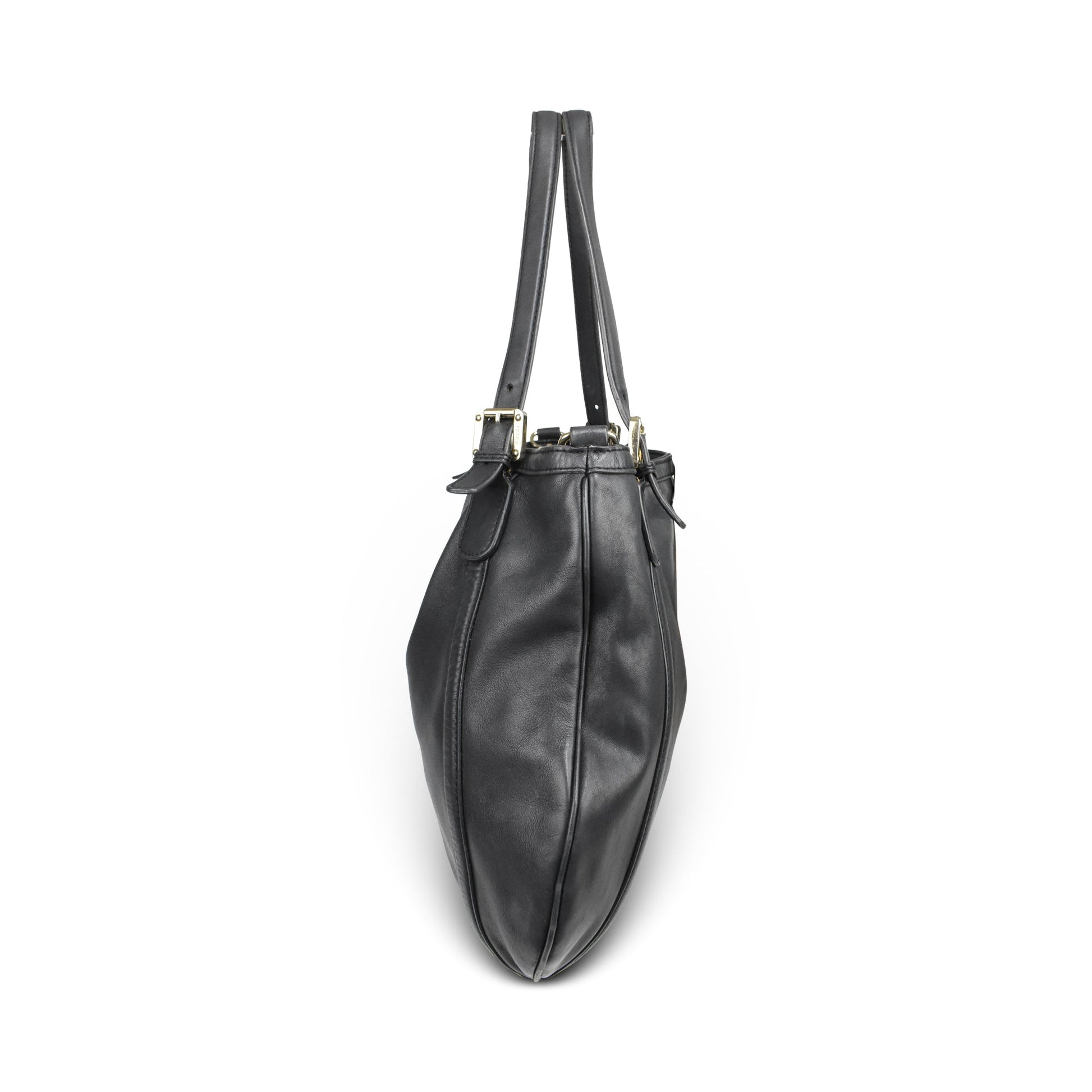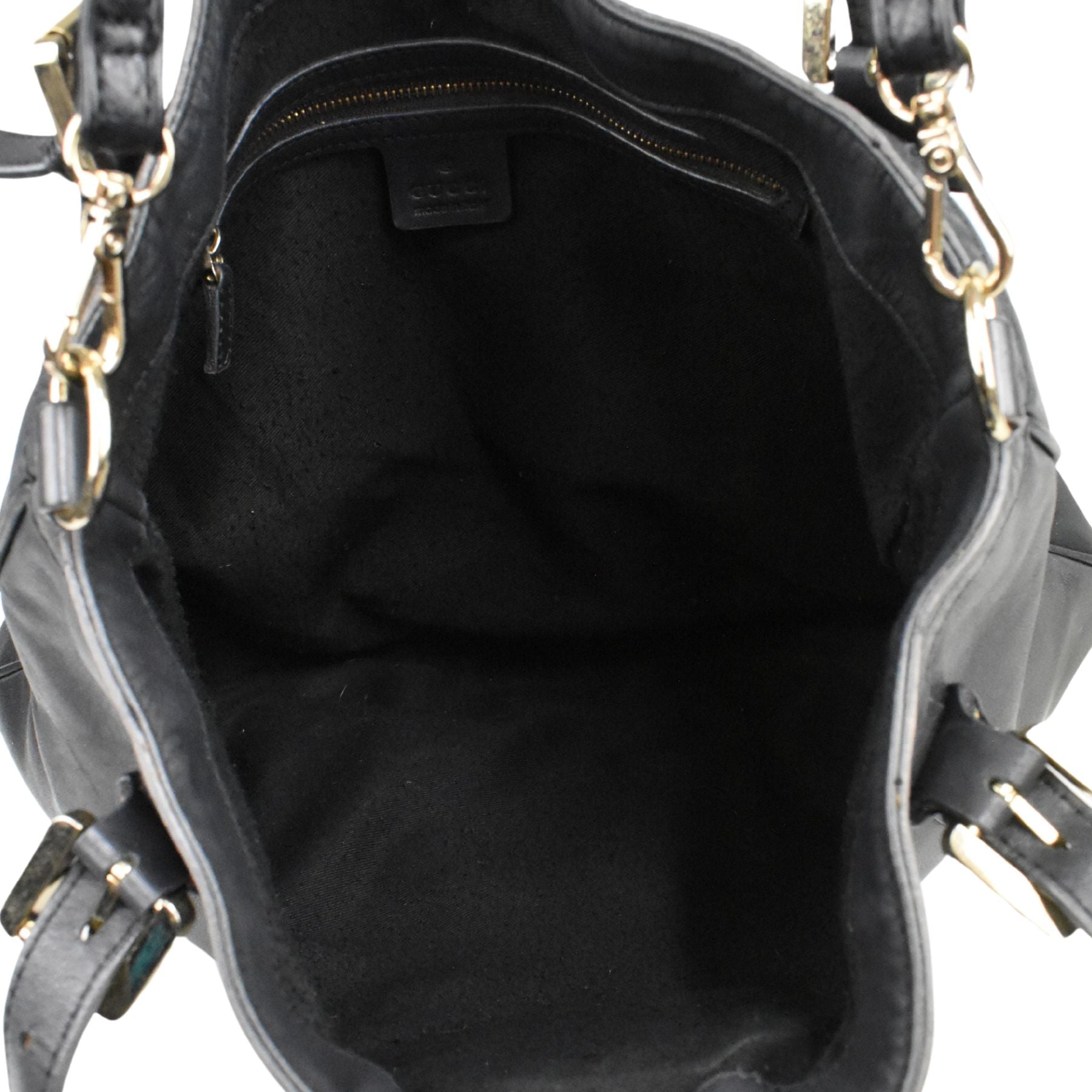 Gucci 'Britt' hobo bag in black smooth leather with with a large GG plaque in gold hardware. Features dual top buckle handles and a detachable crossbody strap.