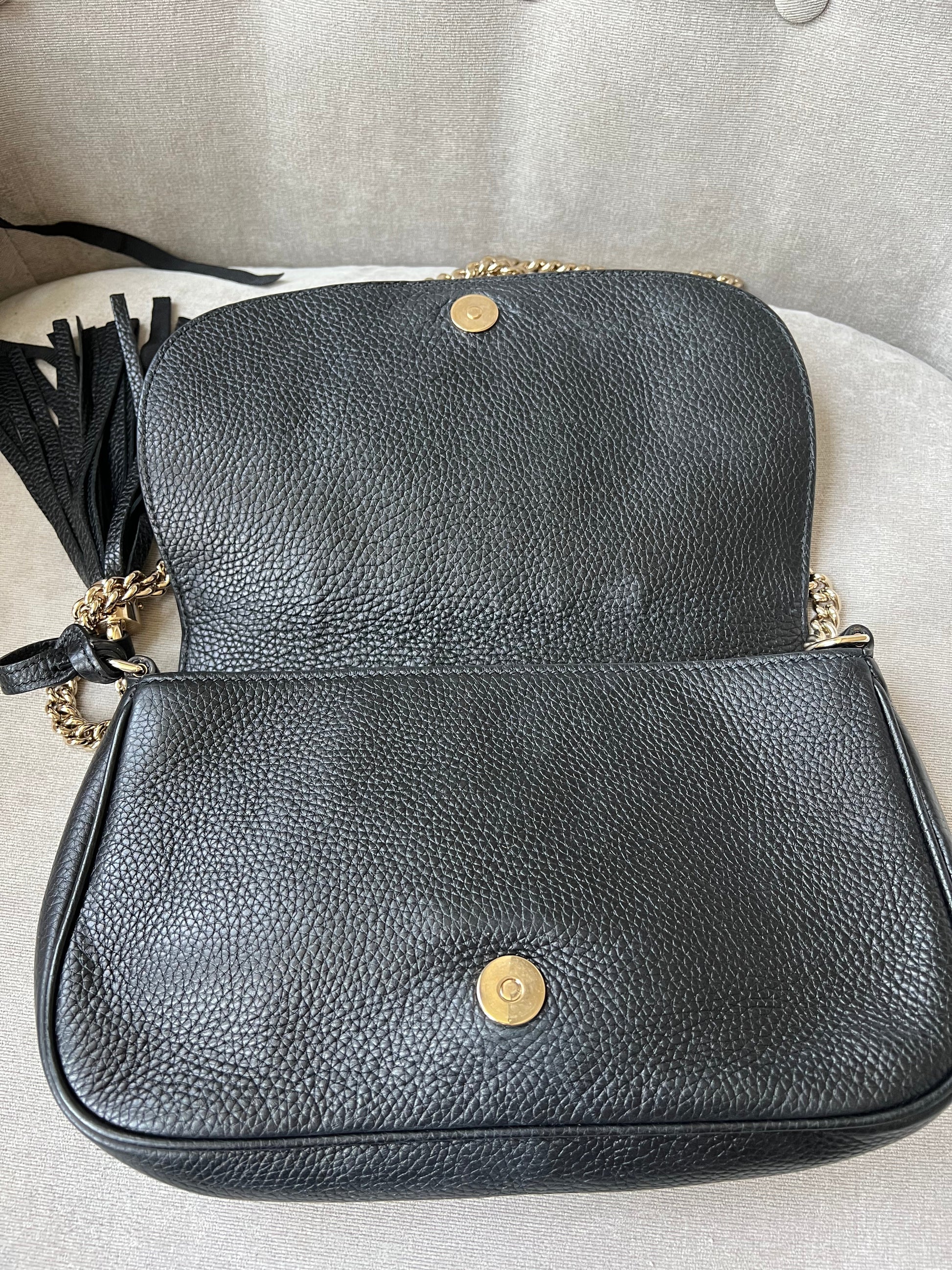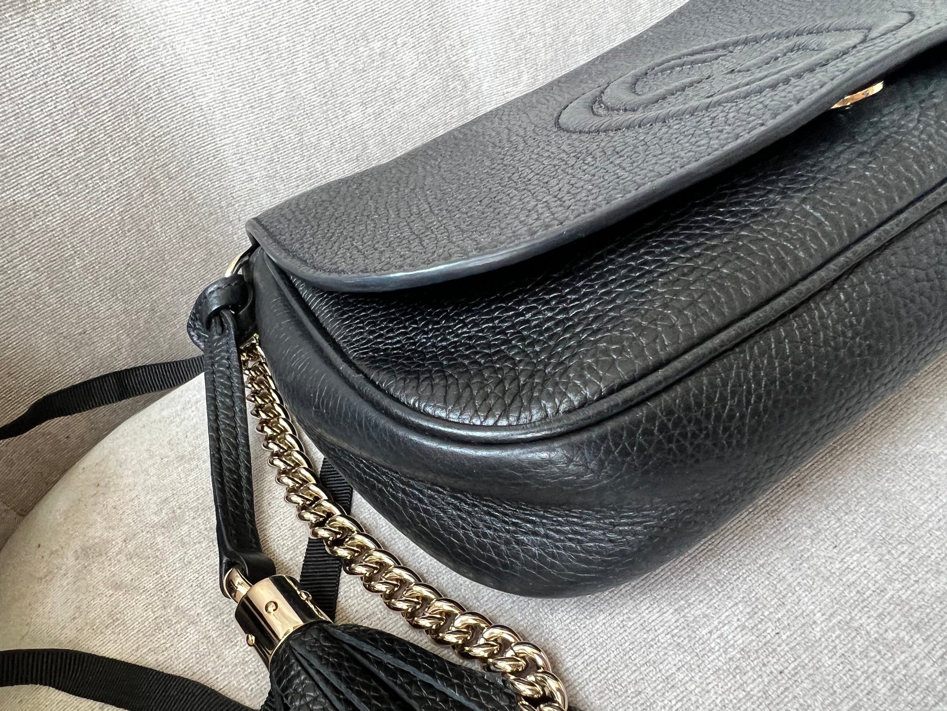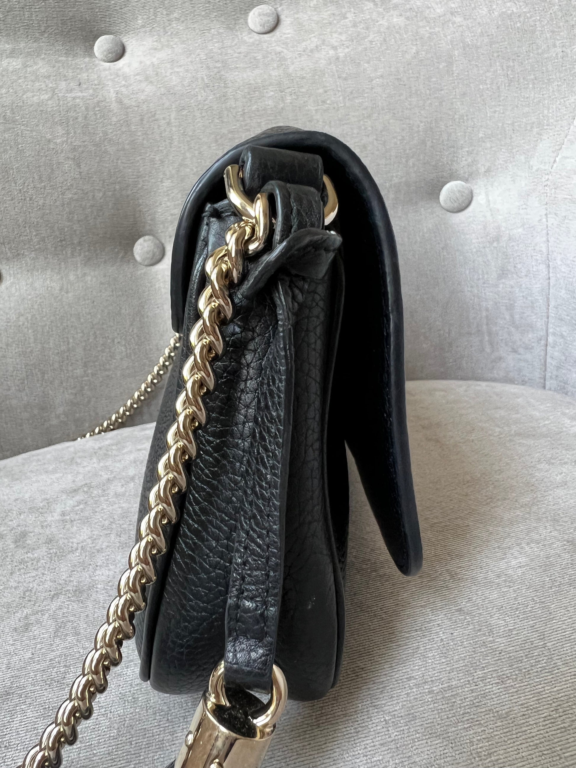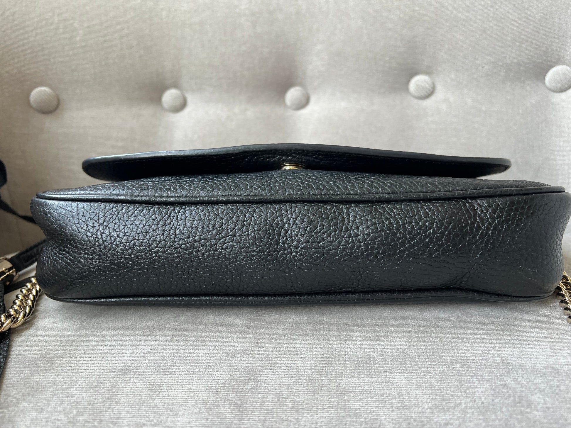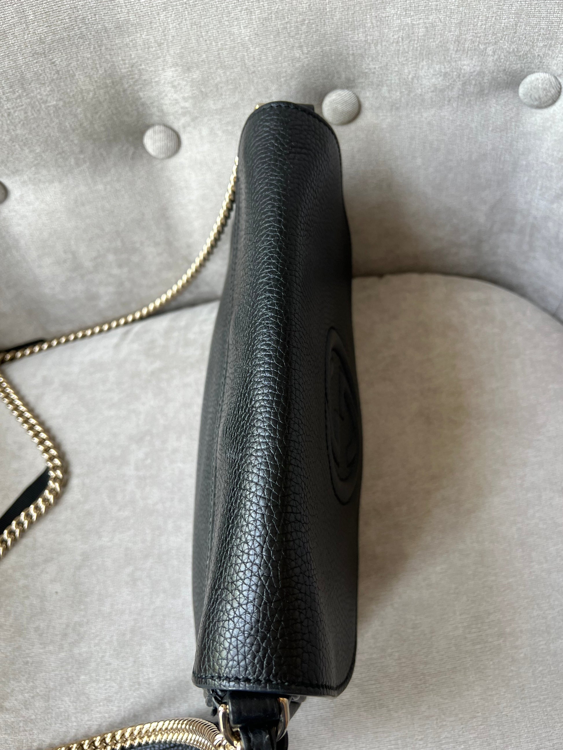 Gucci Soho Disco Crossbodyin Black Leather with pale gold hardware. This practical, cross body, flap style bag is compact in size but still fits a reasonable amount. Can be over shoulder or cross body. One of Guccis most popular style and goes with any outfit, dressed up or down. Originally purchased for 970.