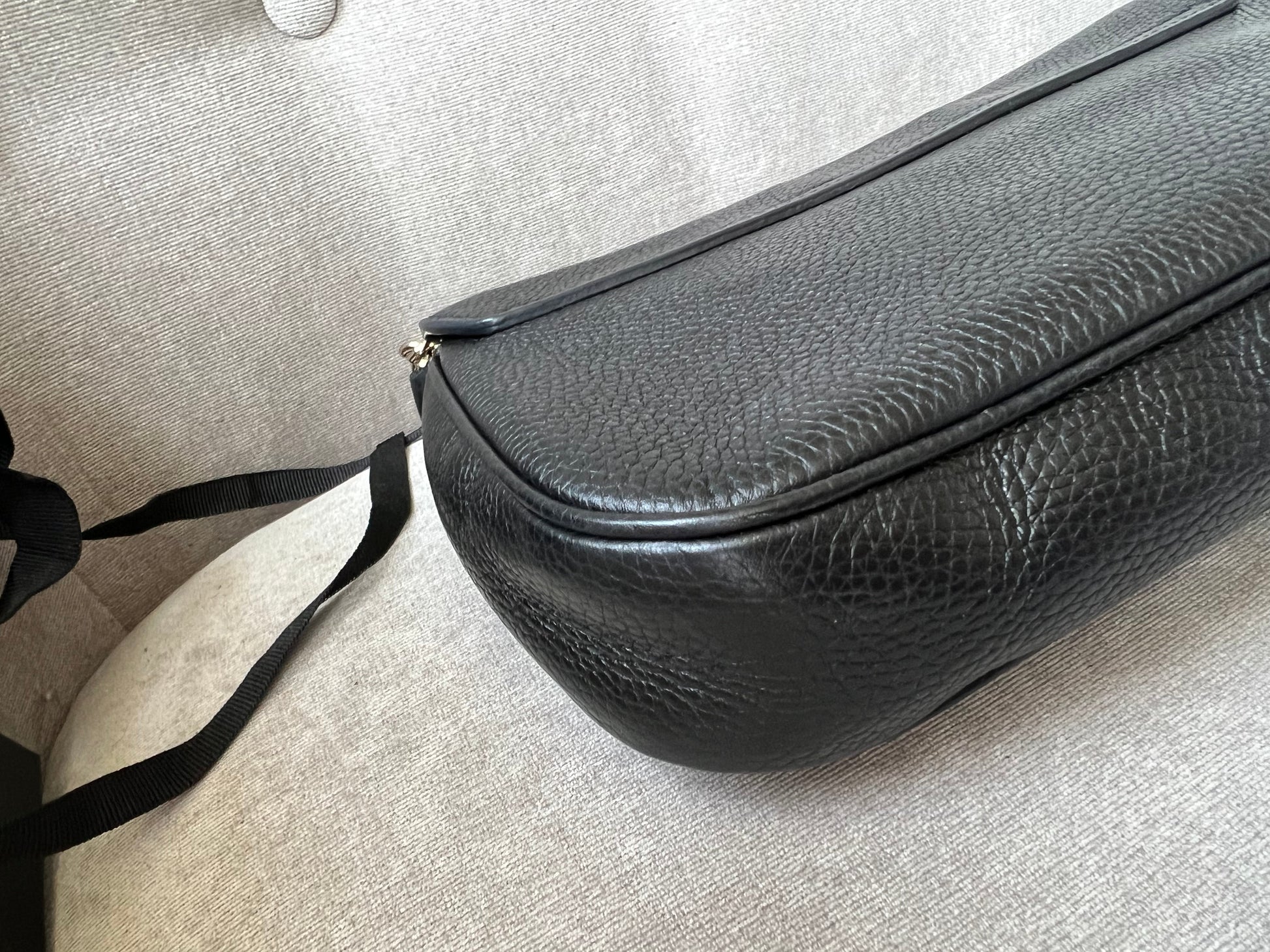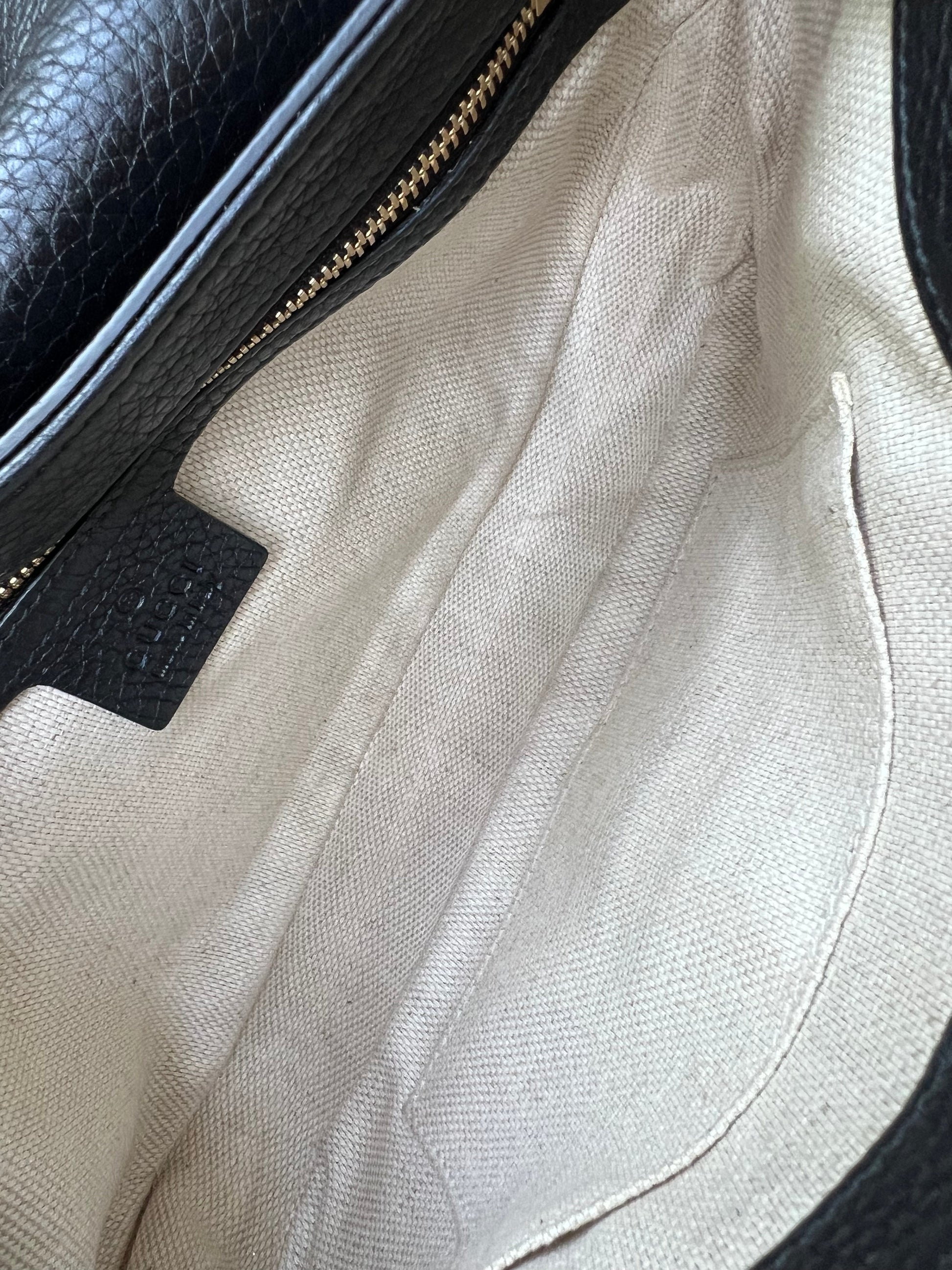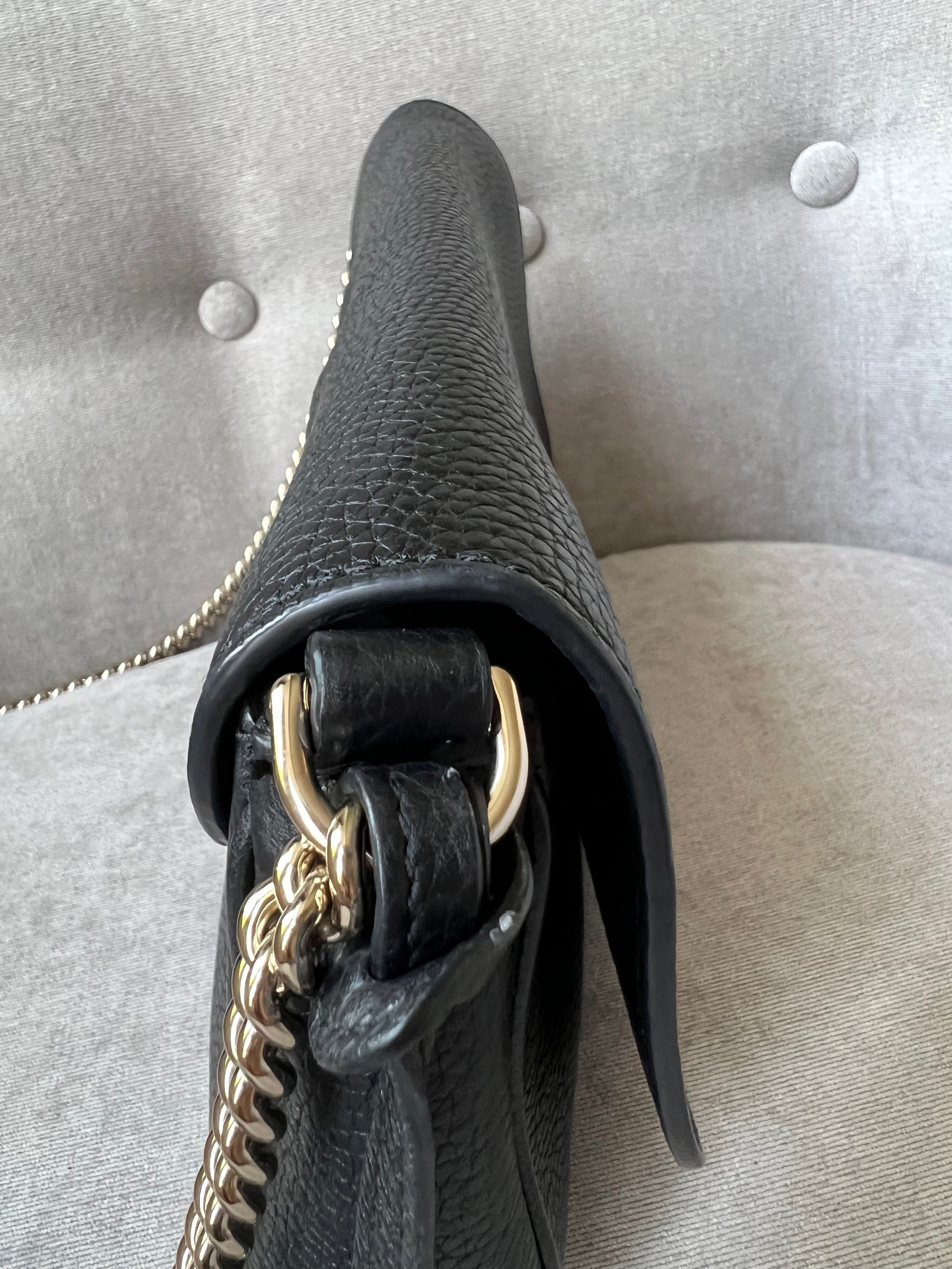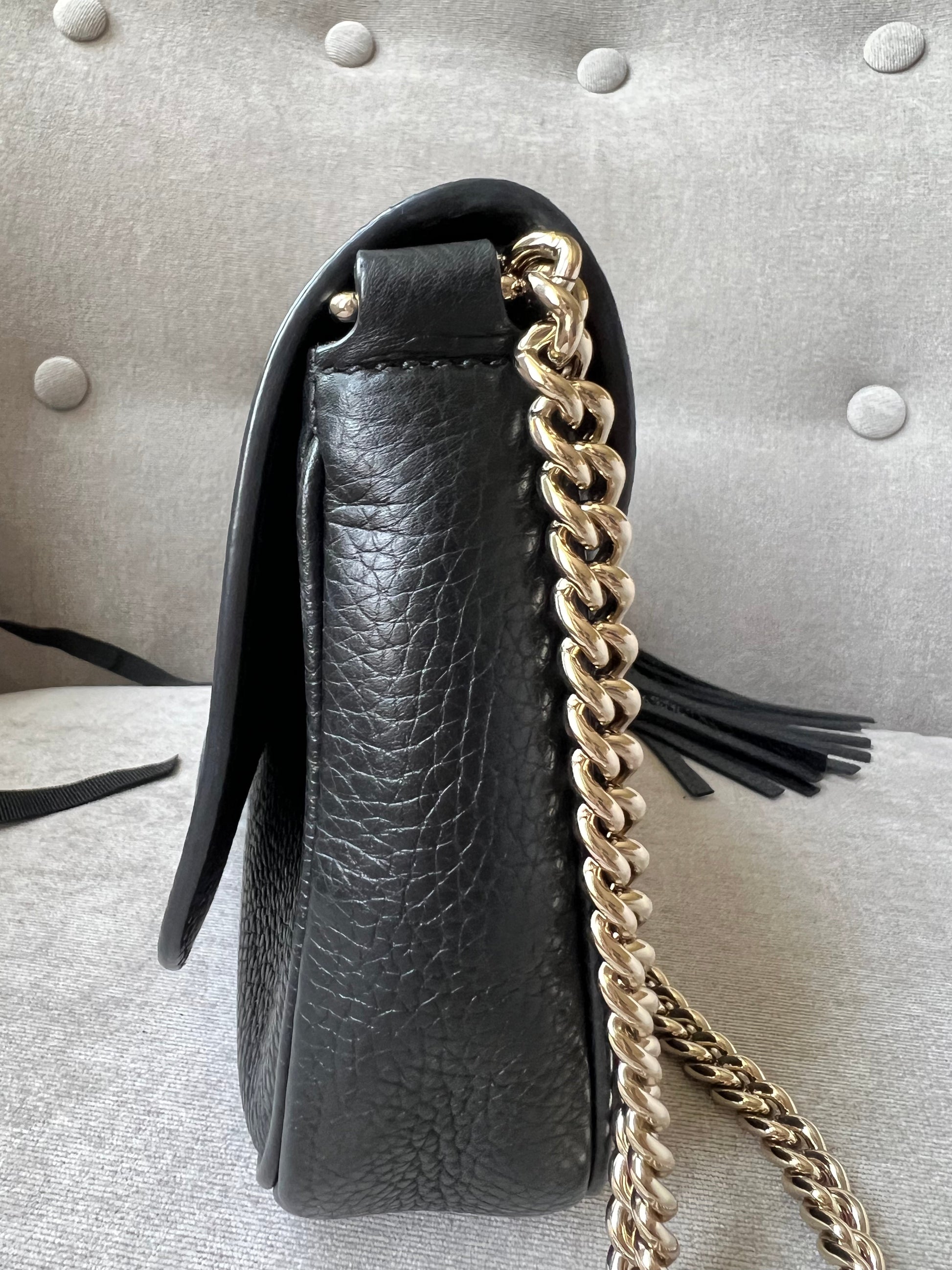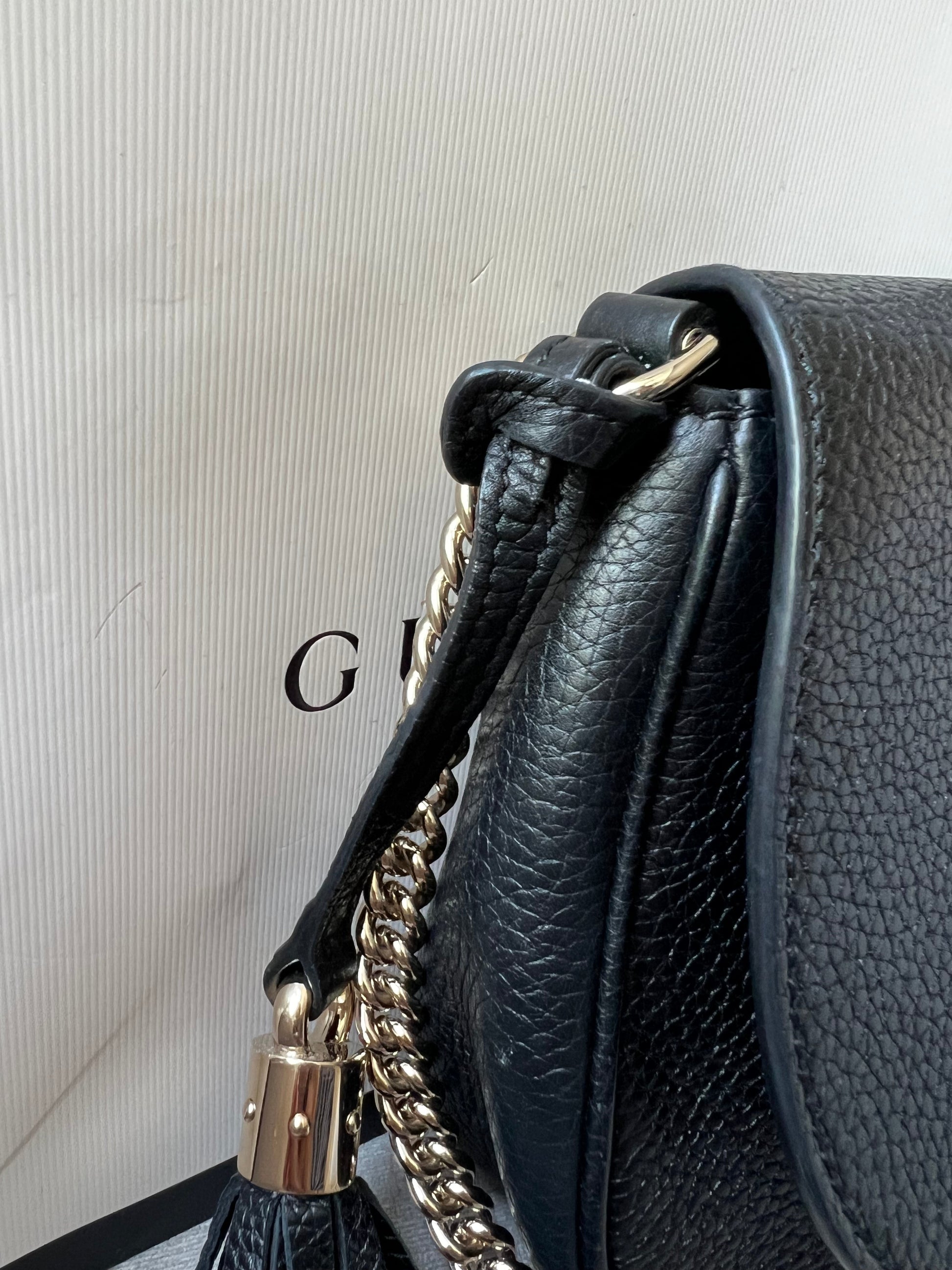 Gucci Soho Disco Crossbodyin Black Leather with pale gold hardware. This practical, cross body, flap style bag is compact in size but still fits a reasonable amount. Can be over shoulder or cross body. One of Guccis most popular style and goes with any outfit, dressed up or down. Originally purchased for 970.