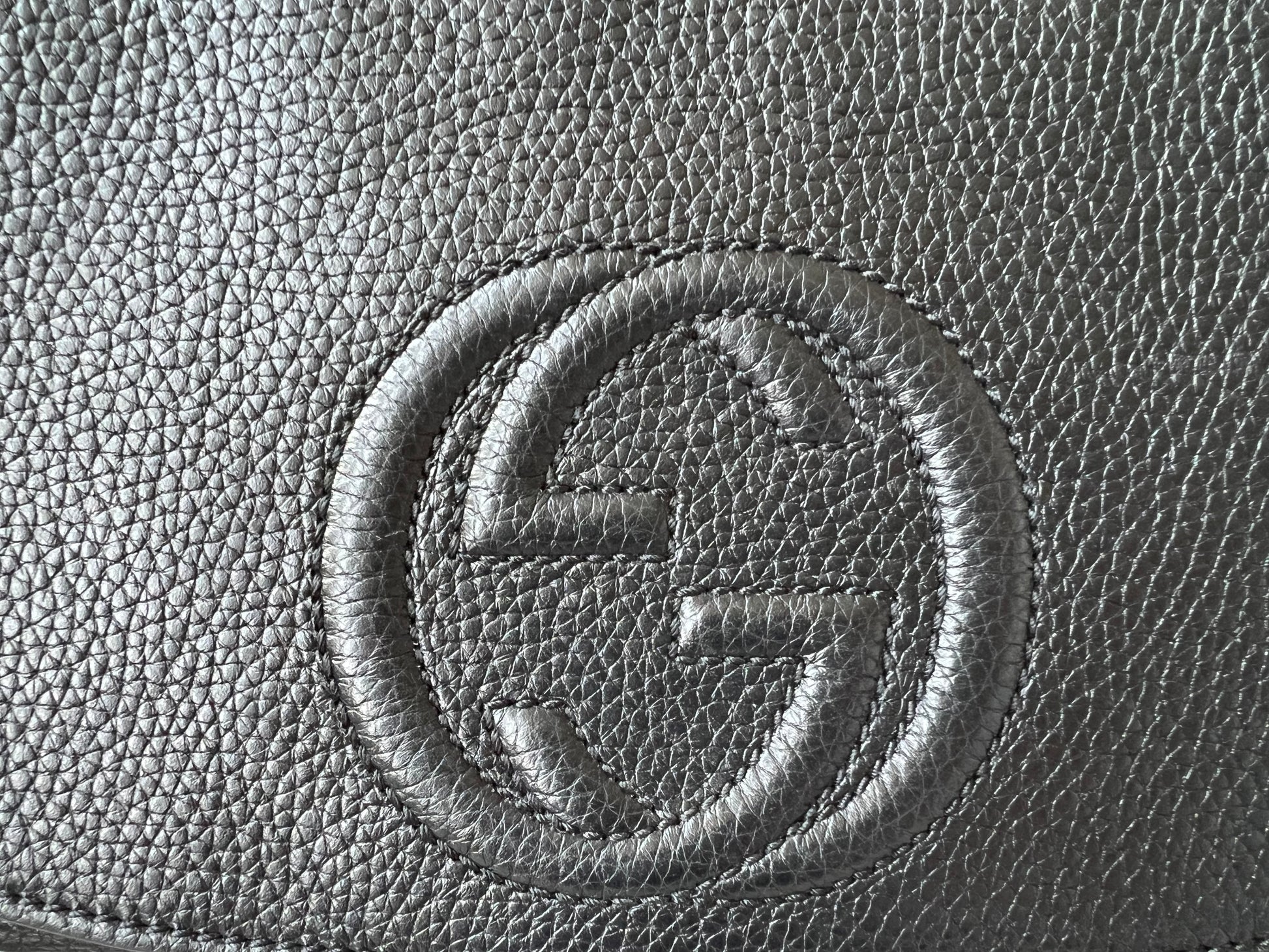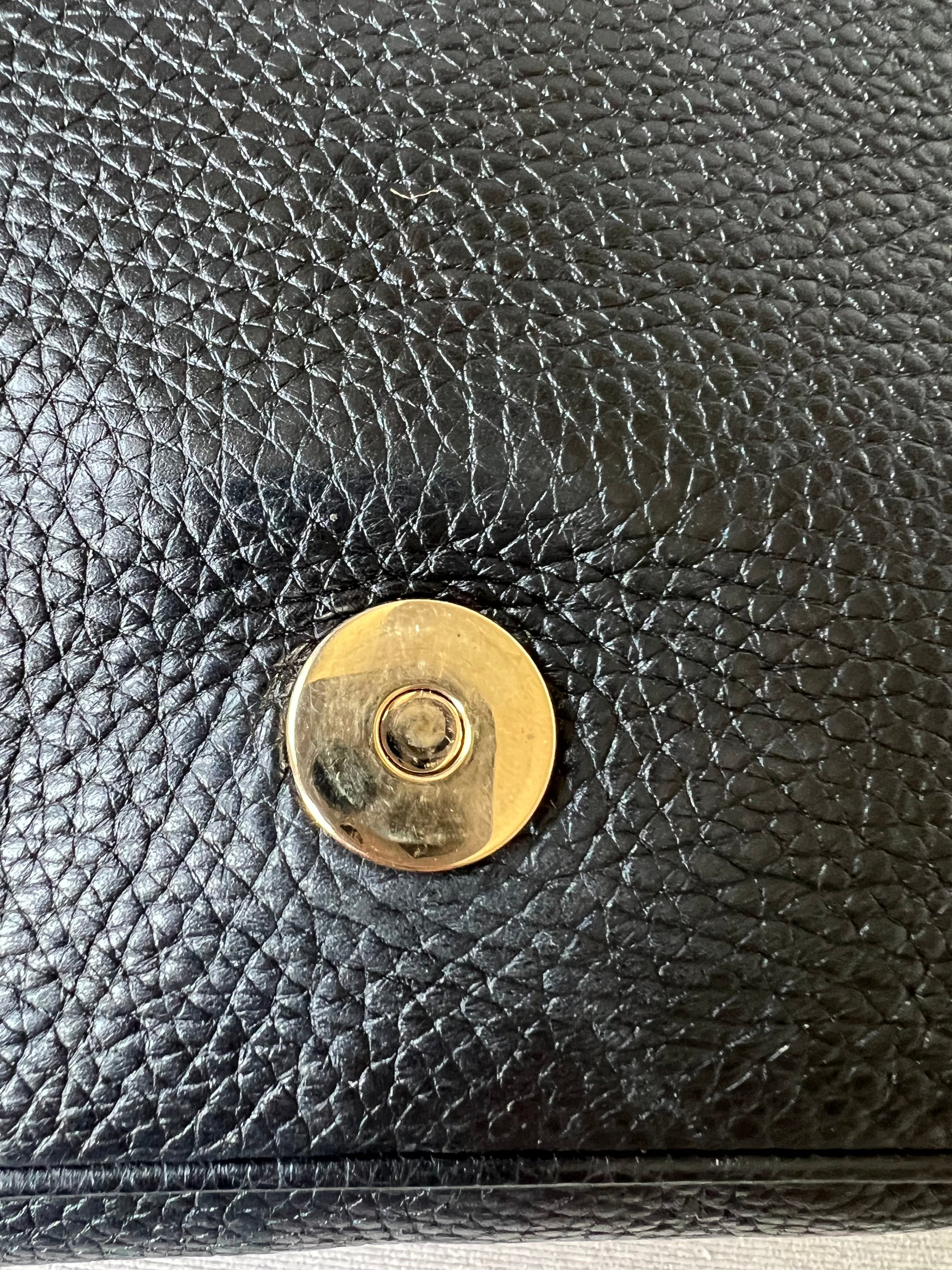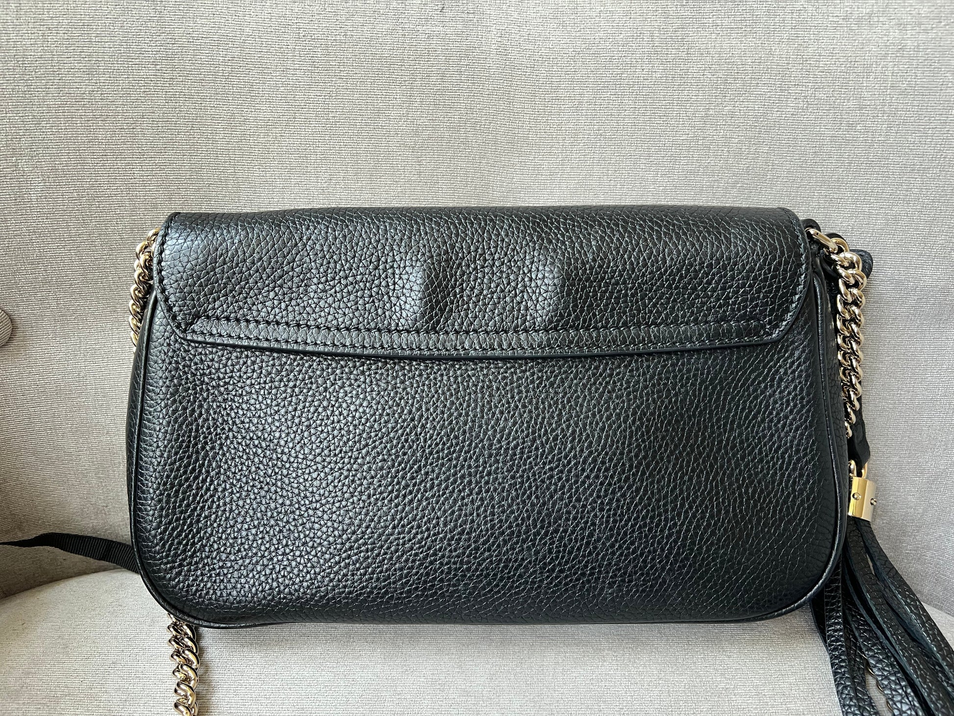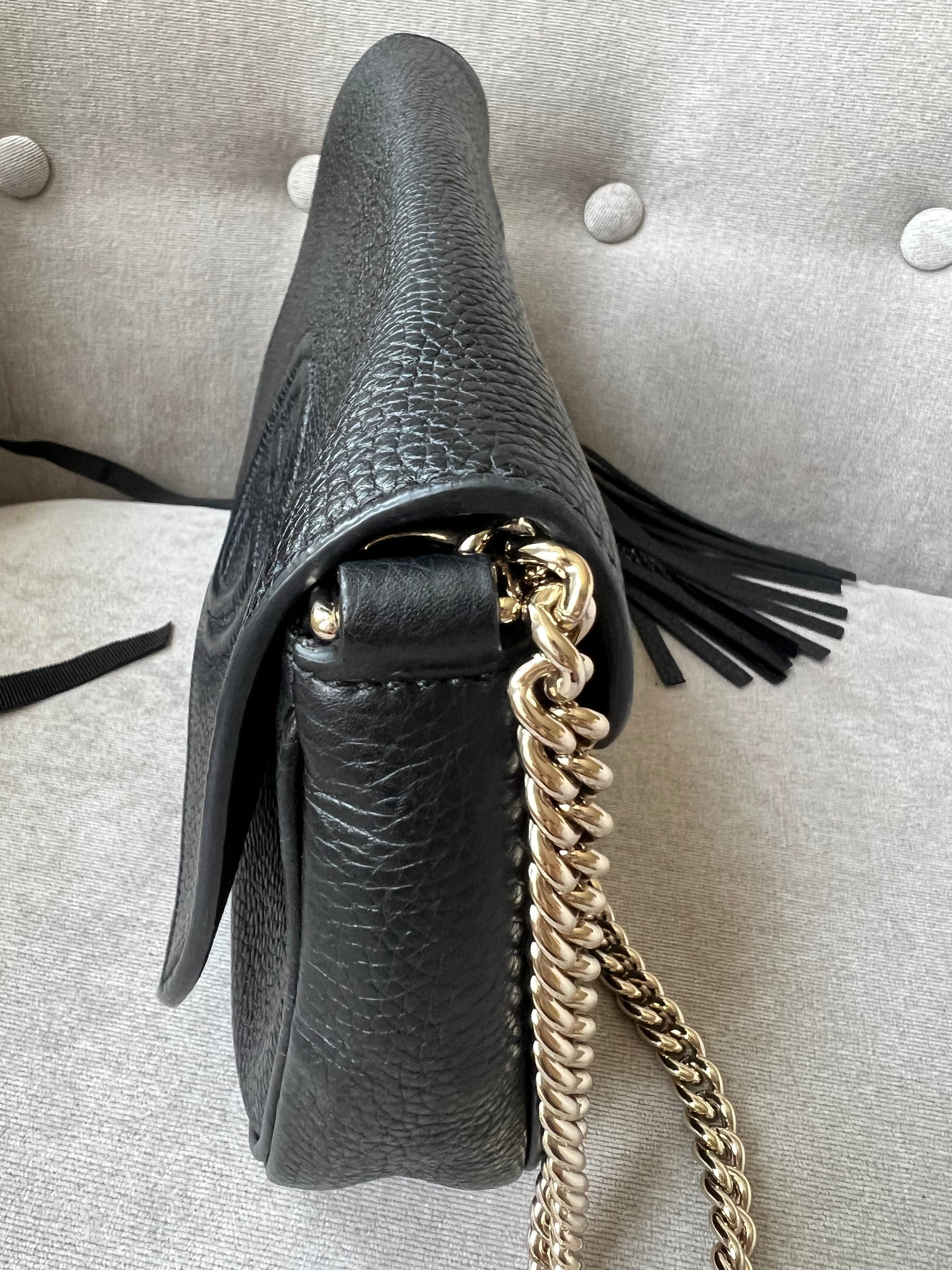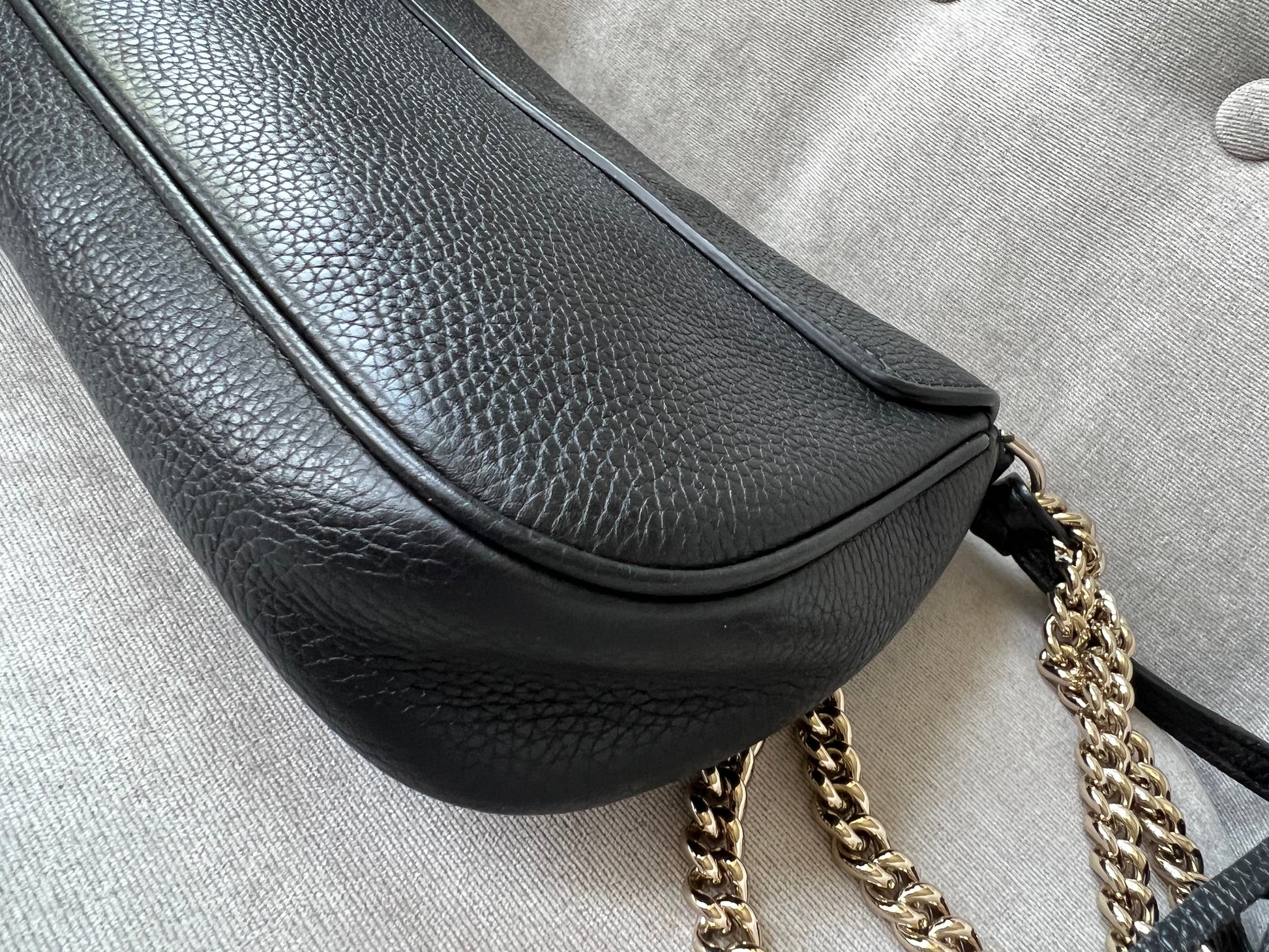 Gucci Soho Disco Crossbodyin Black Leather with pale gold hardware. This practical, cross body, flap style bag is compact in size but still fits a reasonable amount. Can be over shoulder or cross body. One of Guccis most popular style and goes with any outfit, dressed up or down. Originally purchased for 970.