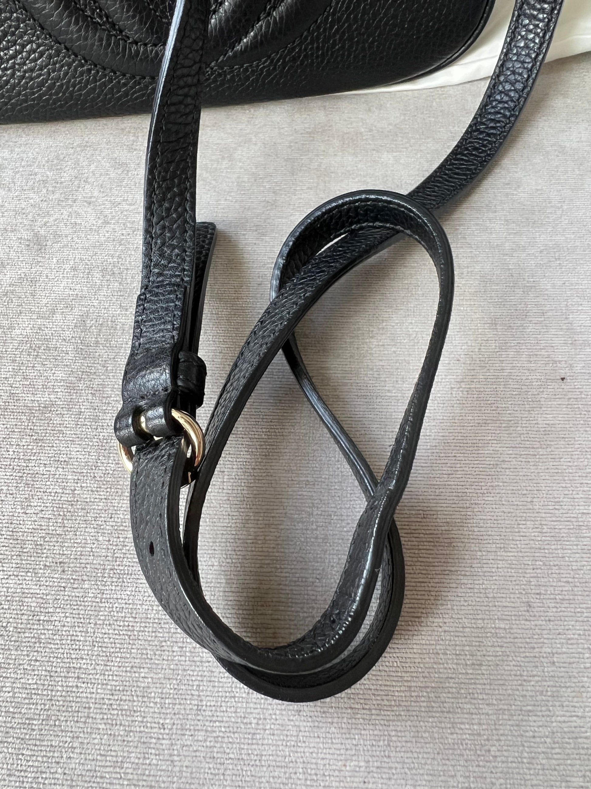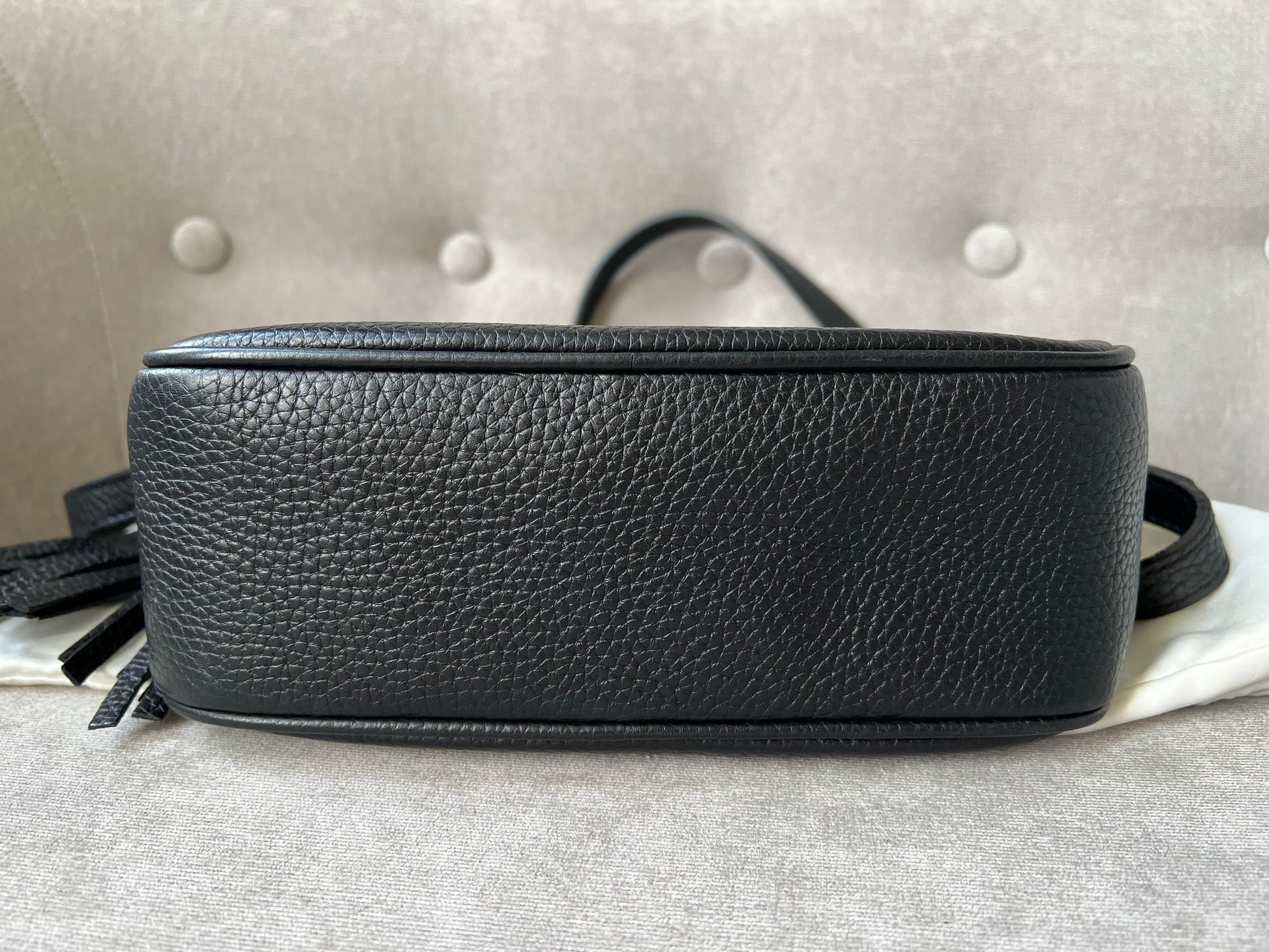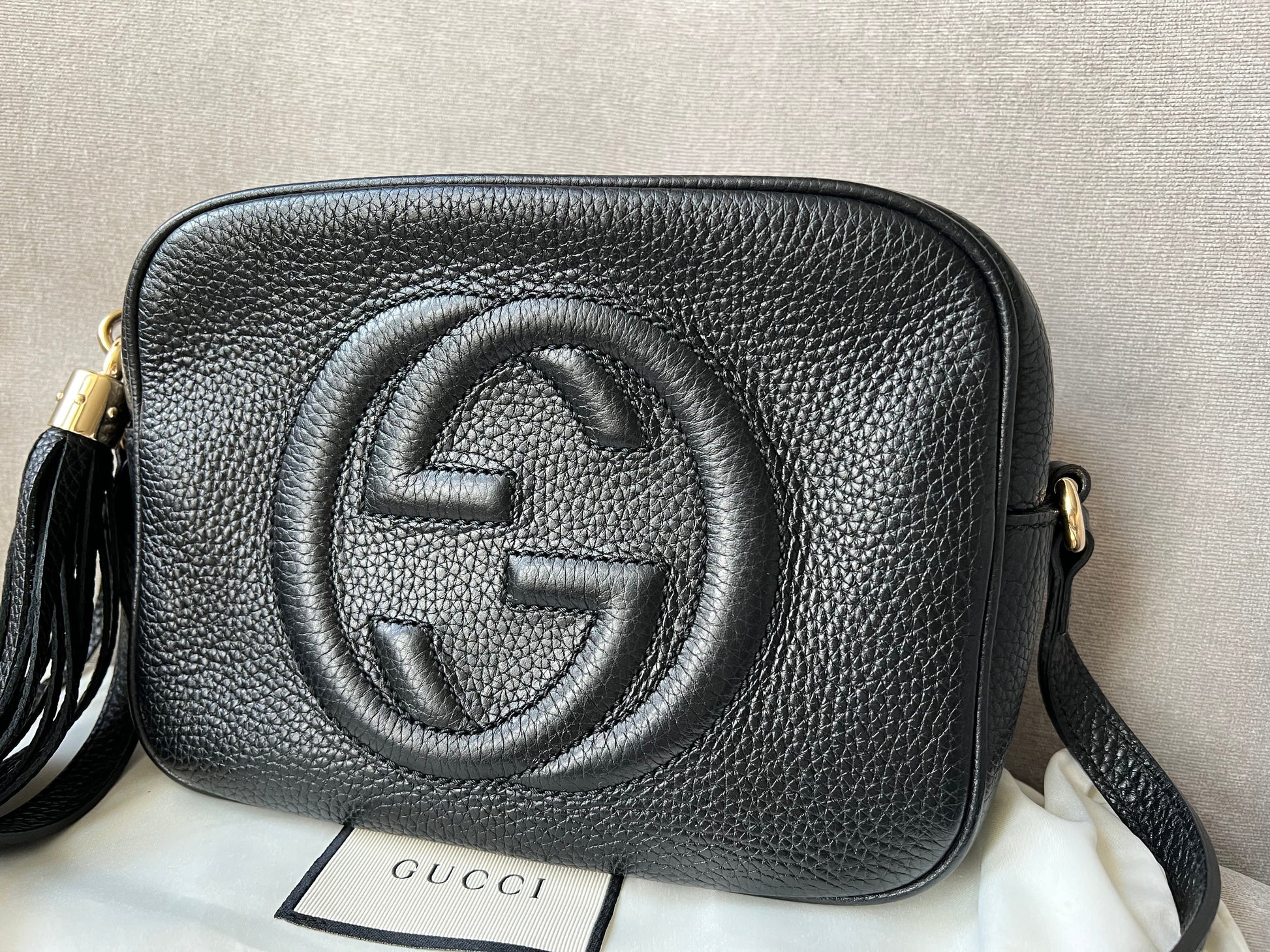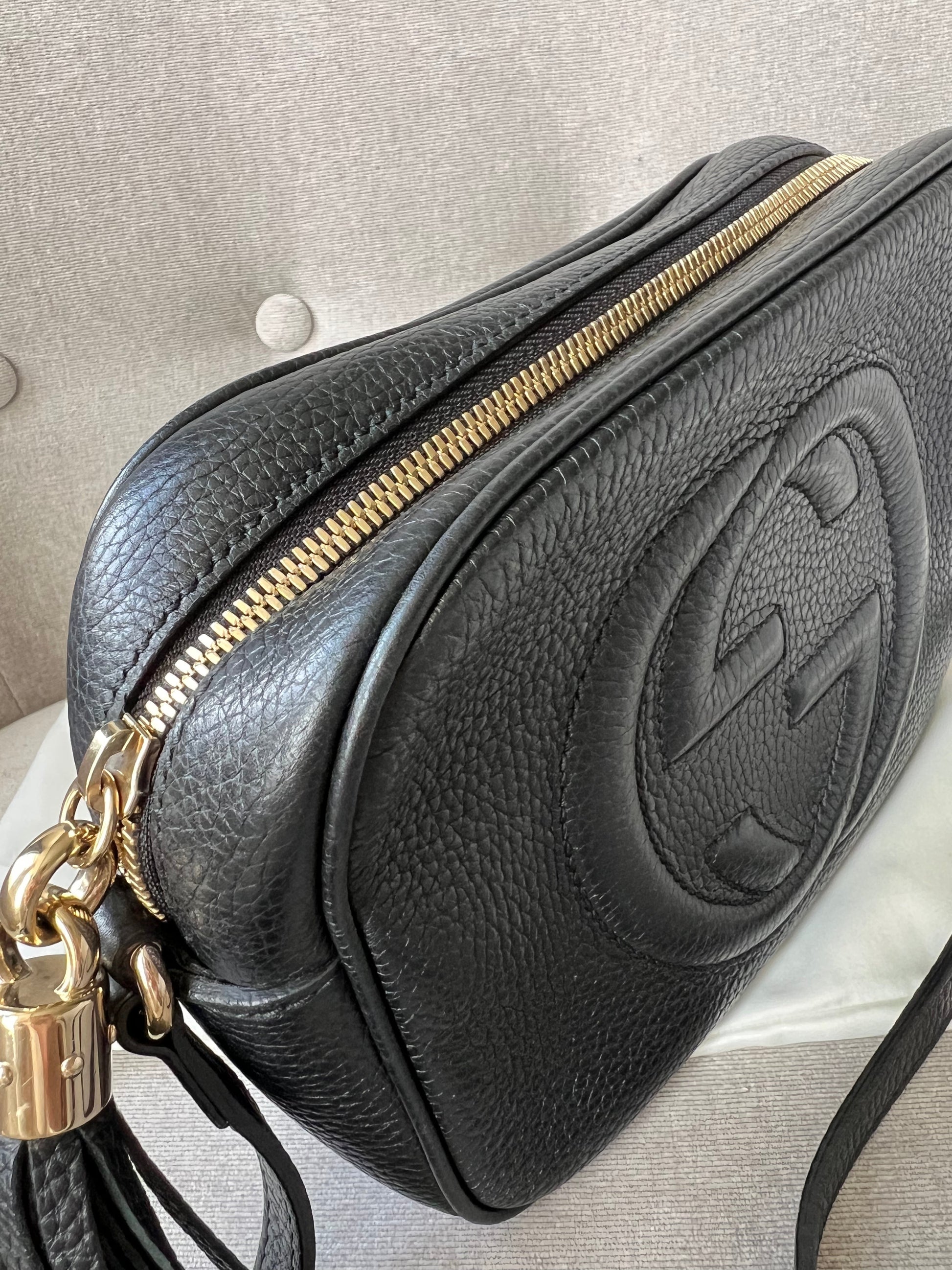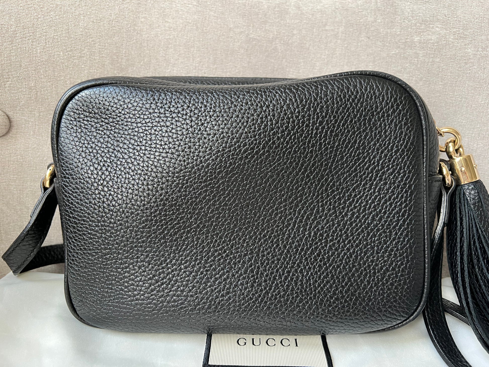 Gucci Soho Disco in Black Leather with pale gold hardware. This practical, cross body, camera style bag is compact in size but still fits a reasonable amount. Can be over shoulder or cross body. Gucci's most popular style and goes with any outfit, dressed up or down.