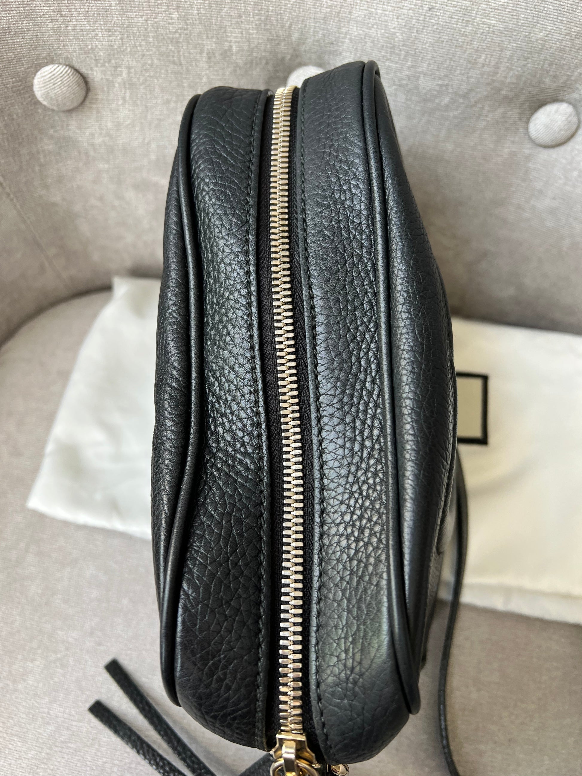 Gucci Soho Disco in Black Leather with pale gold hardware. This practical, cross body, camera style bag is compact in size but still fits a reasonable amount. Can be over shoulder or cross body. Gucci's most popular style and goes with any outfit, dressed up or down.