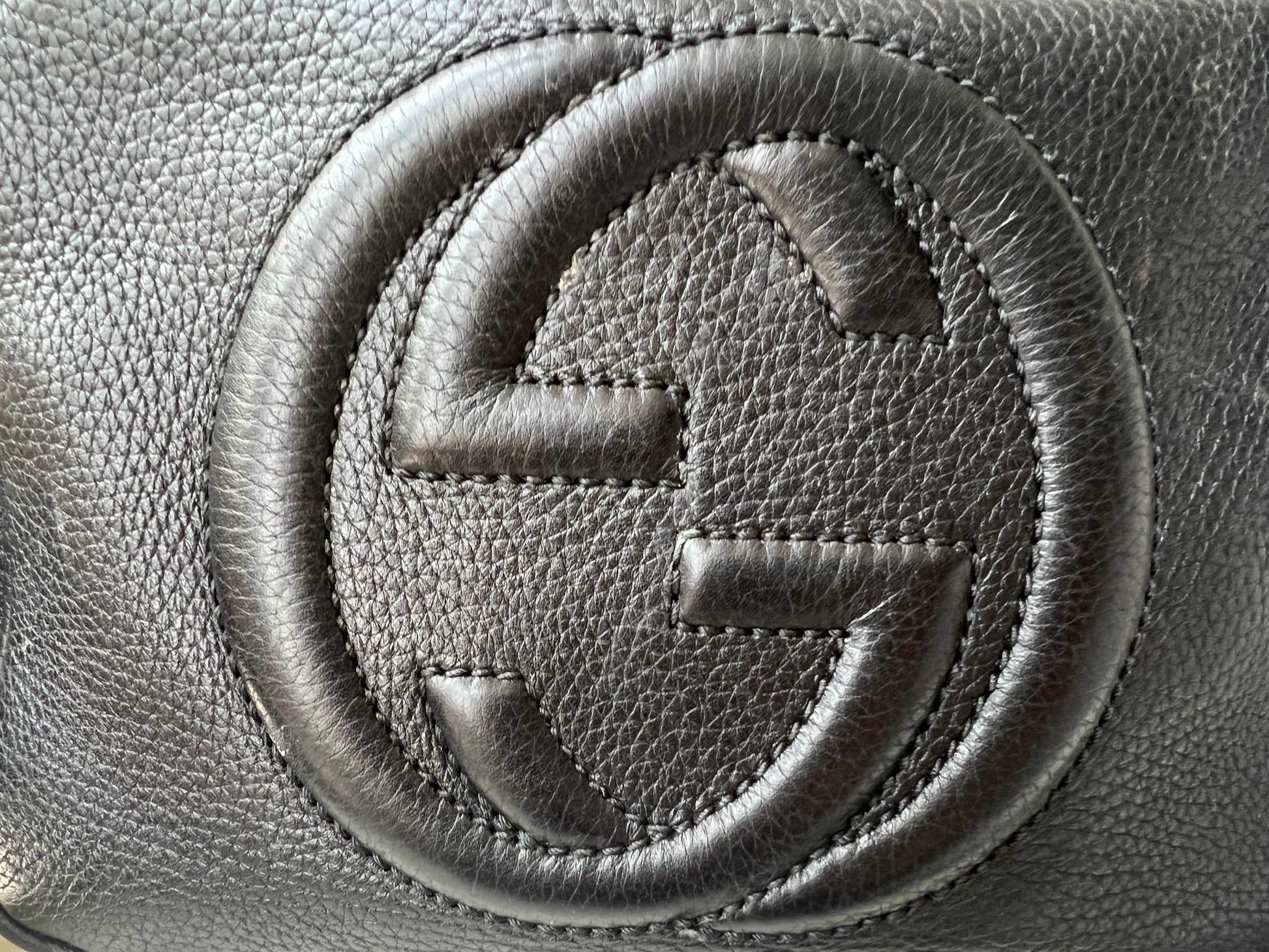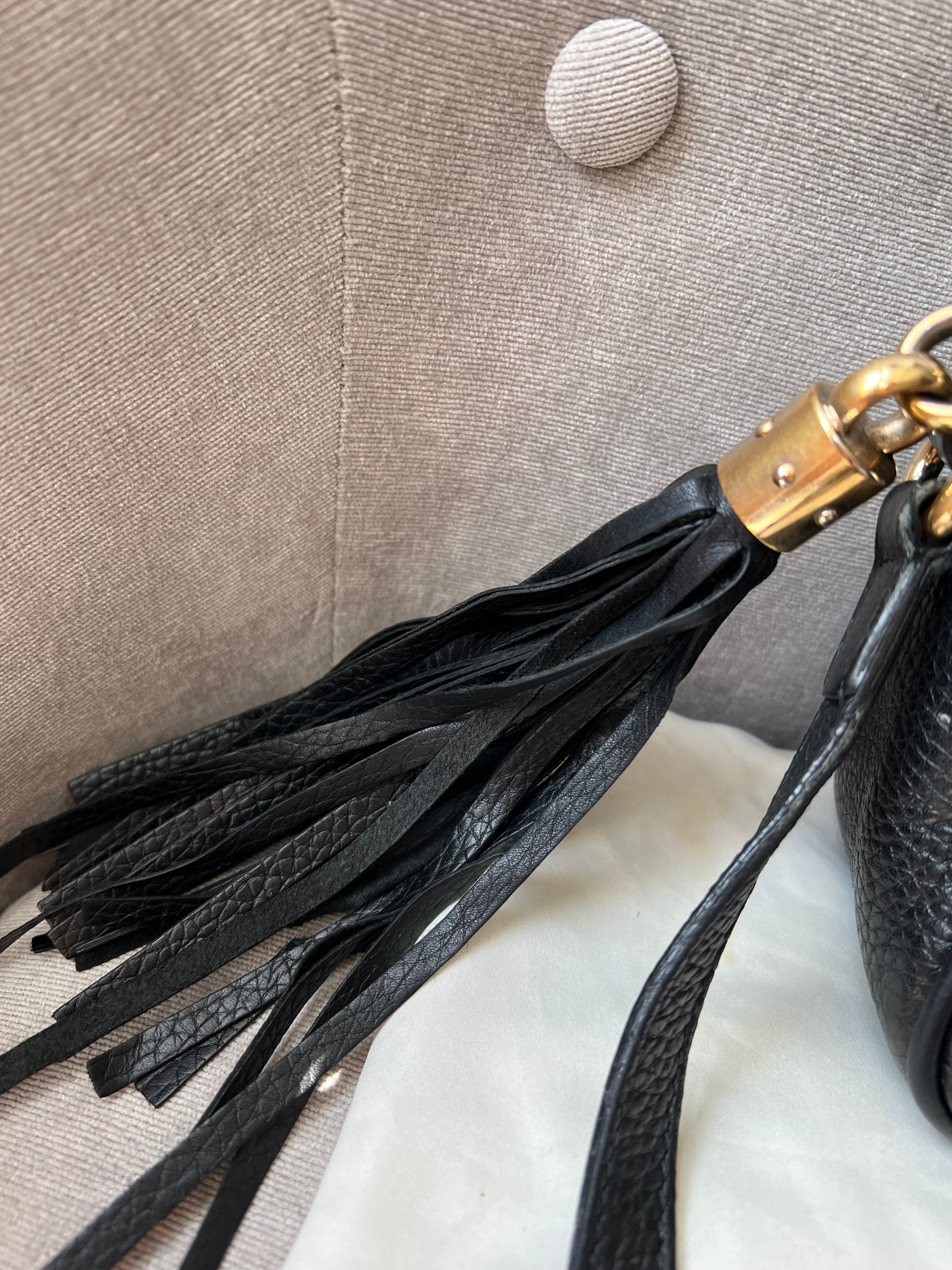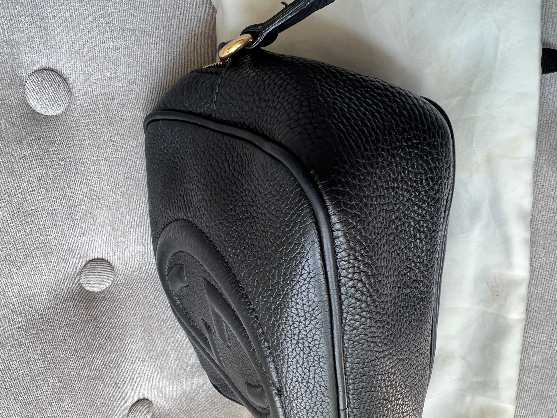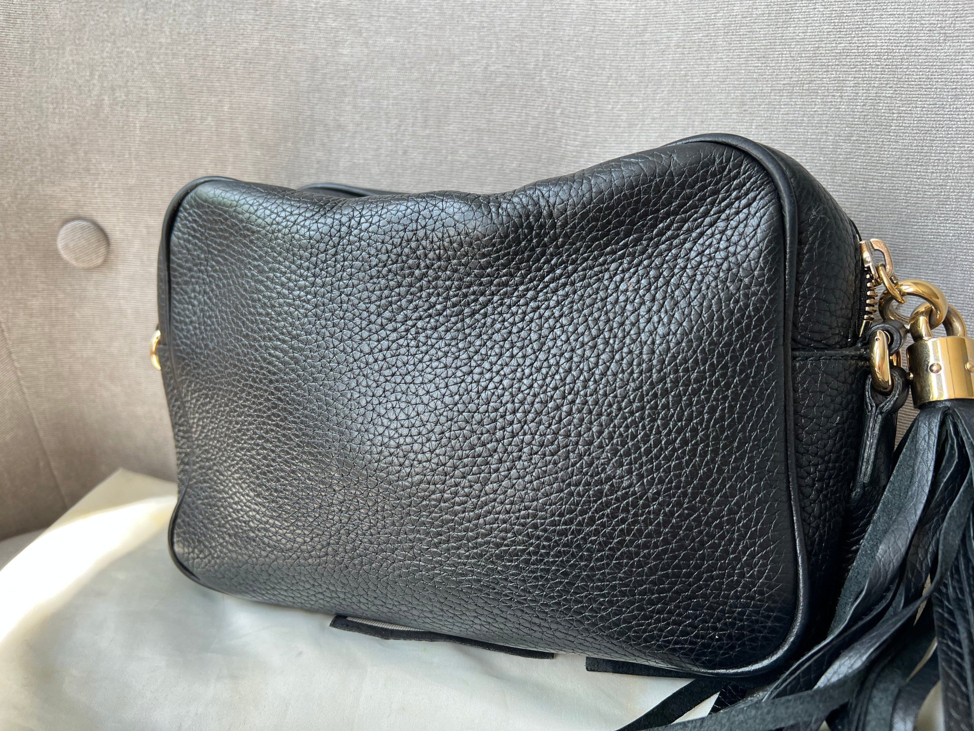 Gucci Soho Disco in Black Leather with pale gold hardware. This practical, cross body, camera style bag is compact in size but still fits a reasonable amount. Can be over shoulder or cross body. Gucci's most popular style and goes with any outfit, dressed up or down.