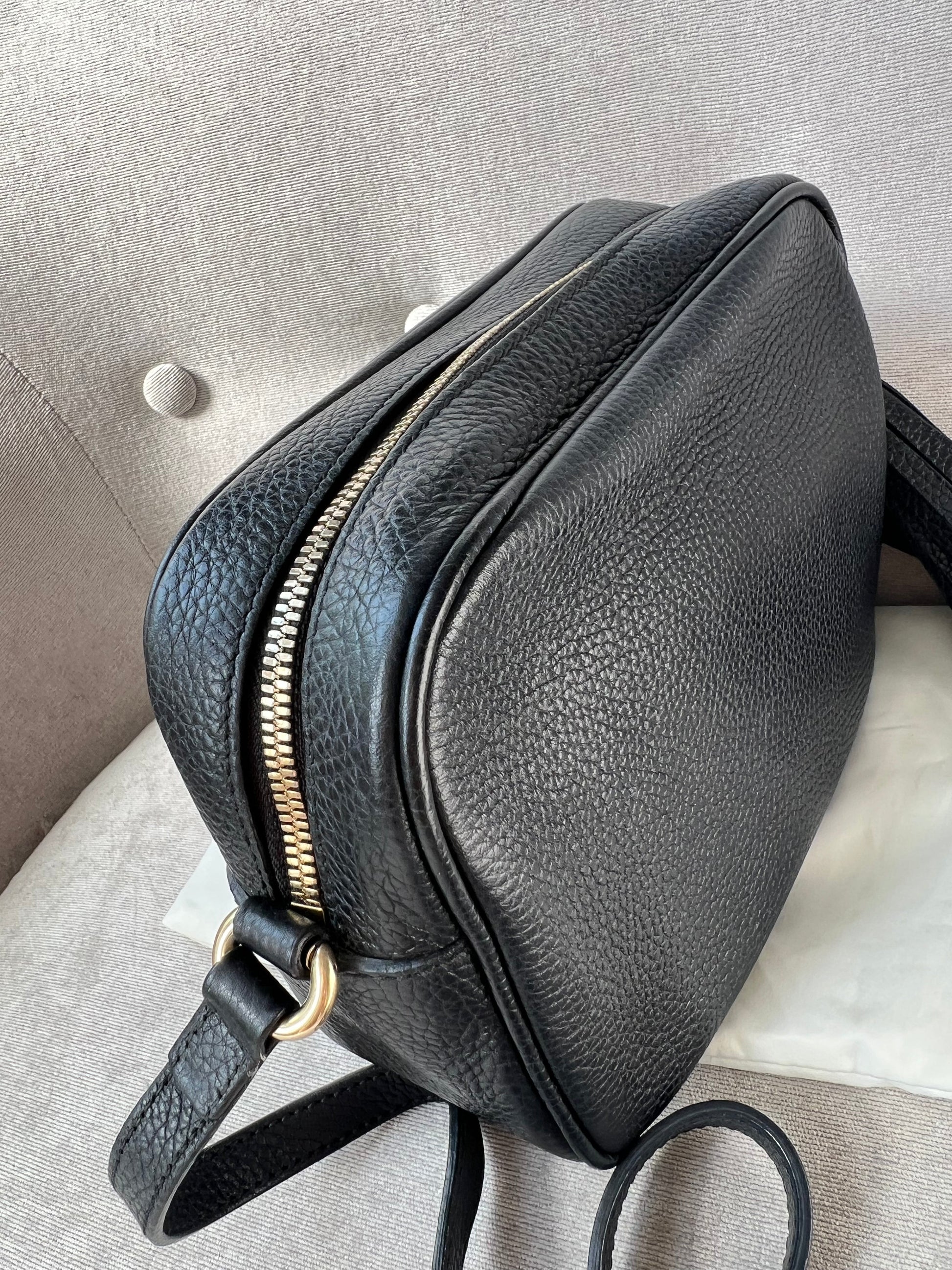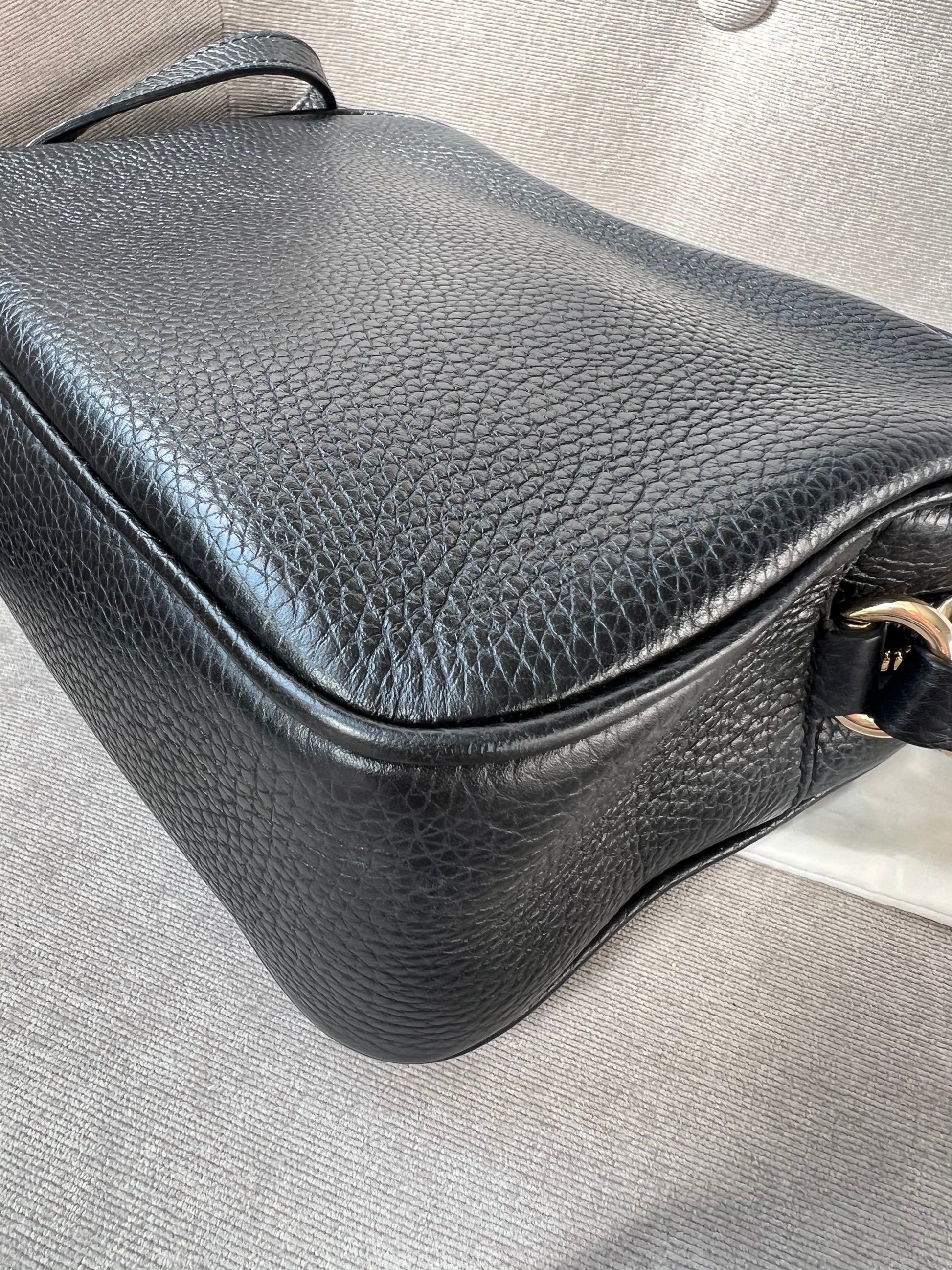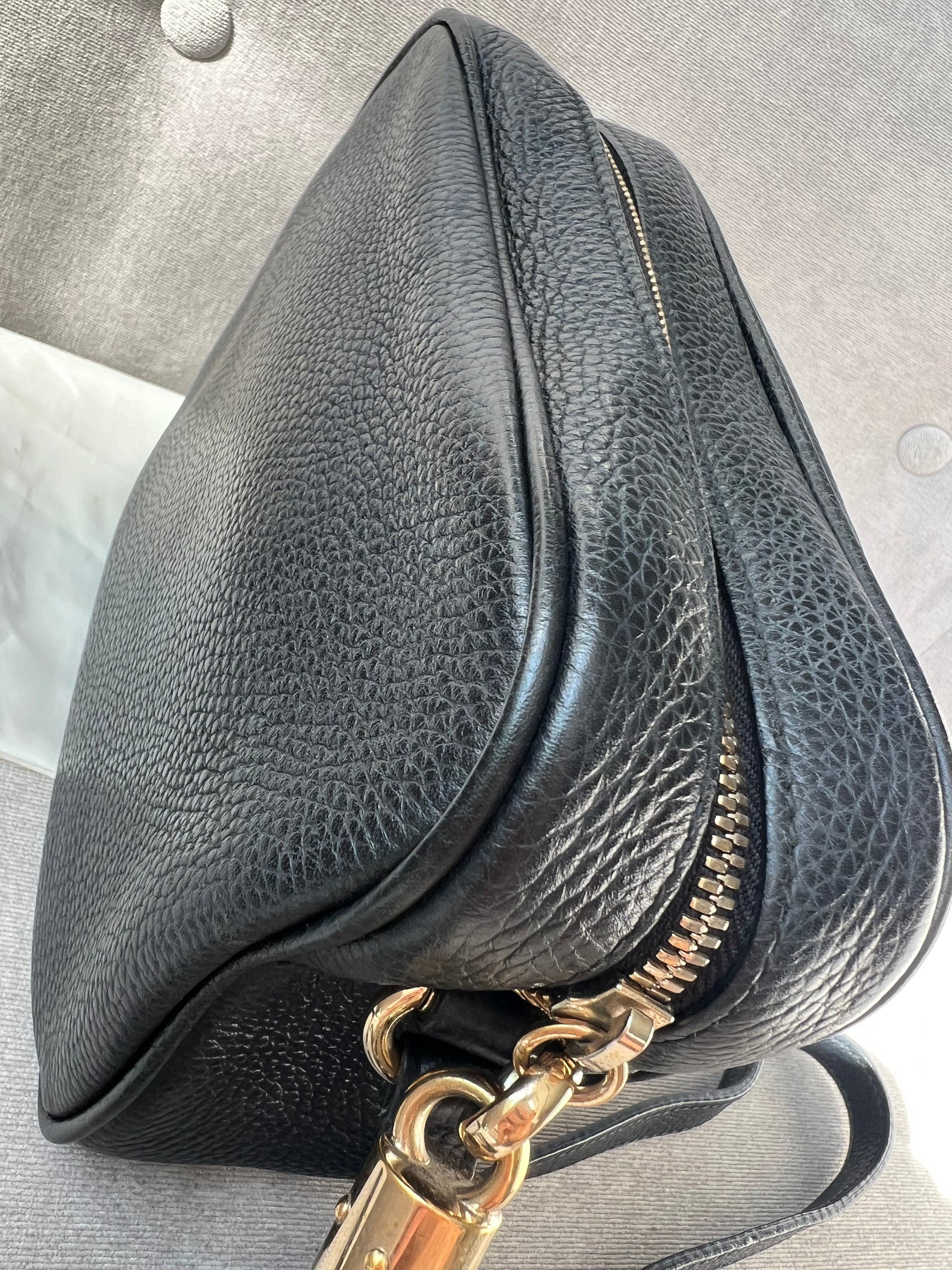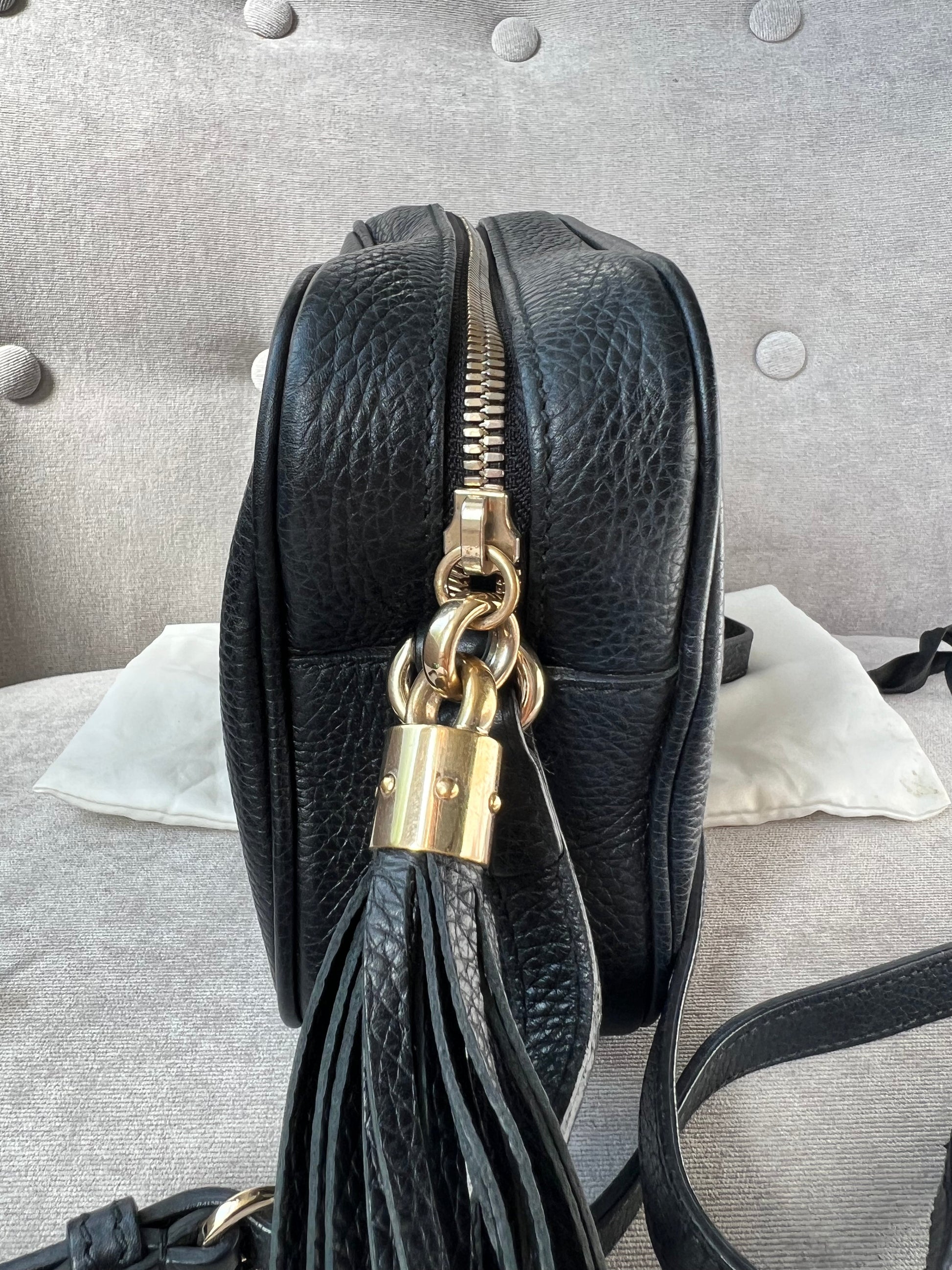 Gucci Soho Disco in Black Leather with pale gold hardware. This practical, cross body, camera style bag is compact in size but still fits a reasonable amount. Can be over shoulder or cross body. Gucci's most popular style and goes with any outfit, dressed up or down.