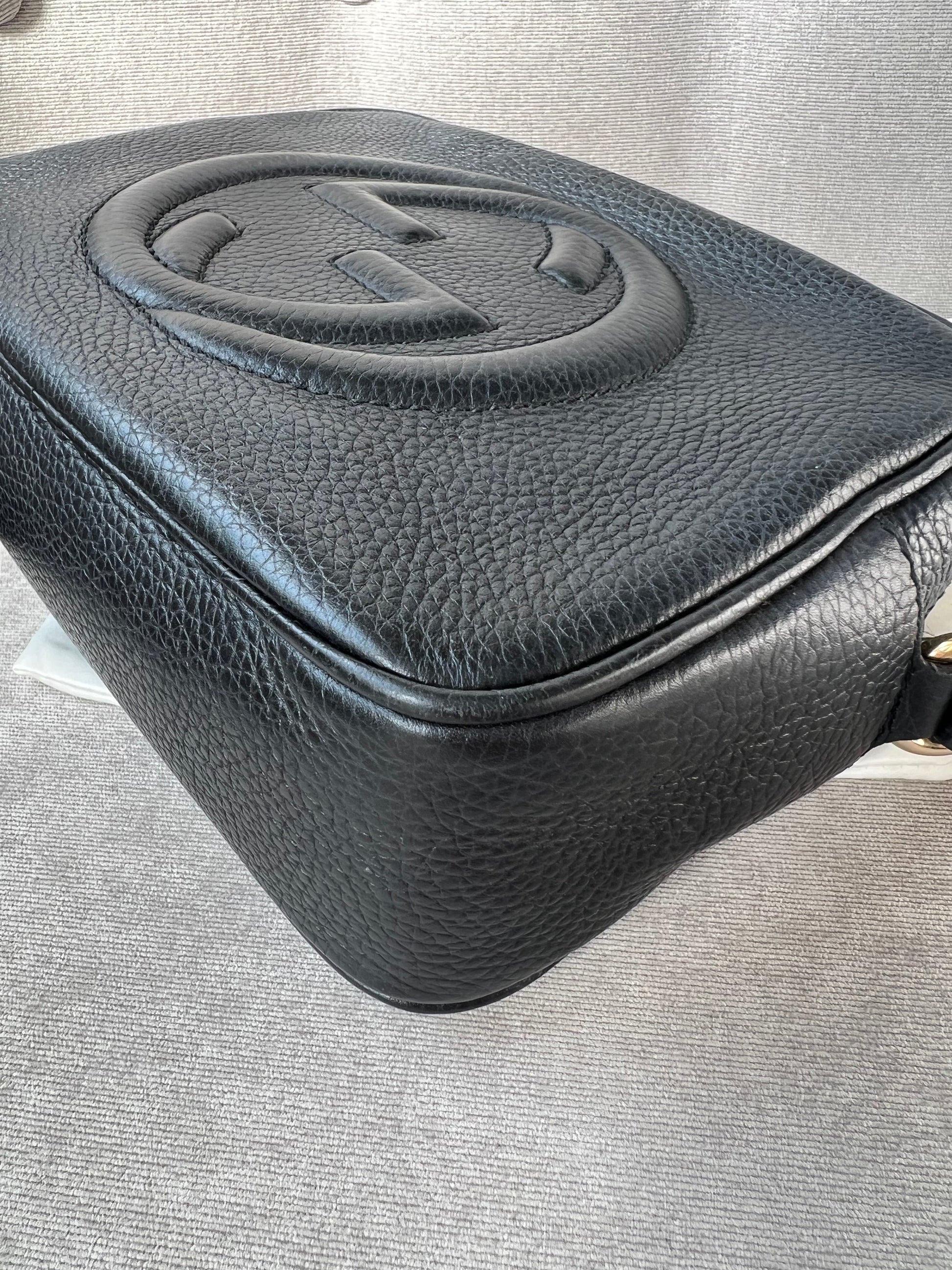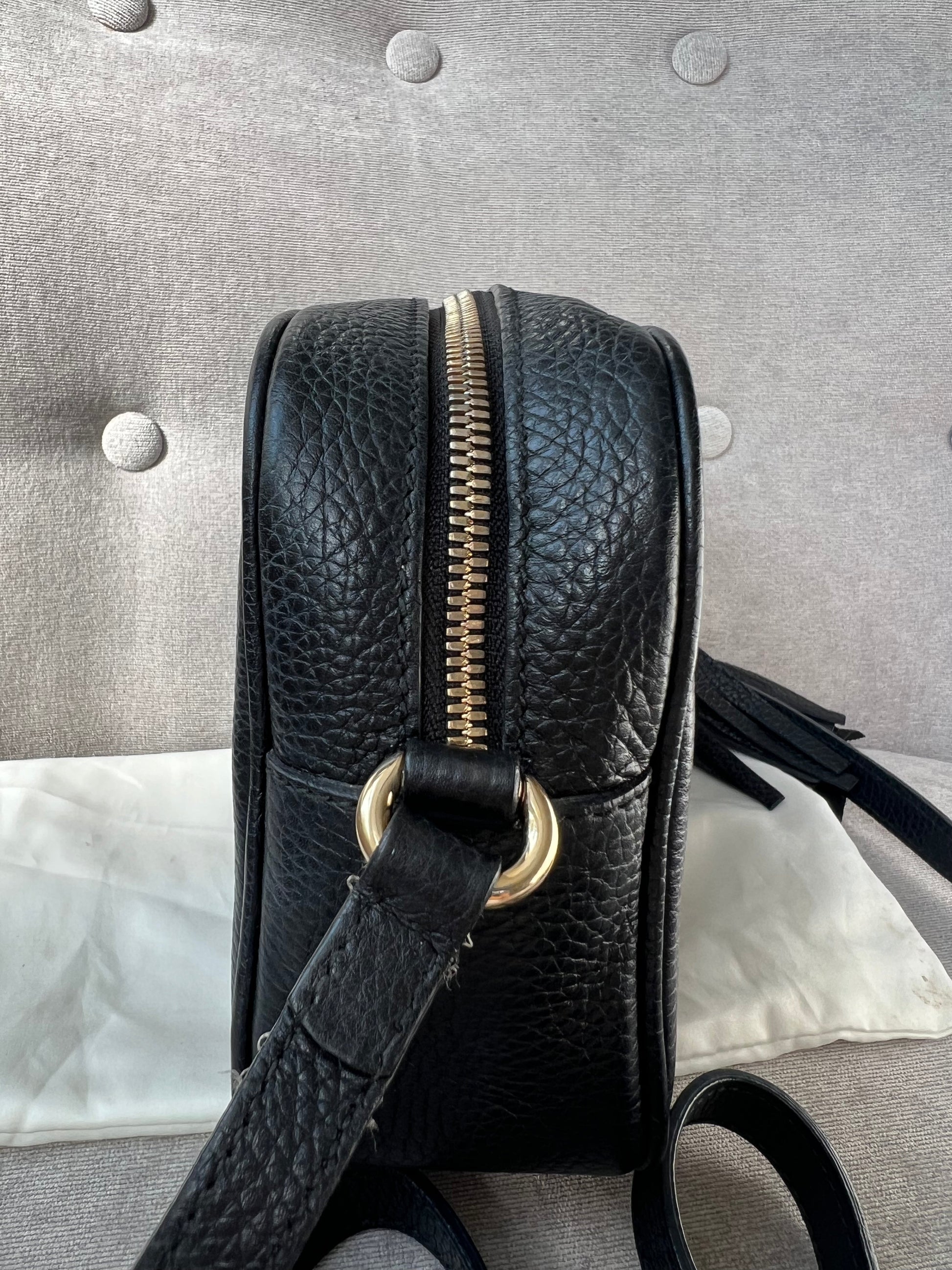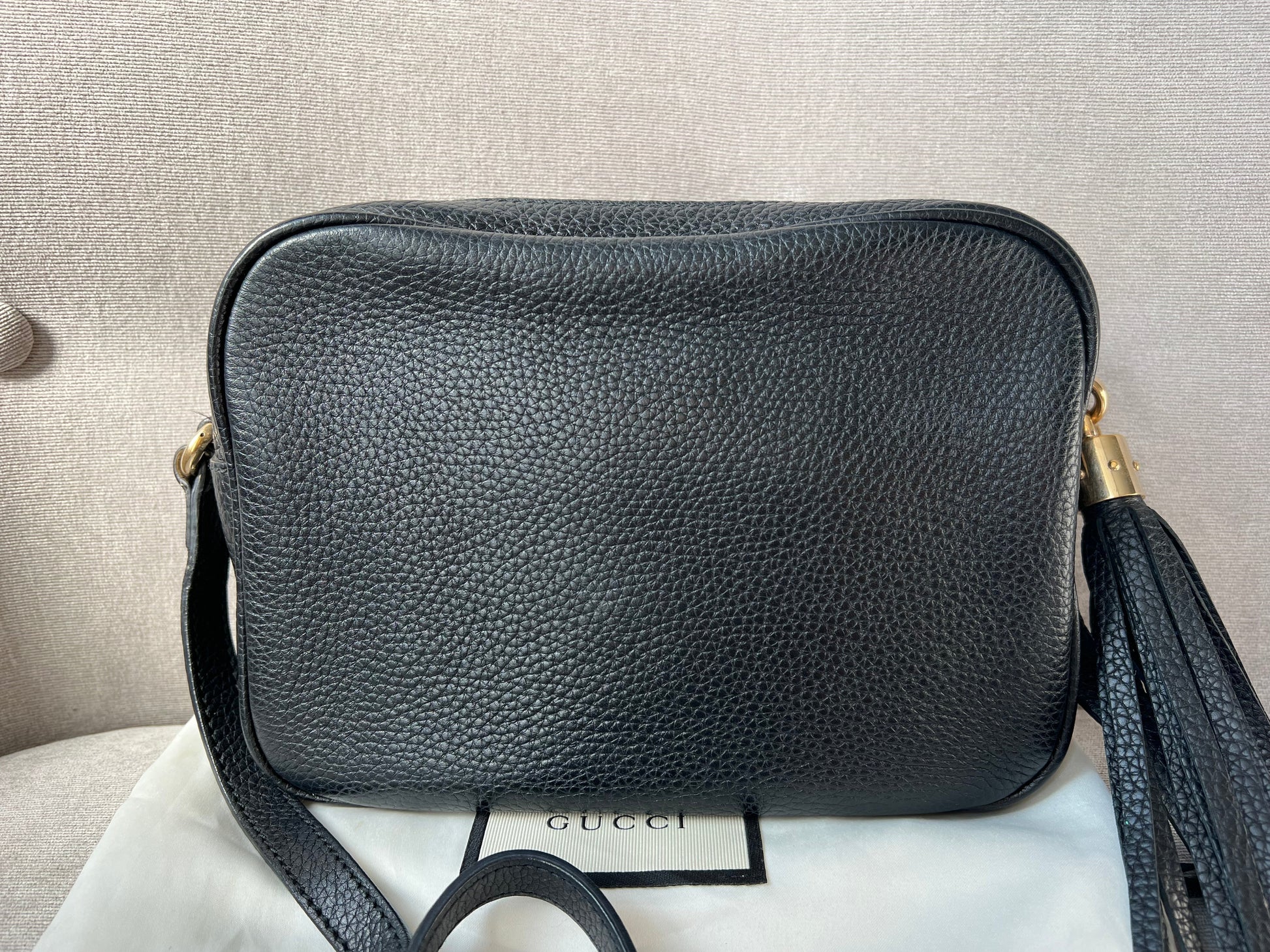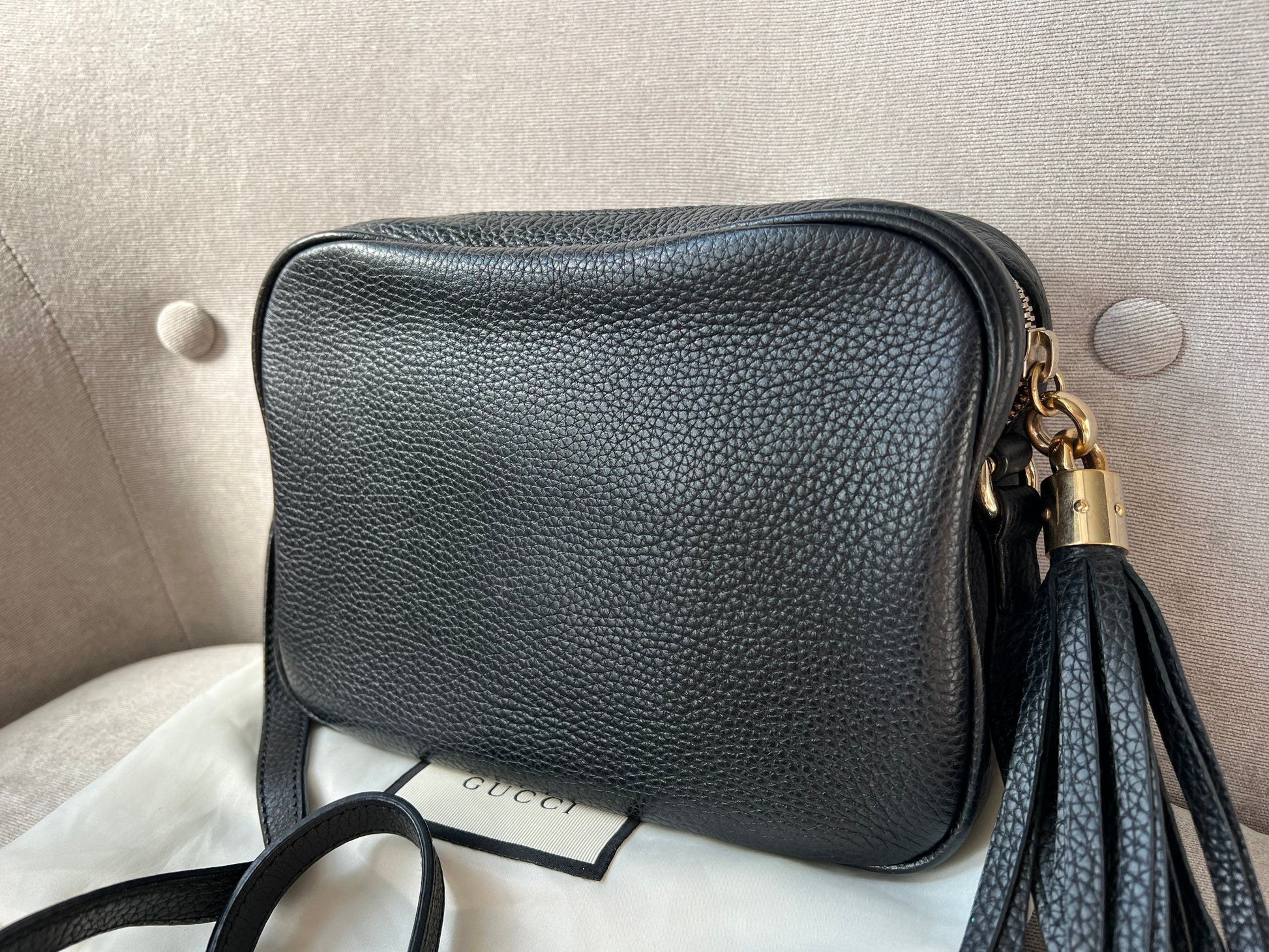 Gucci Soho Disco in Black Leather with pale gold hardware. This practical, cross body, camera style bag is compact in size but still fits a reasonable amount. Can be over shoulder or cross body. Gucci's most popular style and goes with any outfit, dressed up or down.