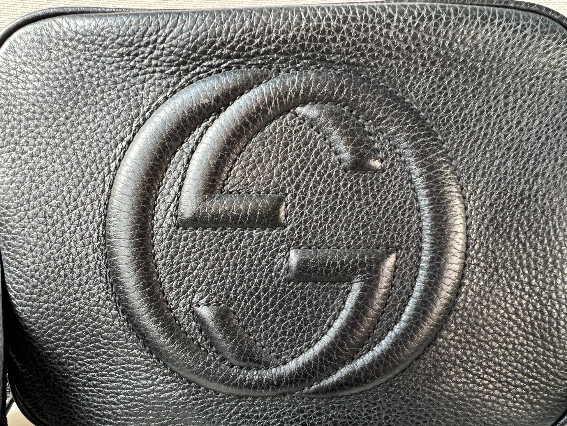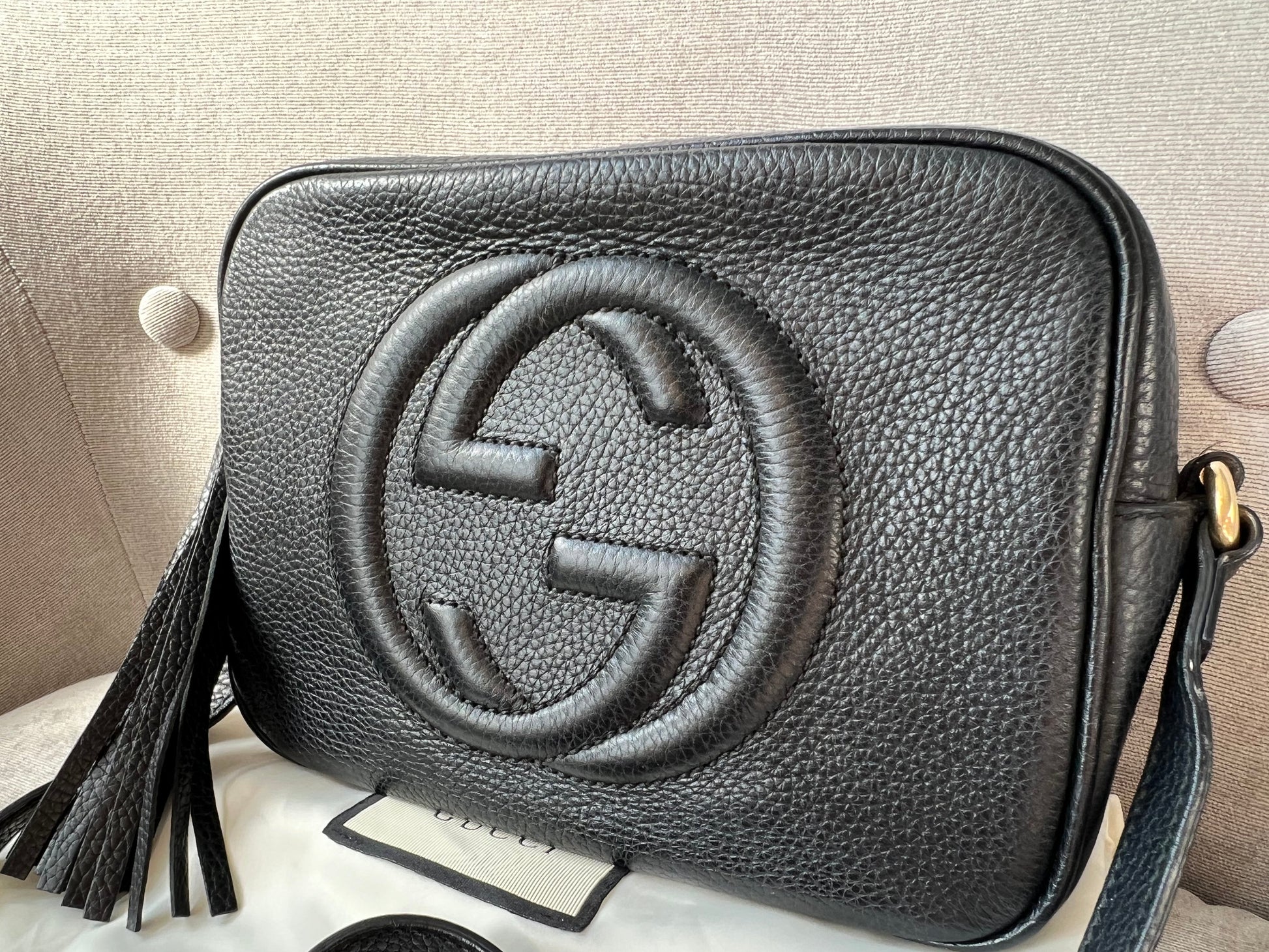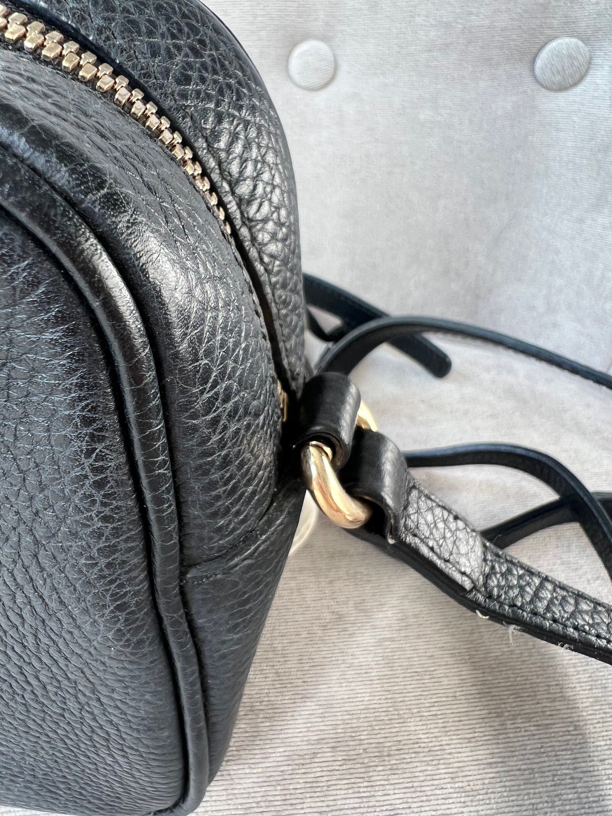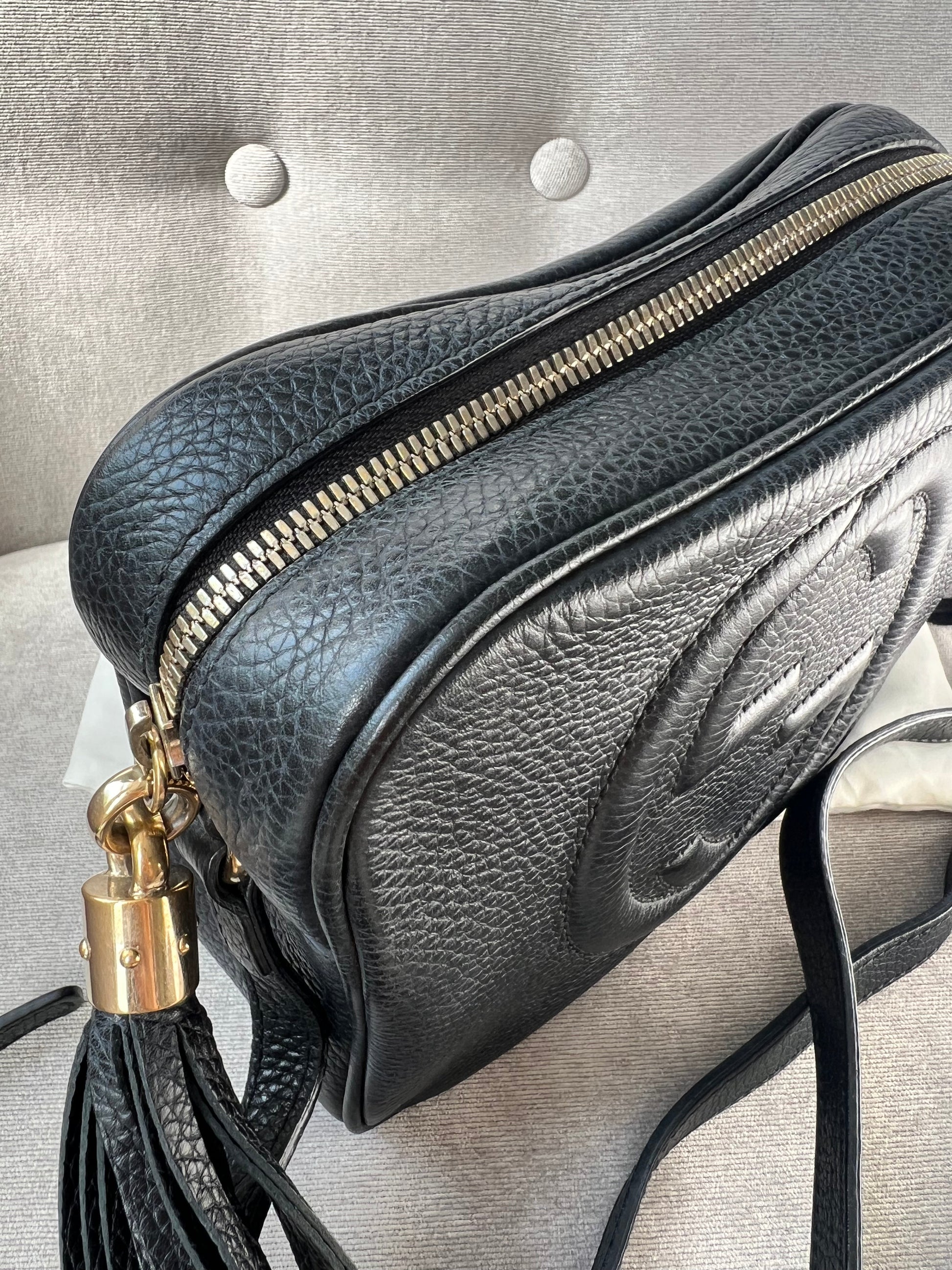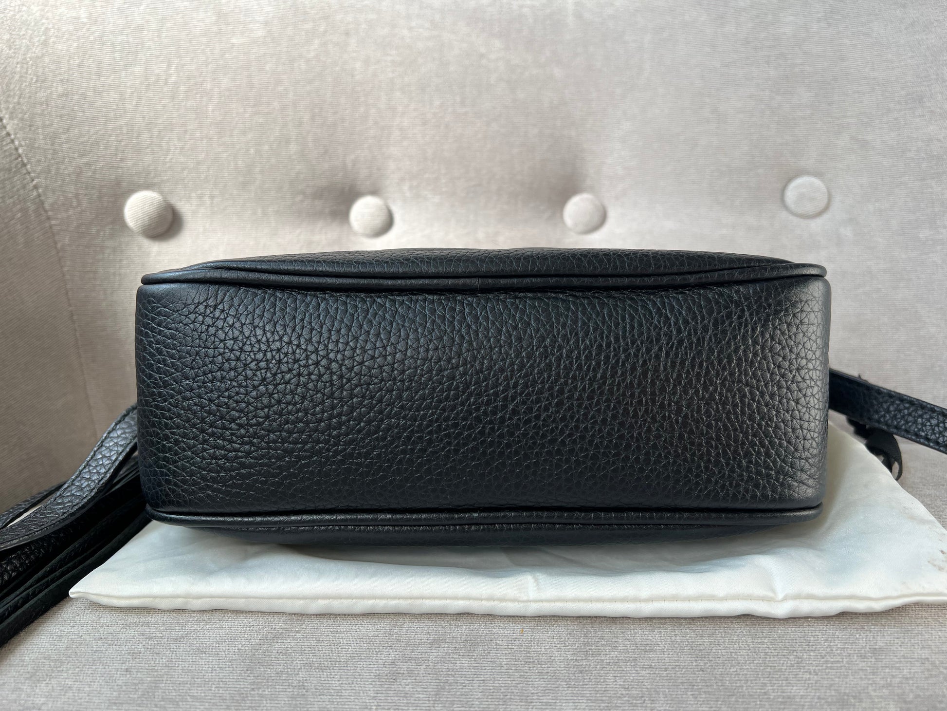 Gucci Soho Disco in Black Leather with pale gold hardware. This practical, cross body, camera style bag is compact in size but still fits a reasonable amount. Can be over shoulder or cross body. Gucci's most popular style and goes with any outfit, dressed up or down.