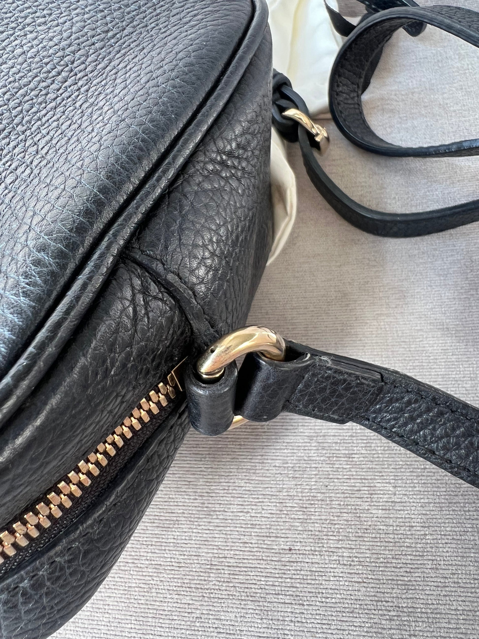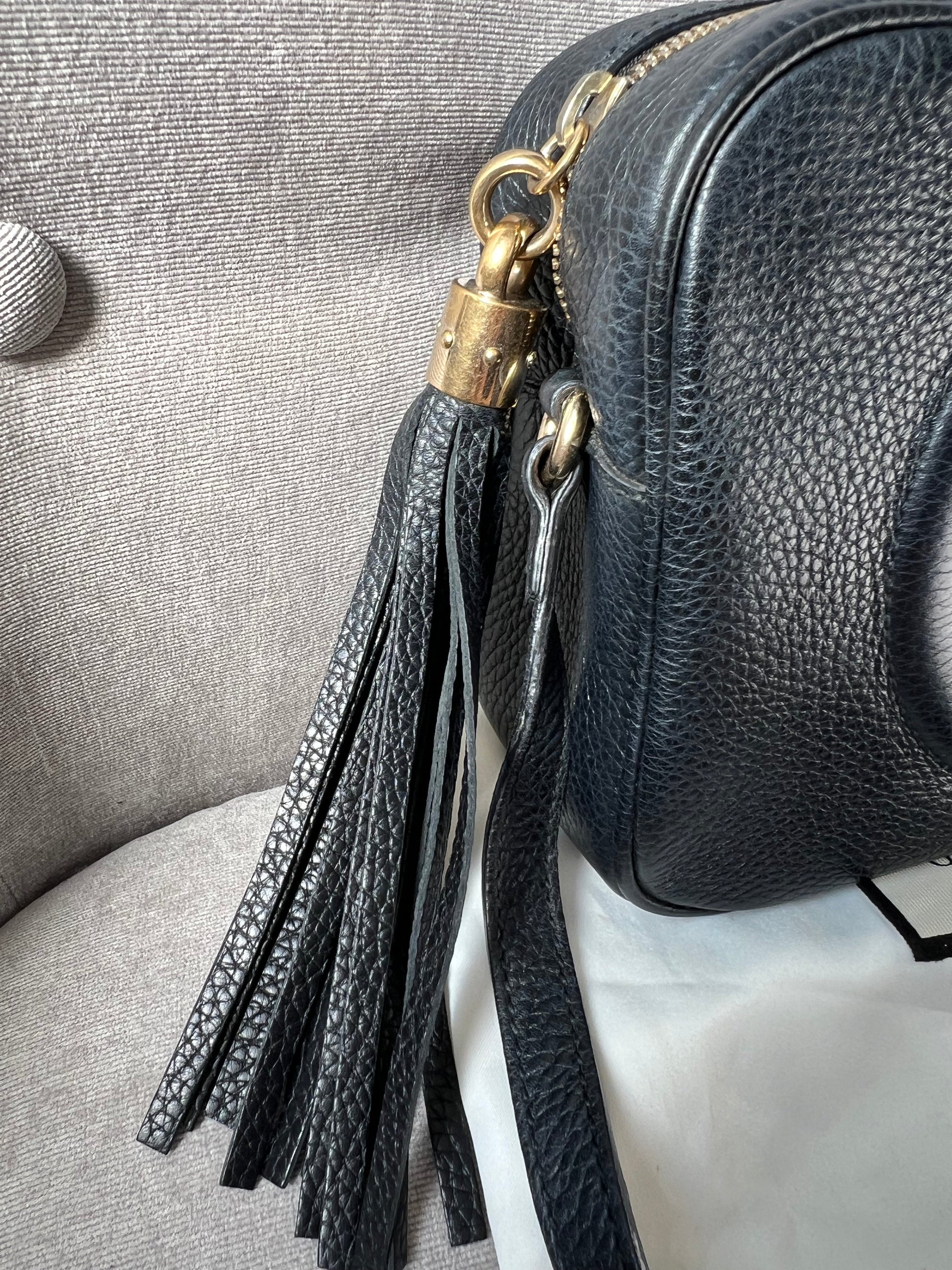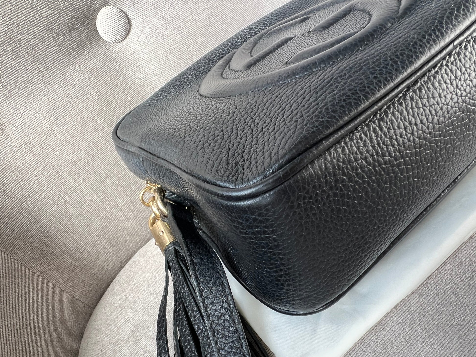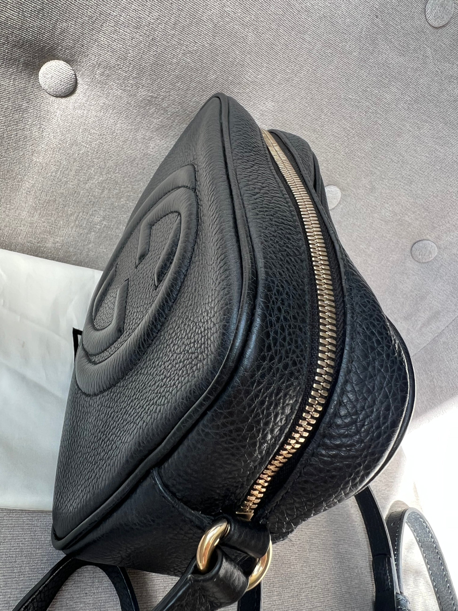 Gucci Soho Disco in Black Leather with pale gold hardware. This practical, cross body, camera style bag is compact in size but still fits a reasonable amount. Can be over shoulder or cross body. Gucci's most popular style and goes with any outfit, dressed up or down.