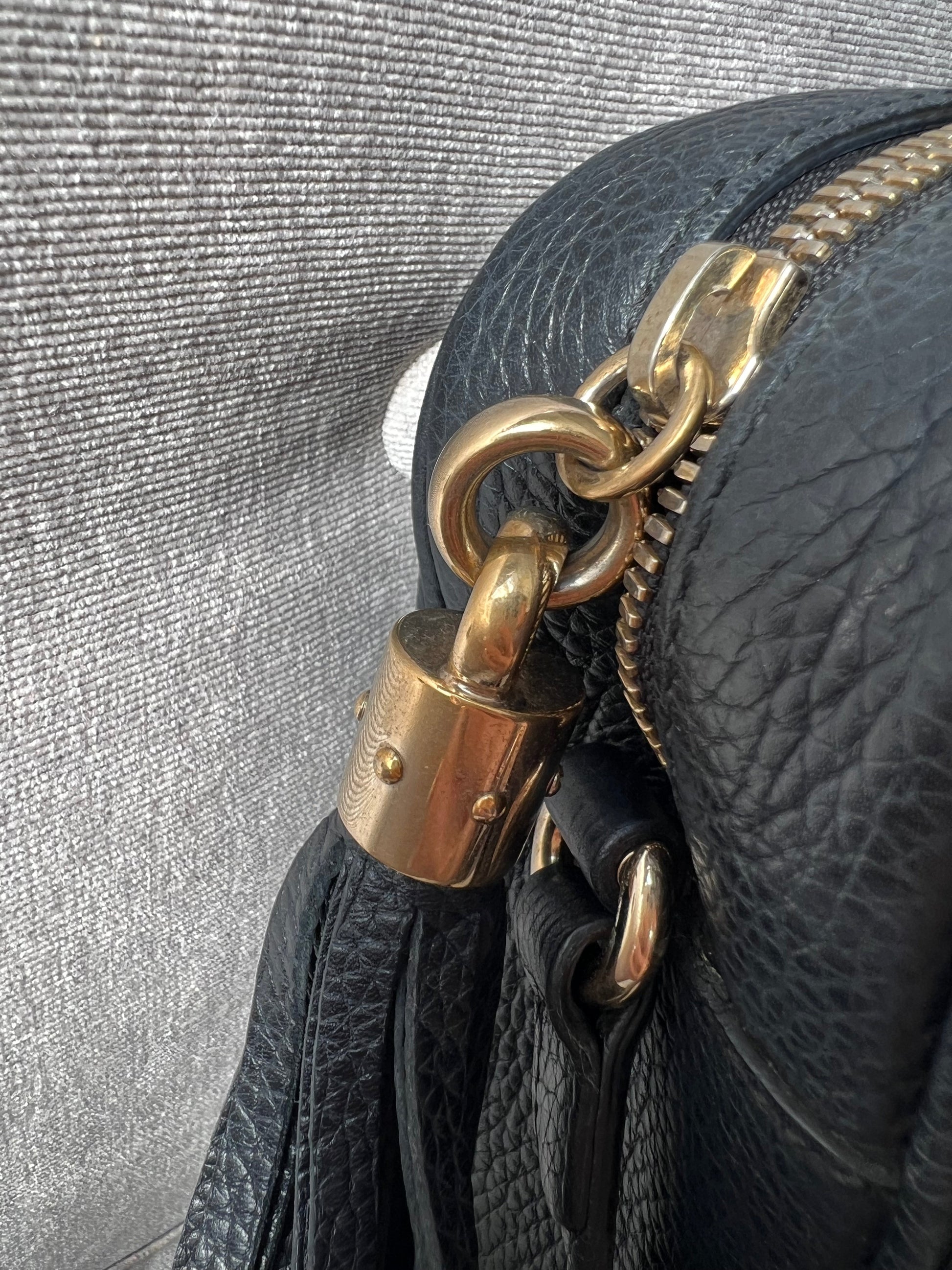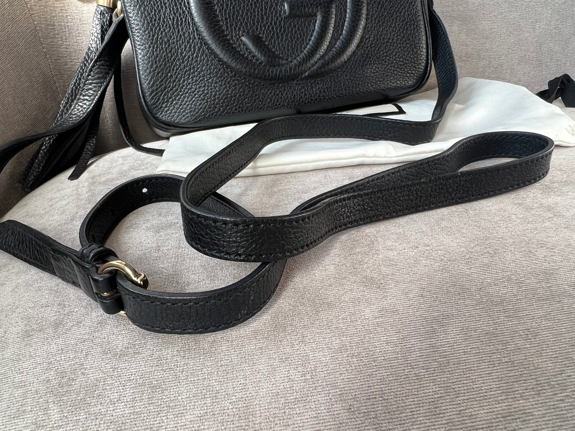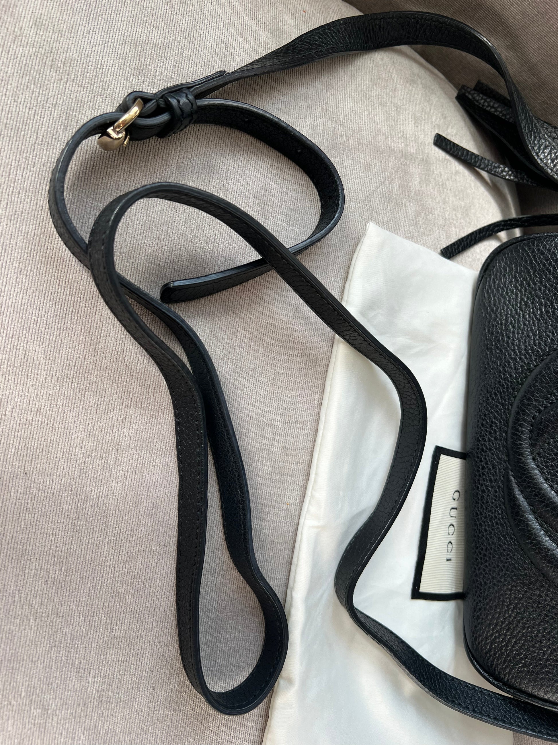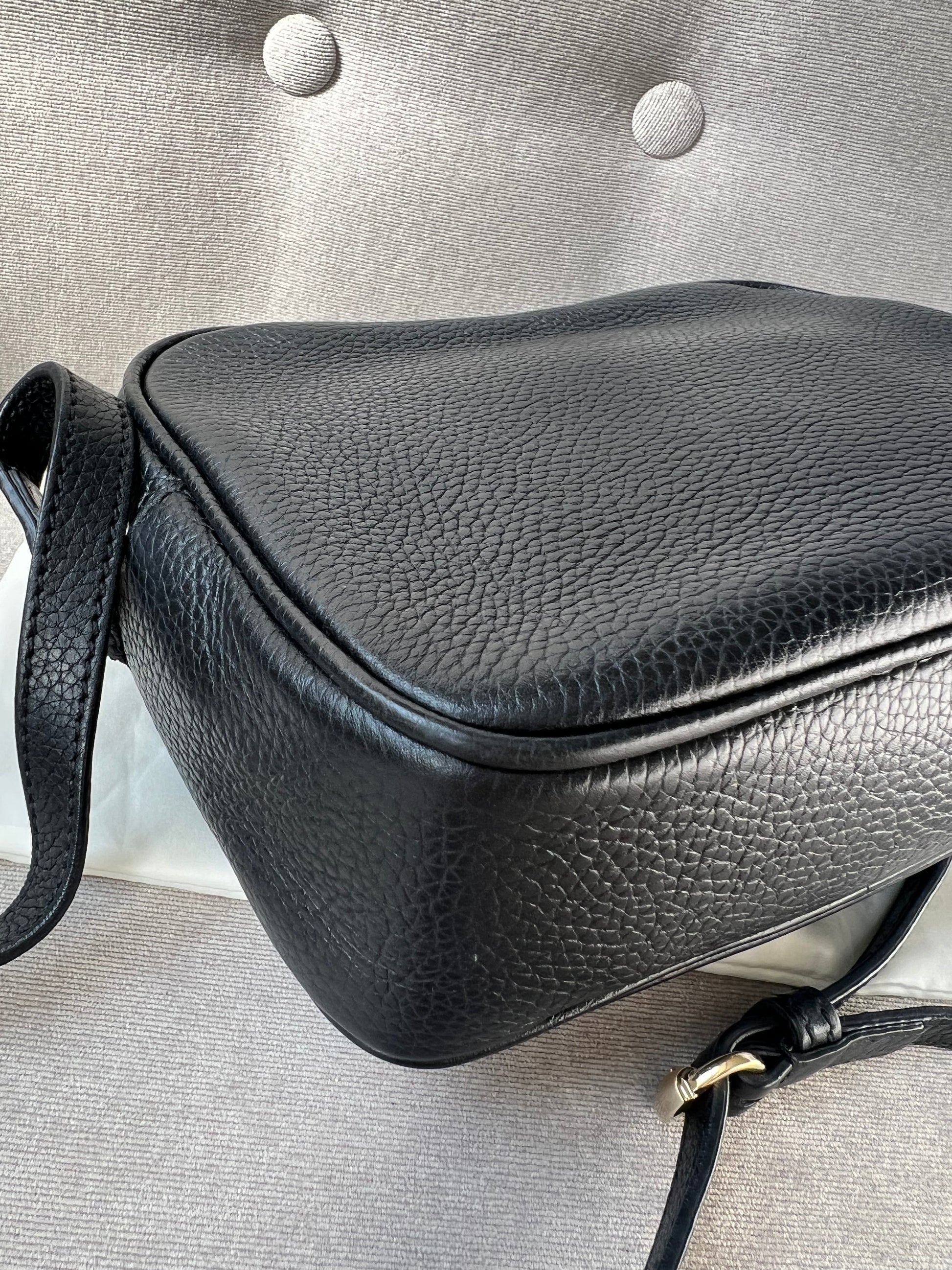 Gucci Soho Disco in Black Leather with pale gold hardware. This practical, cross body, camera style bag is compact in size but still fits a reasonable amount. Can be over shoulder or cross body. Gucci's most popular style and goes with any outfit, dressed up or down.