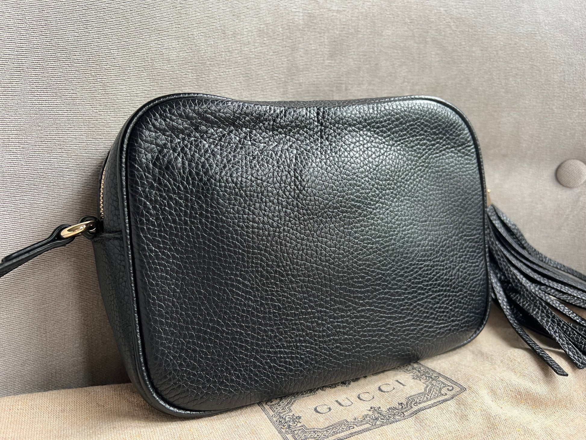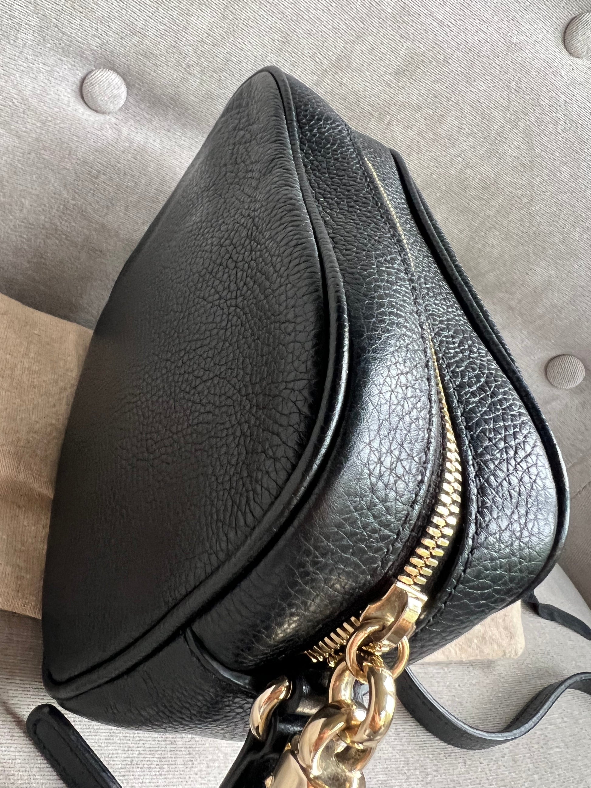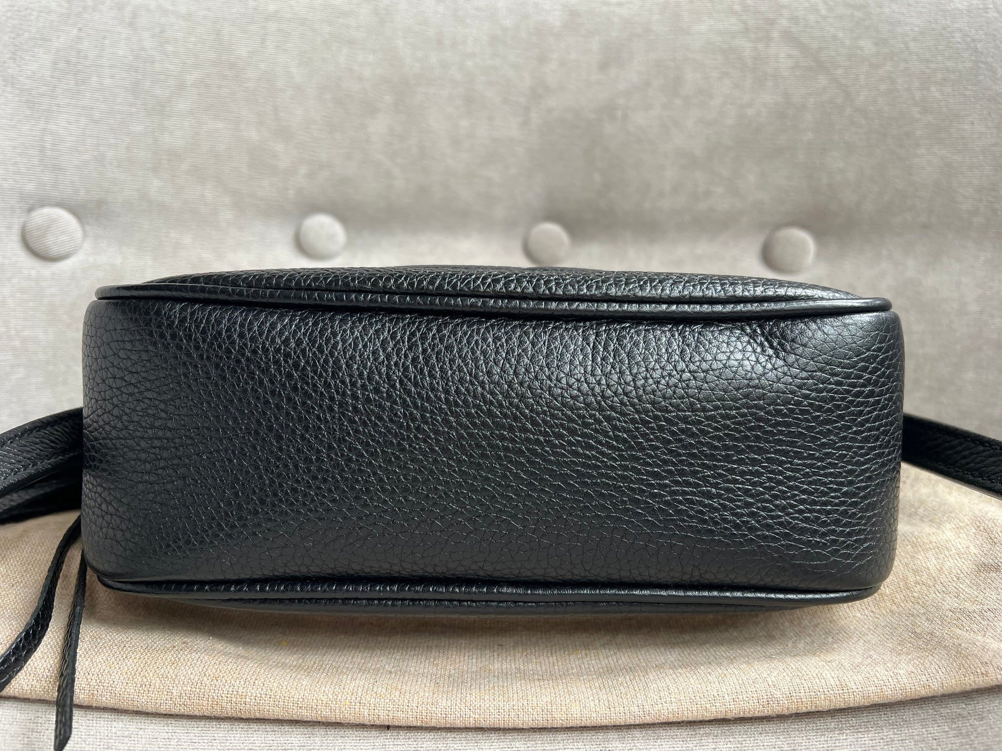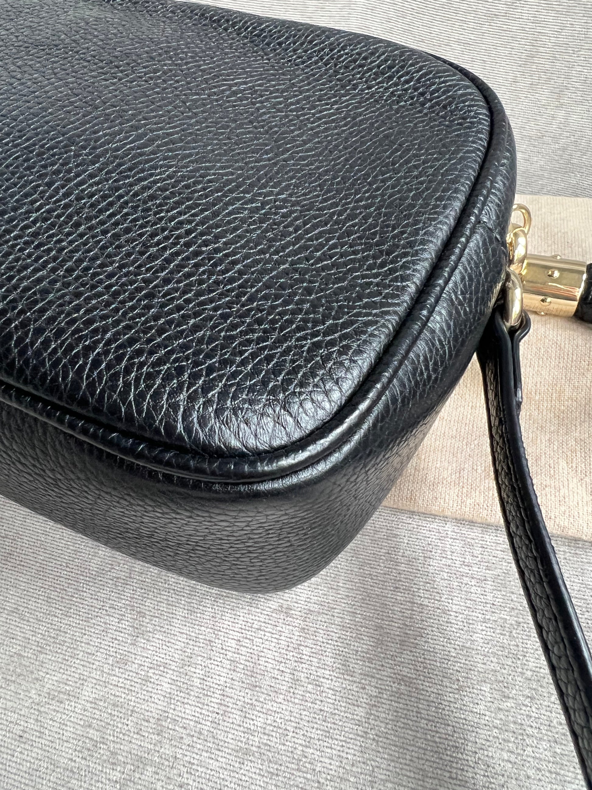 Gucci Soho Disco in Black Leather with pale gold hardware. This practical, cross body, camera style bag is compact in size but still fits a reasonable amount. Can be over shoulder or cross body. Gucci's most popular style and goes with any outfit, dressed up or down.