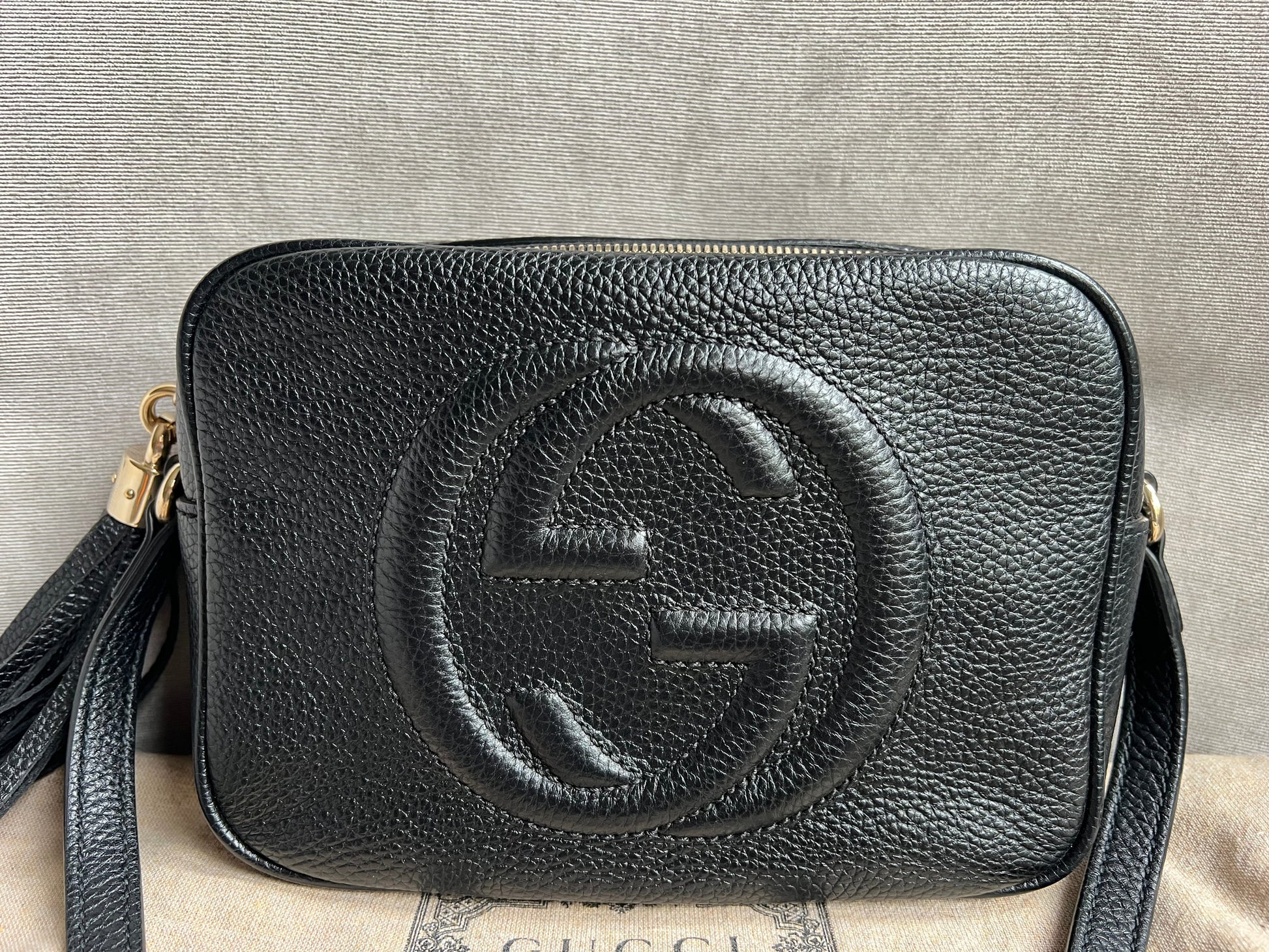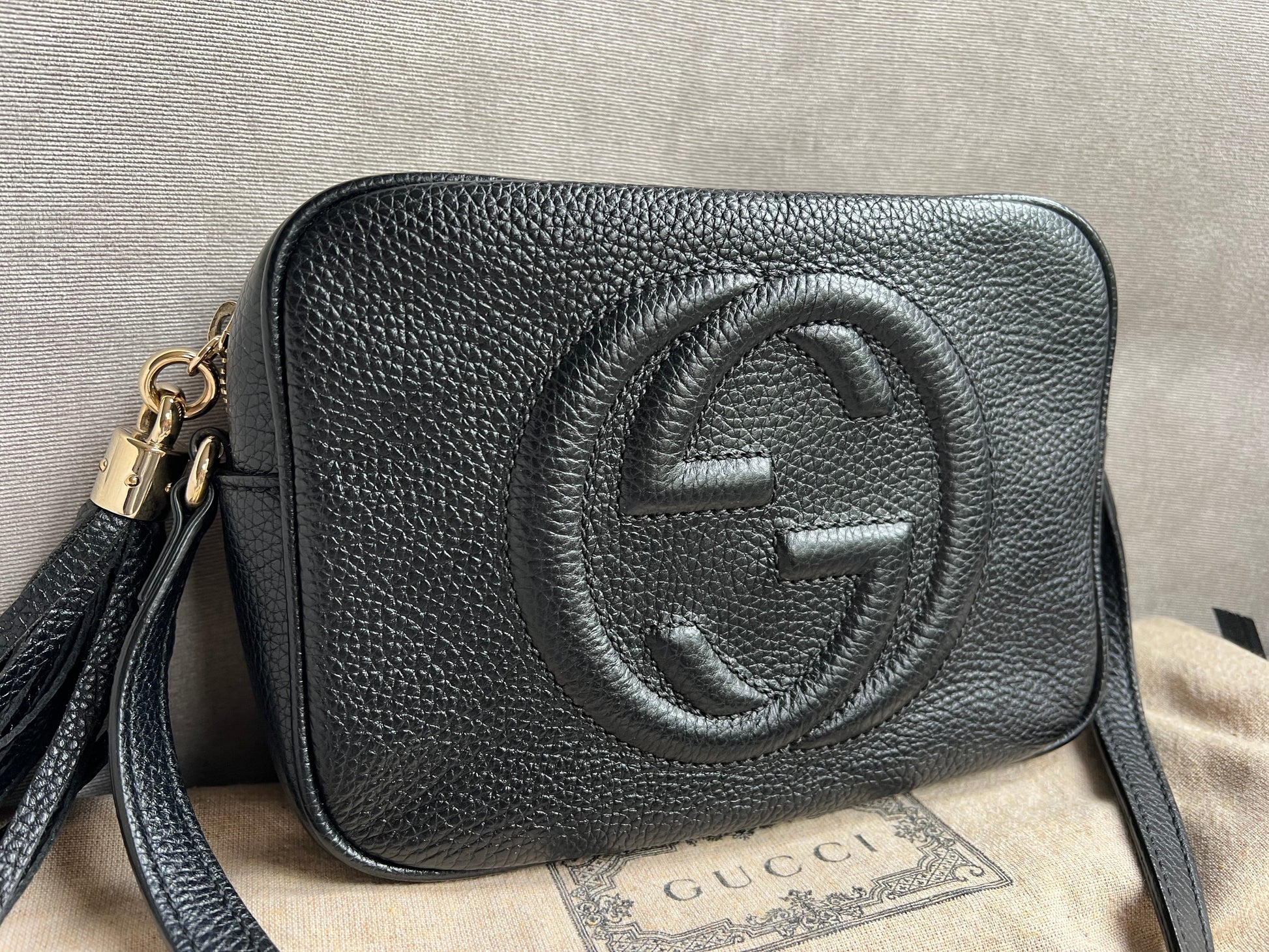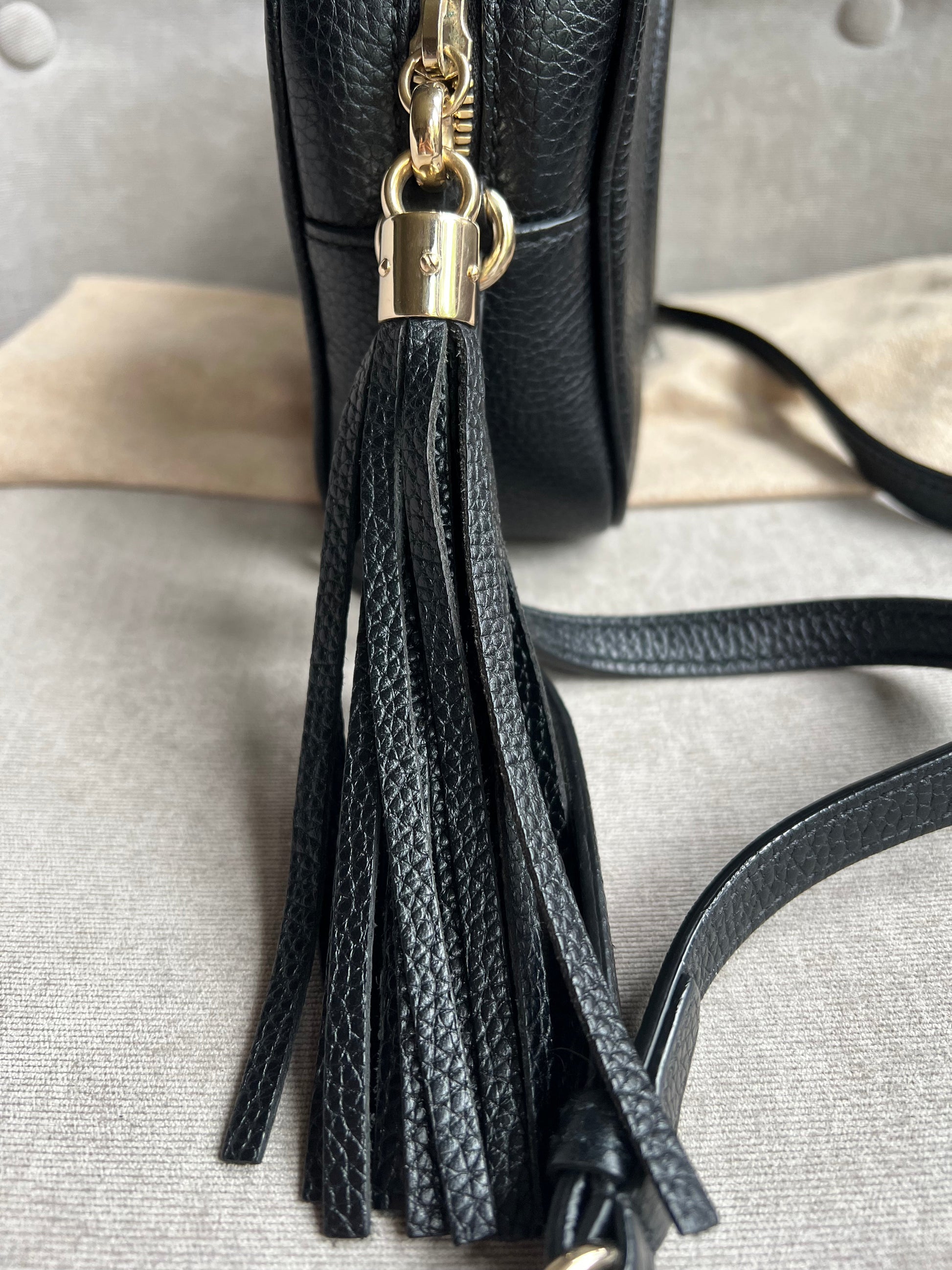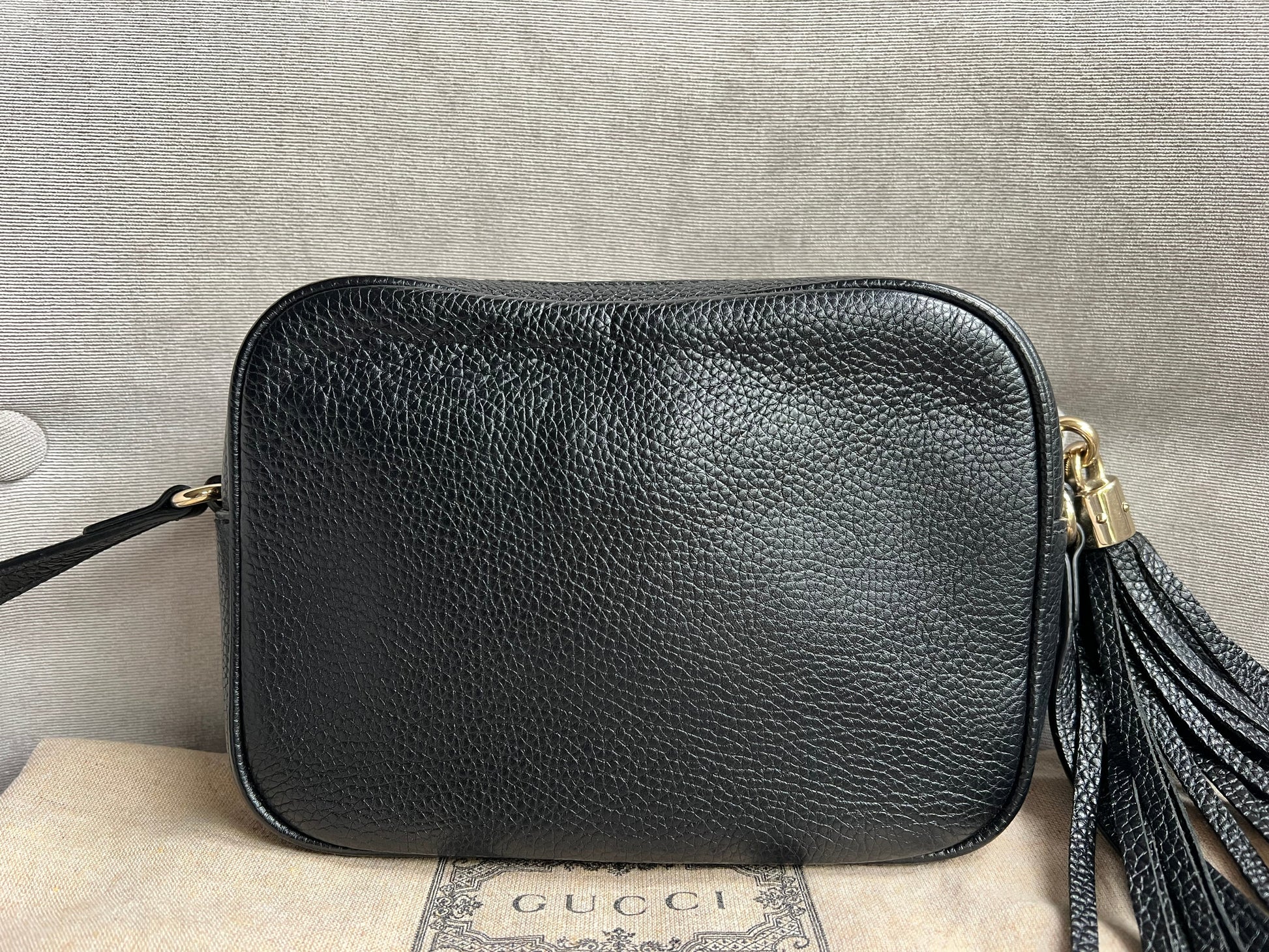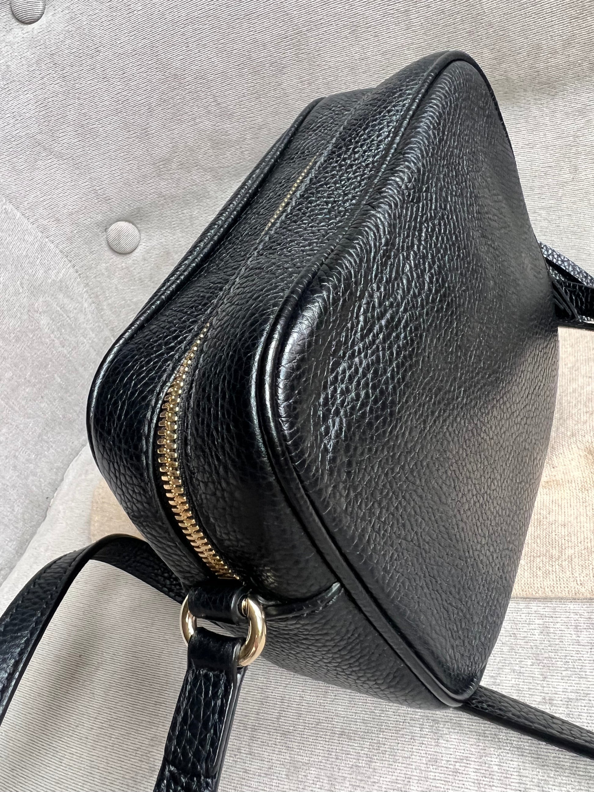 Gucci Soho Disco in Black Leather with pale gold hardware. This practical, cross body, camera style bag is compact in size but still fits a reasonable amount. Can be over shoulder or cross body. Gucci's most popular style and goes with any outfit, dressed up or down.