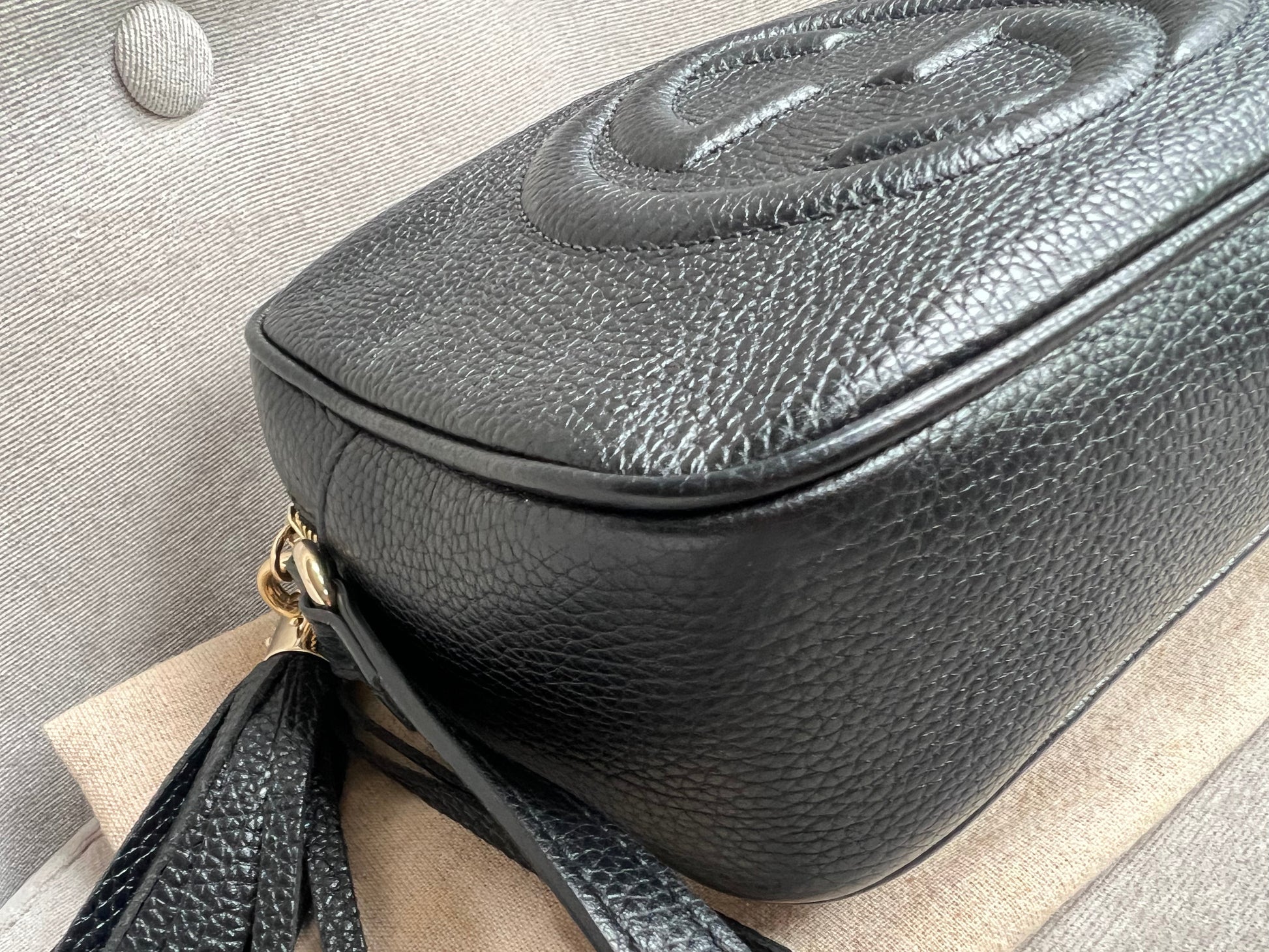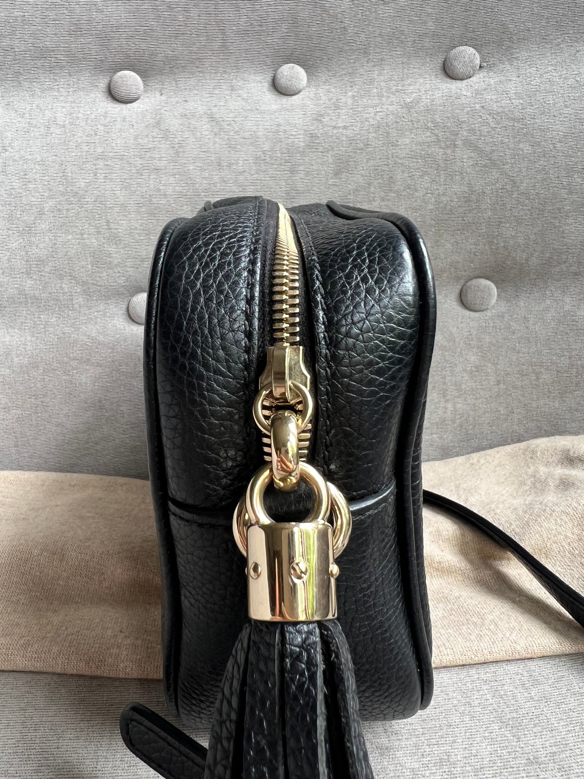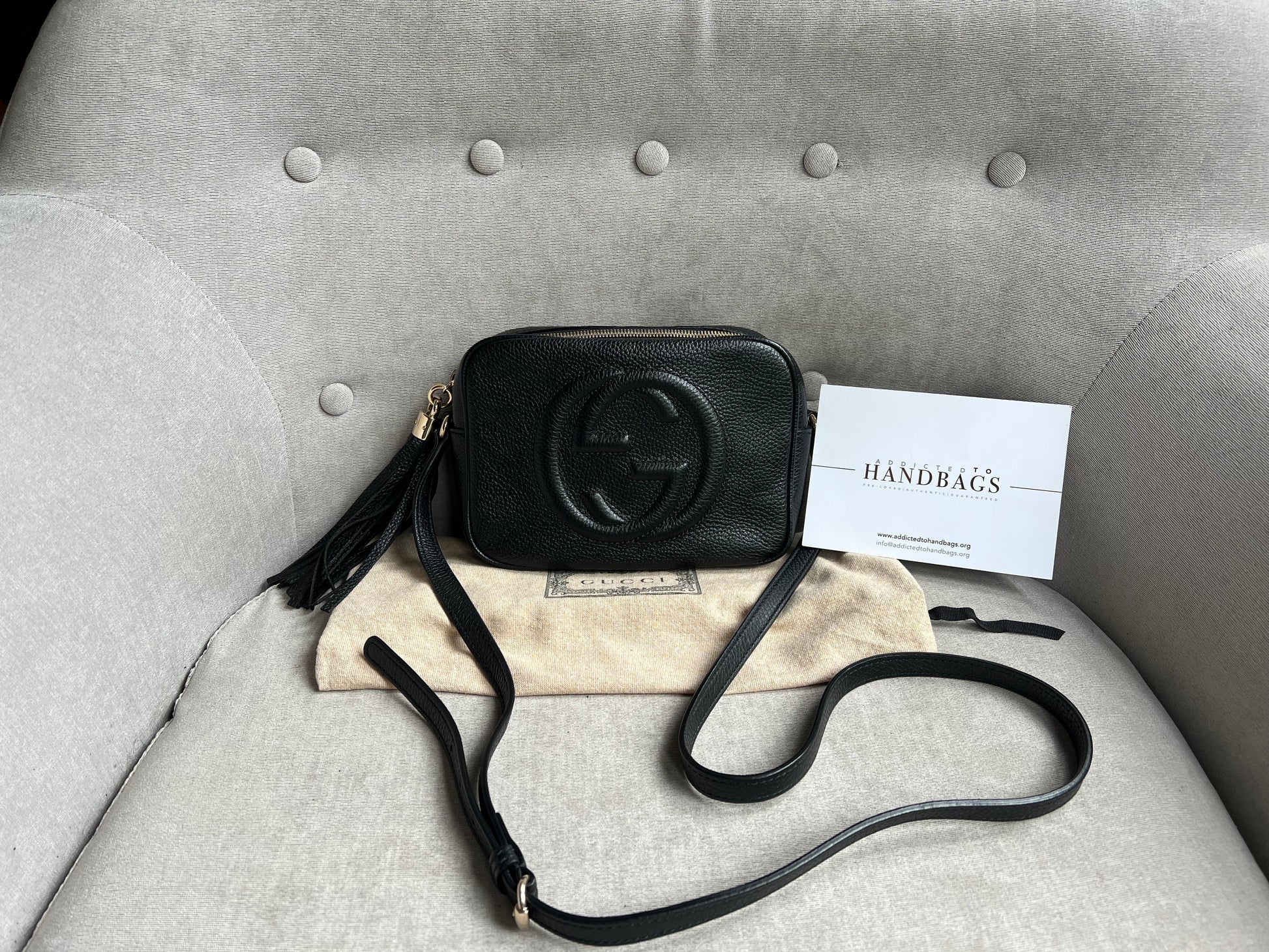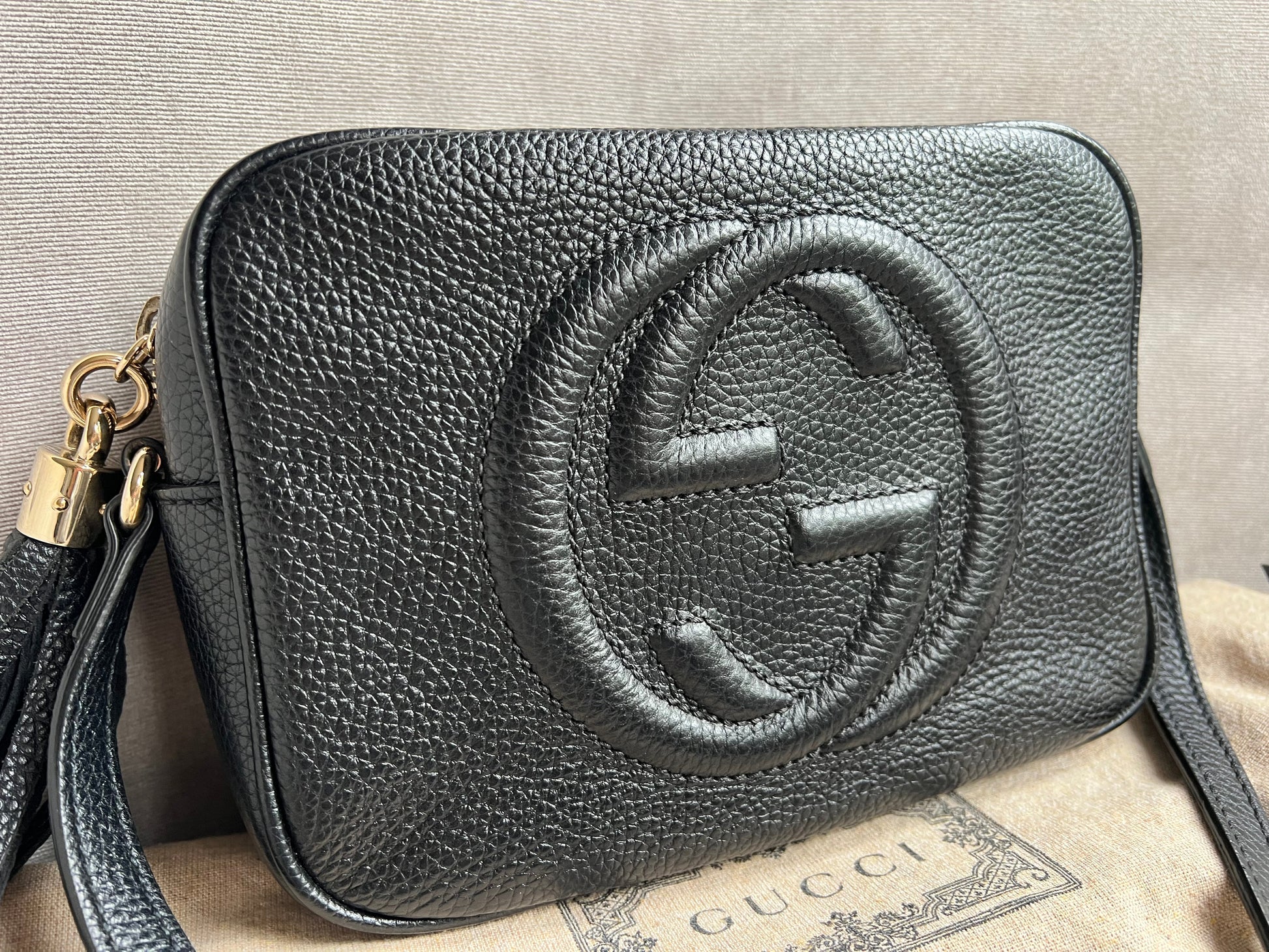 Gucci Soho Disco in Black Leather with pale gold hardware. This practical, cross body, camera style bag is compact in size but still fits a reasonable amount. Can be over shoulder or cross body. Gucci's most popular style and goes with any outfit, dressed up or down.