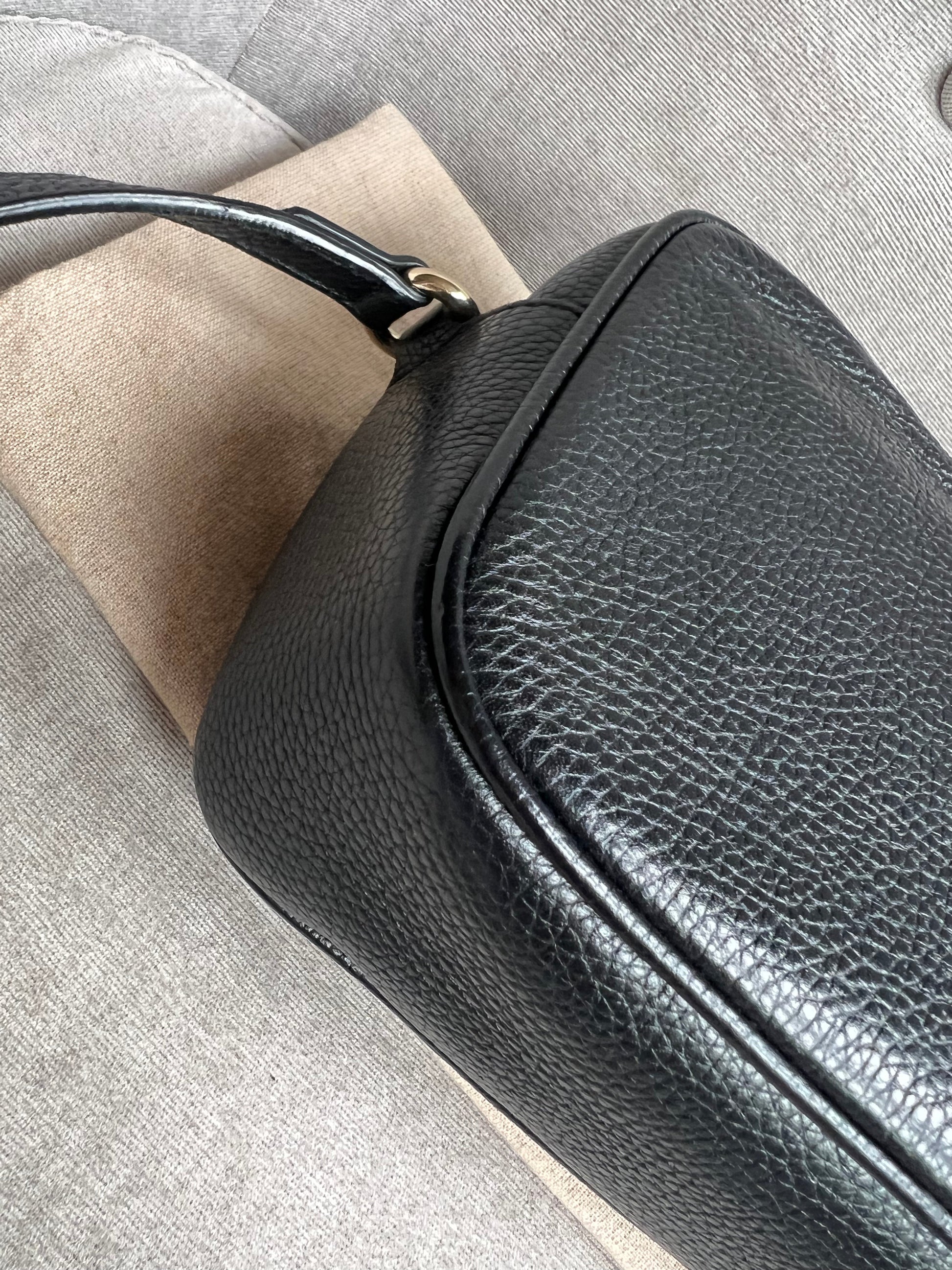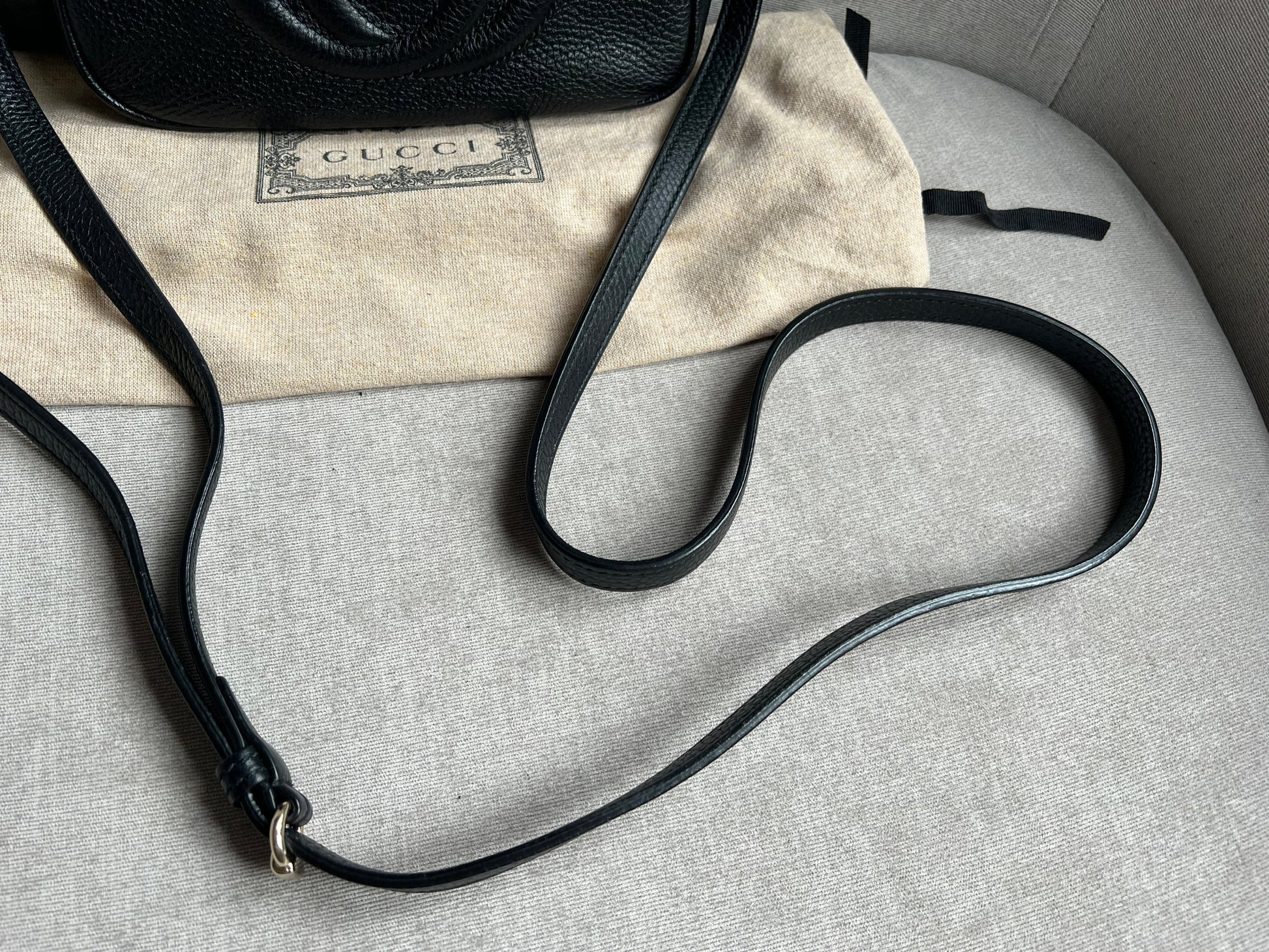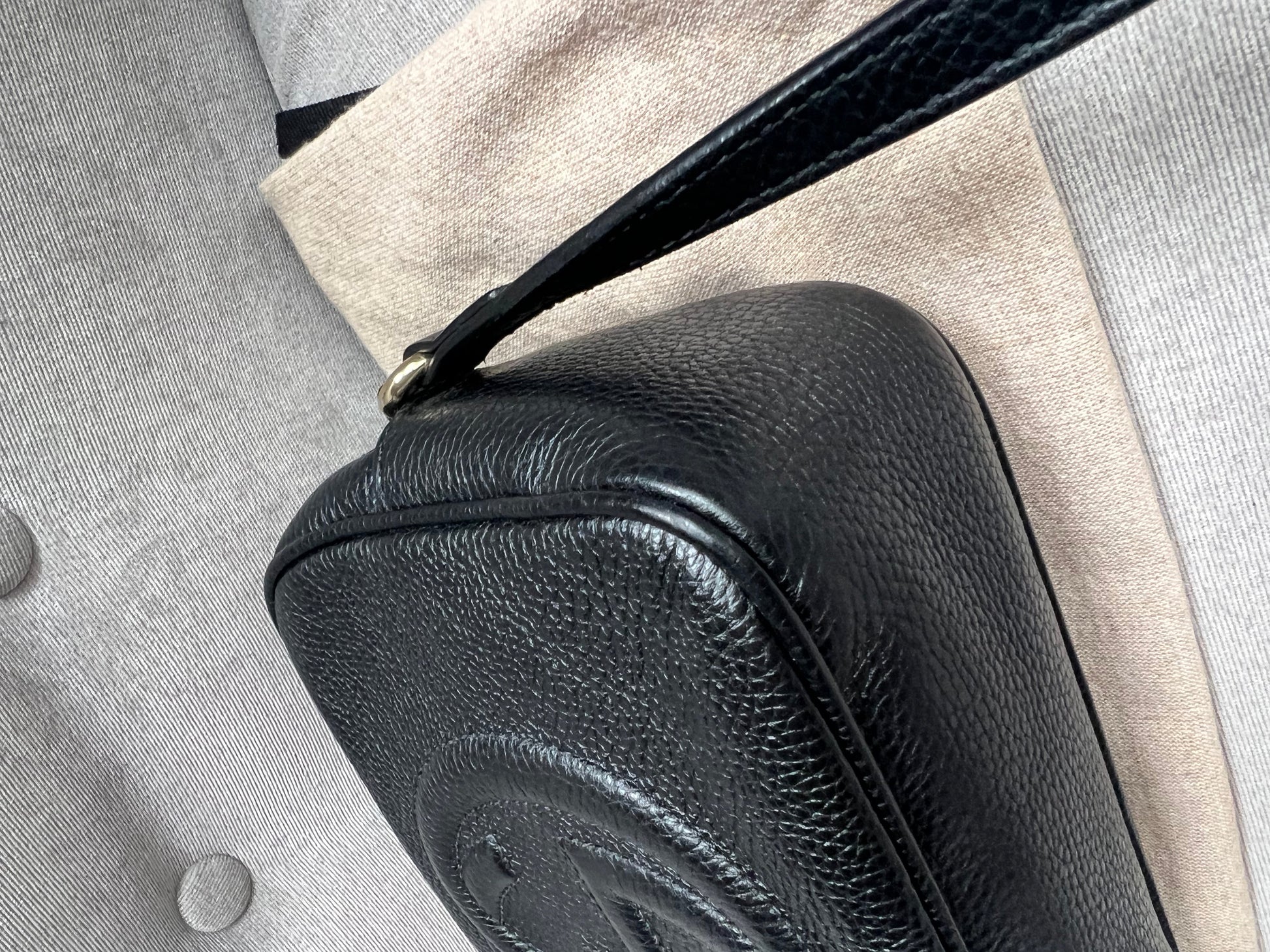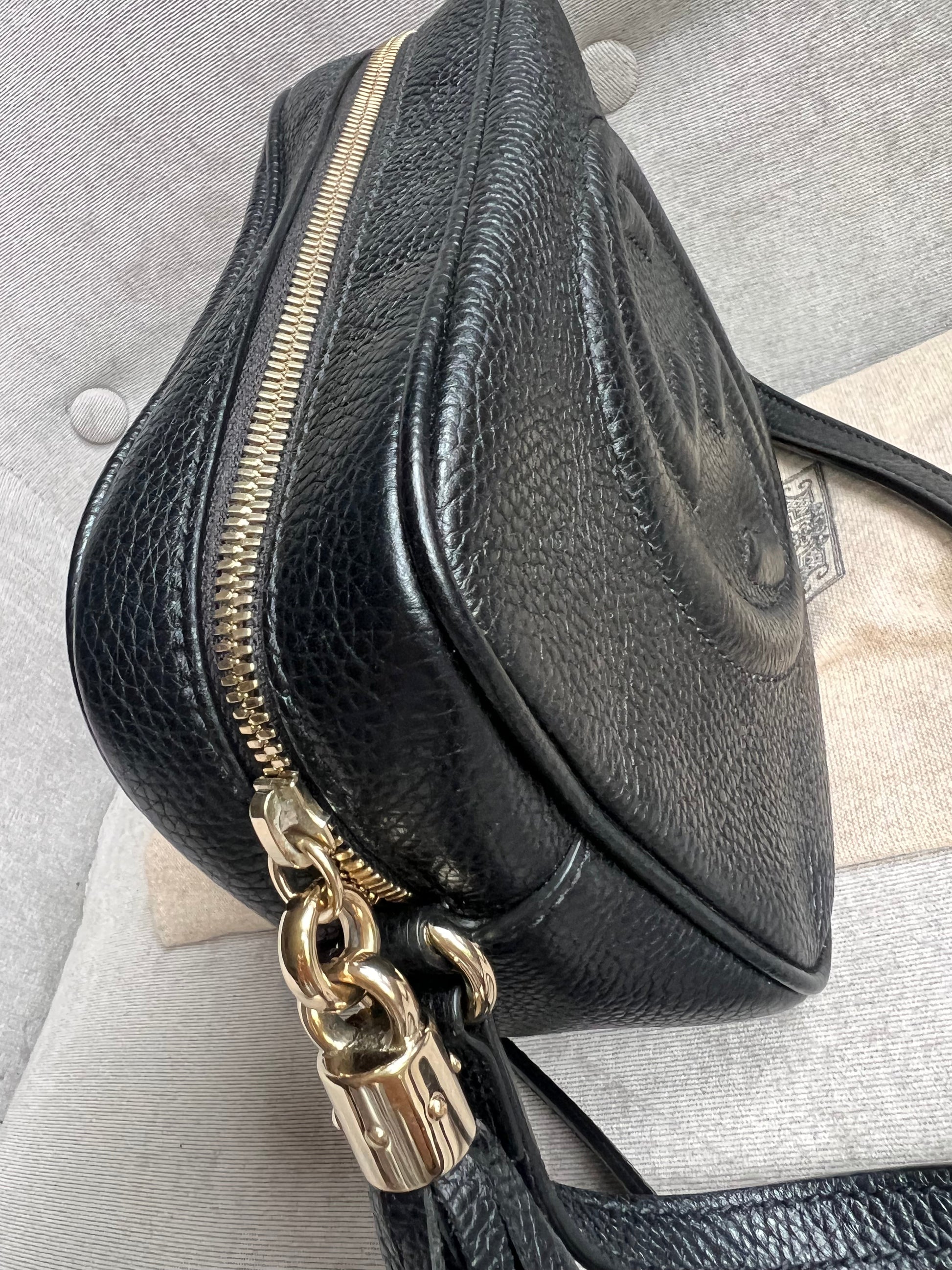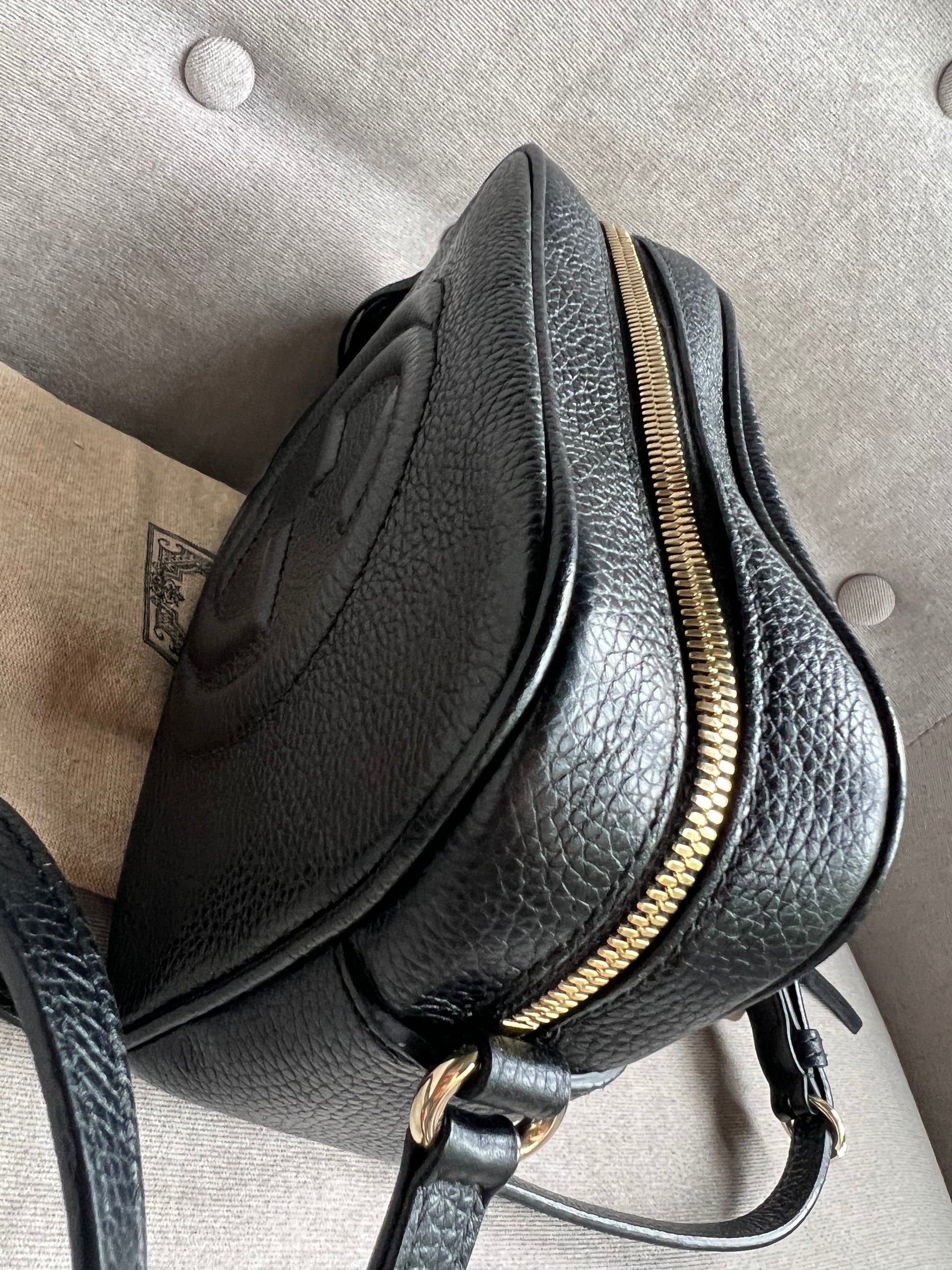 Gucci Soho Disco in Black Leather with pale gold hardware. This practical, cross body, camera style bag is compact in size but still fits a reasonable amount. Can be over shoulder or cross body. Gucci's most popular style and goes with any outfit, dressed up or down.